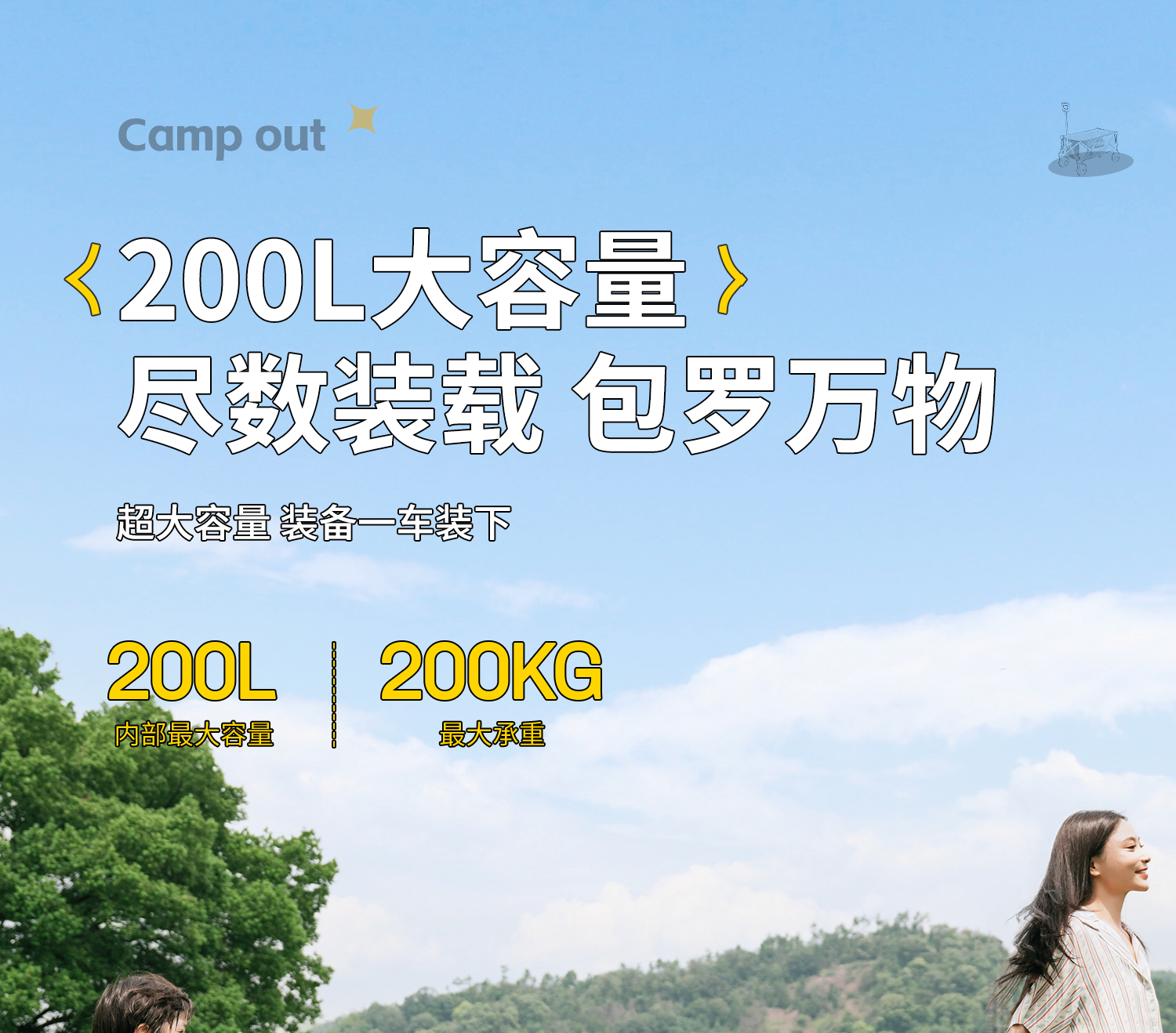 • 캠핑 패키지: 대형 충격 흡수 휠 + 옵시디언 블랙 + 옵시디언 블랙 올 스틸 테이블 + 의자 * 2♢
