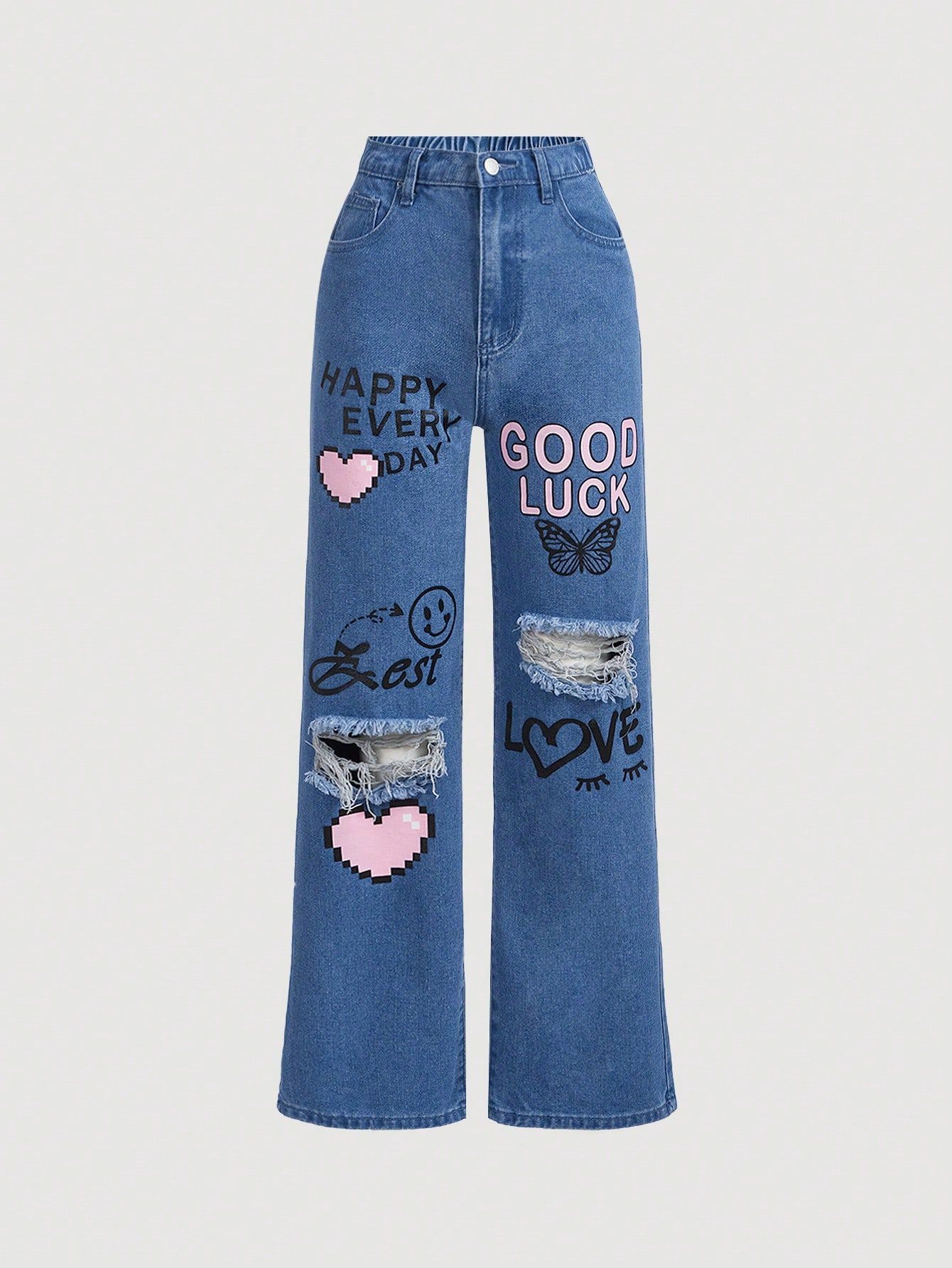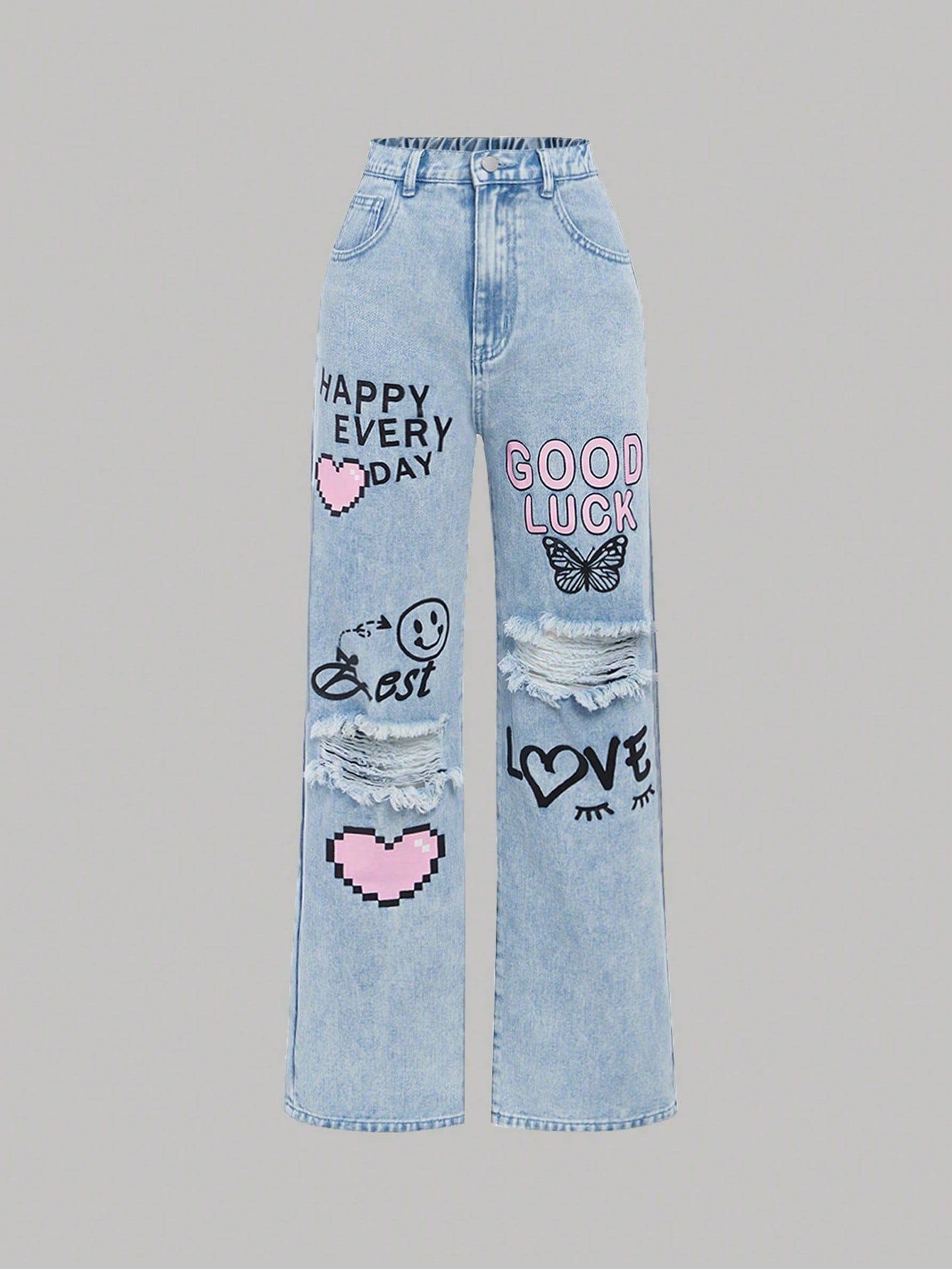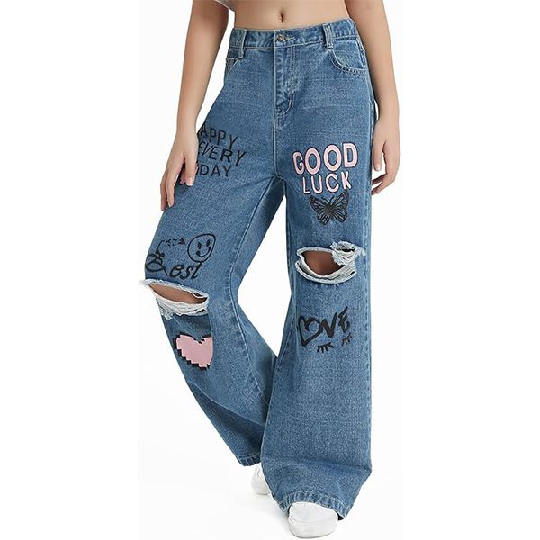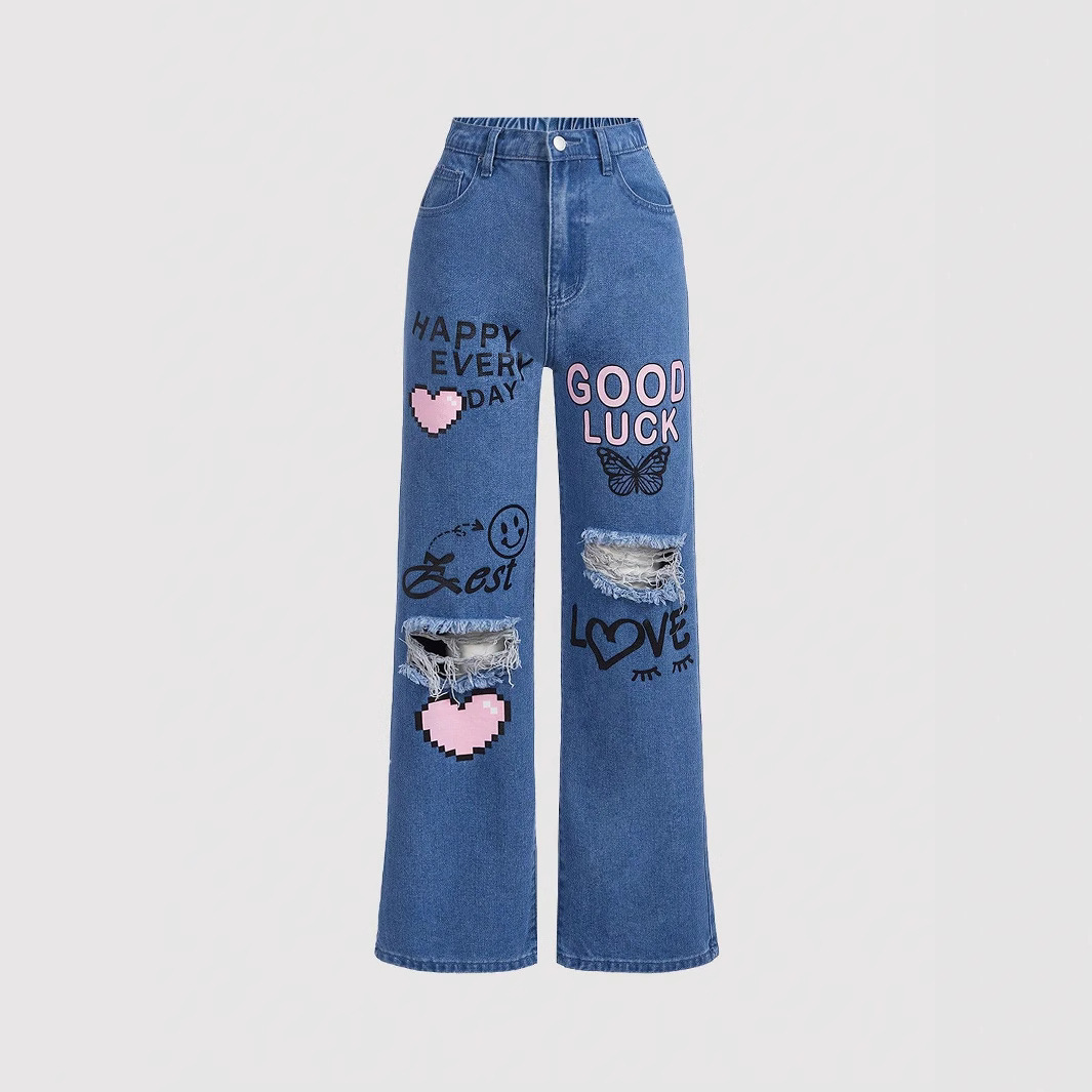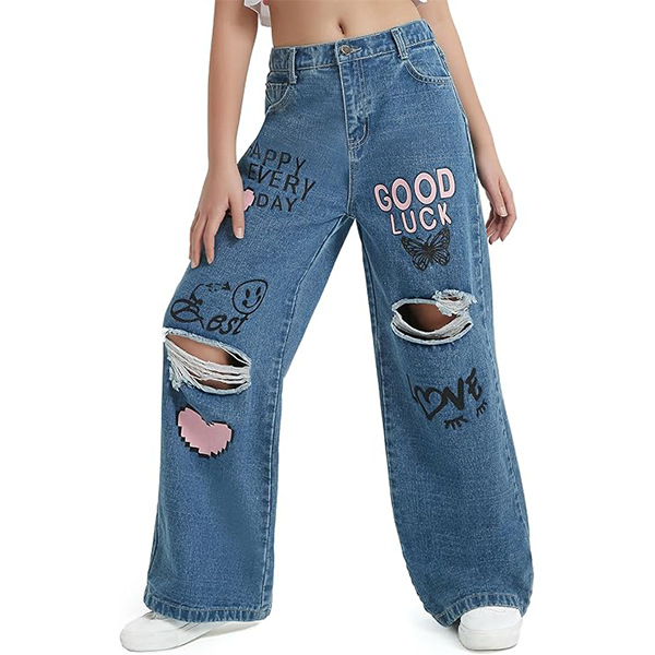 아마존 중다이 어린이 낙서 새로운 틈새 넓은 다리 바지 미국 패션 브랜드 어린이 청바지 긴 바지 넓은 다리 빈티지스토어 가기