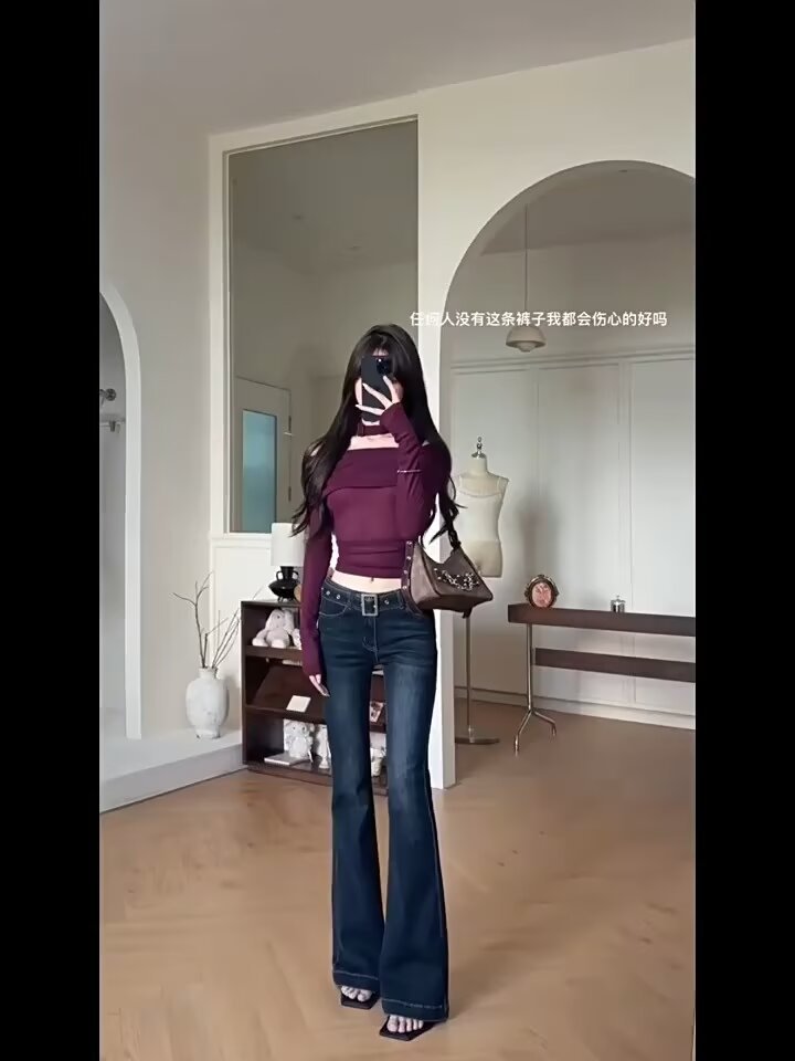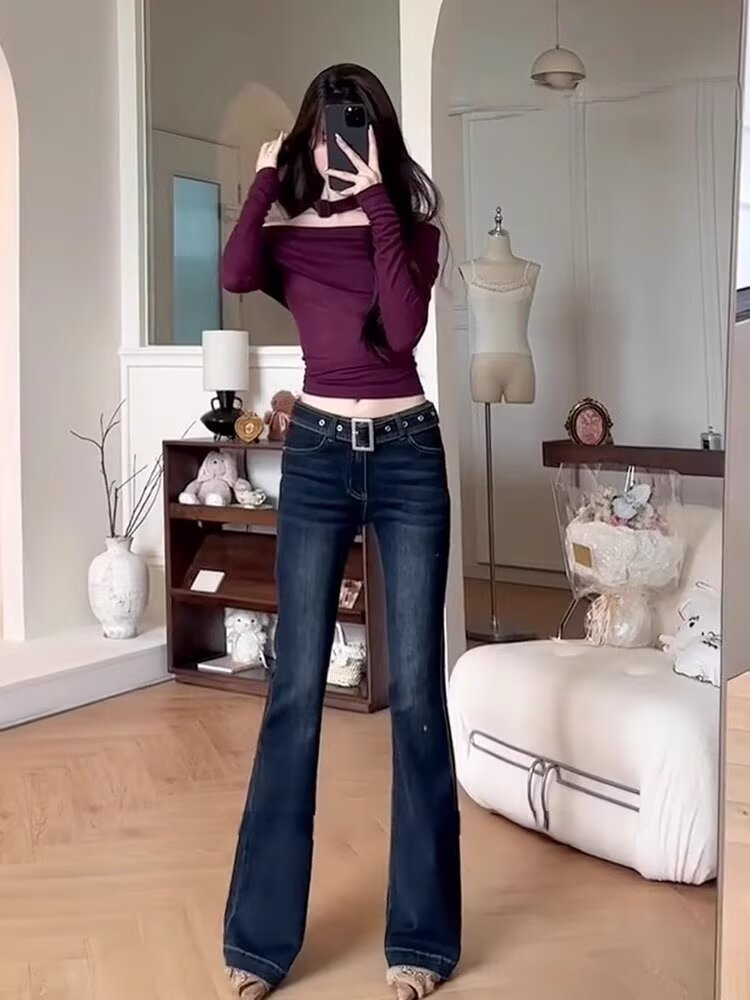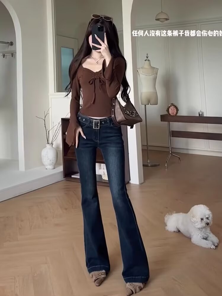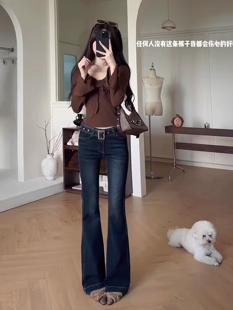 아메리칸 스타일 레트로 다크 블루 높은 허리 사이즈백 청바지 여성 한국 스타일 유행 슬림-맞는 스트레이트 스트레치 파이프 플라 드 바지스토어 가기