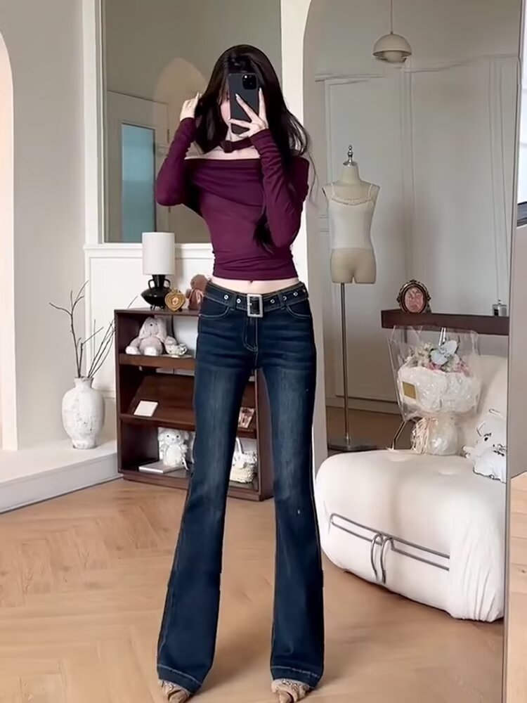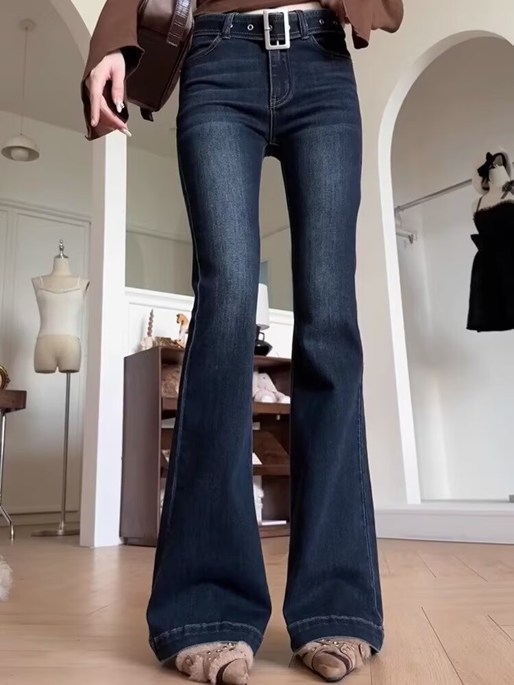 아메리칸 스타일 레트로 다크 블루 높은 허리 사이즈백 청바지 여성 한국 스타일 유행 슬림-맞는 스트레이트 스트레치 파이프 플라 드 바지