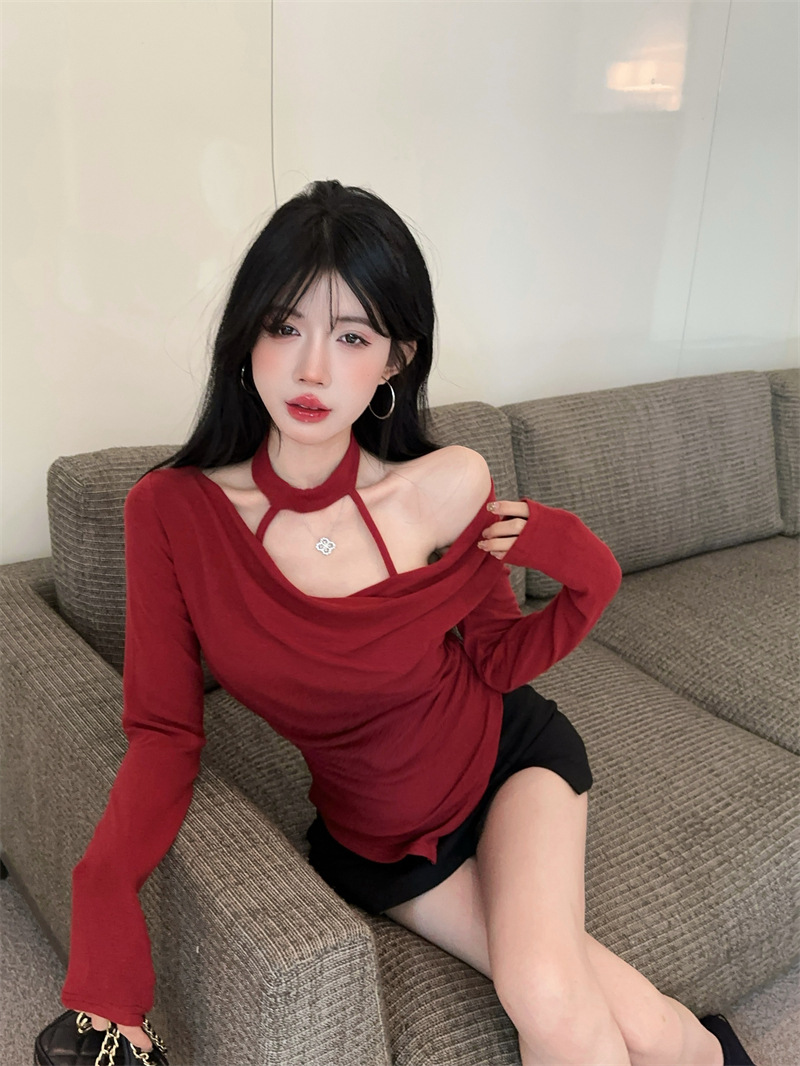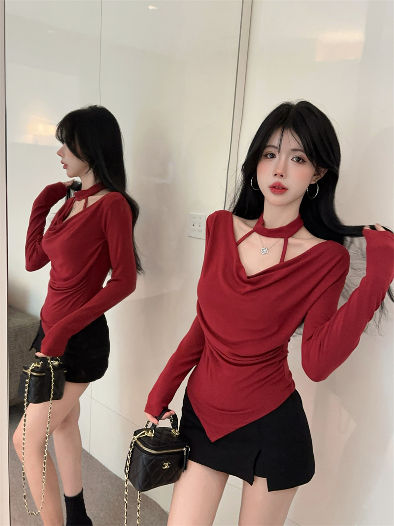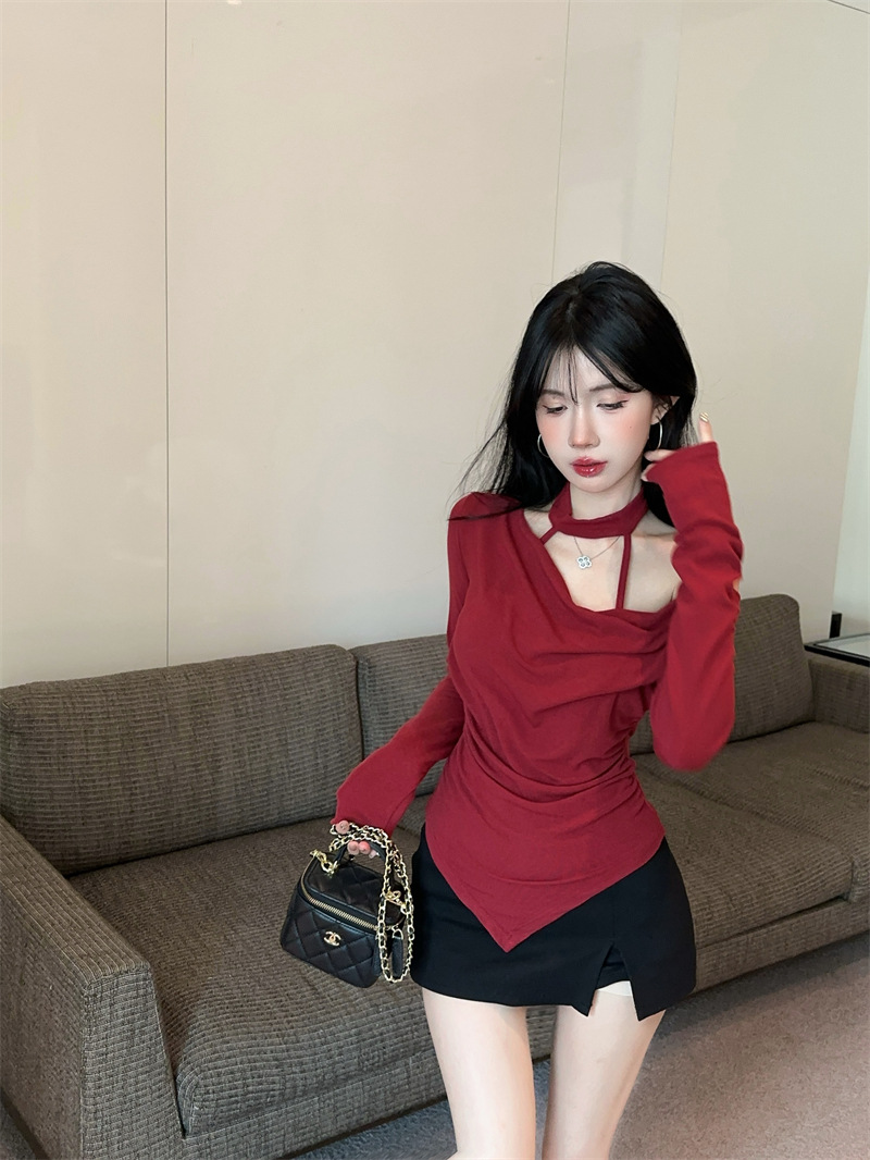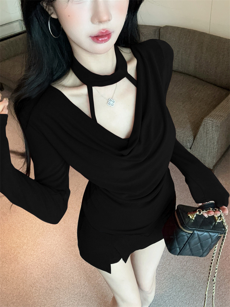스파이스 걸스 순수한 욕망 프랑스 스타일 교수형 목 스윙 칼라 탑 여성의 가을 불규칙한 틈새 칼라 할로우 섹시 베이스 셔츠 트렌디