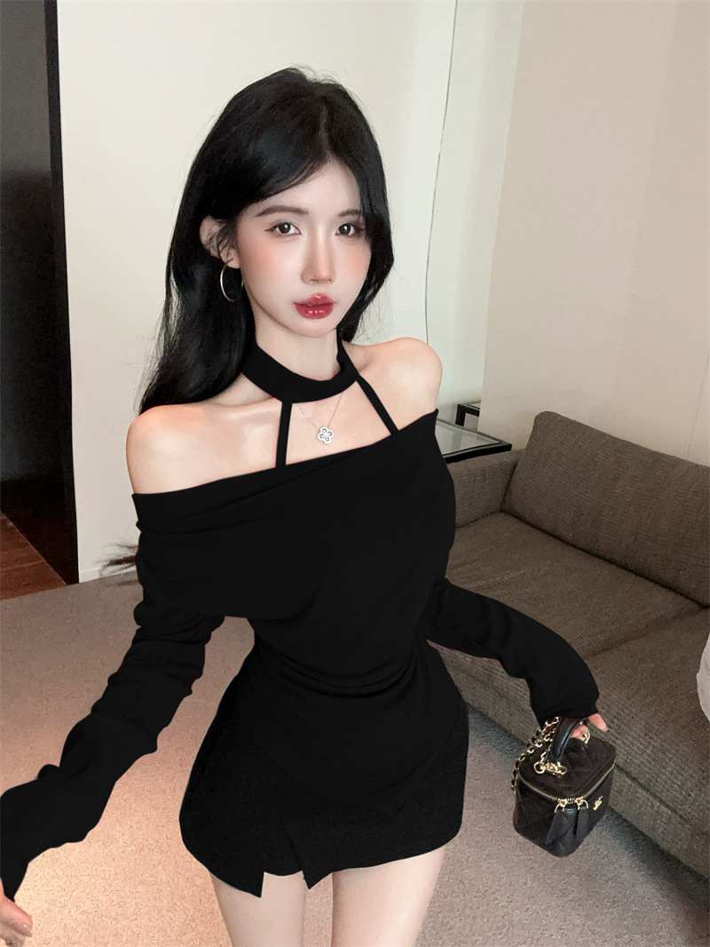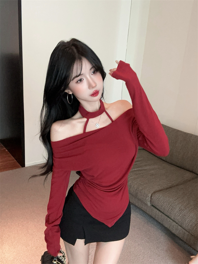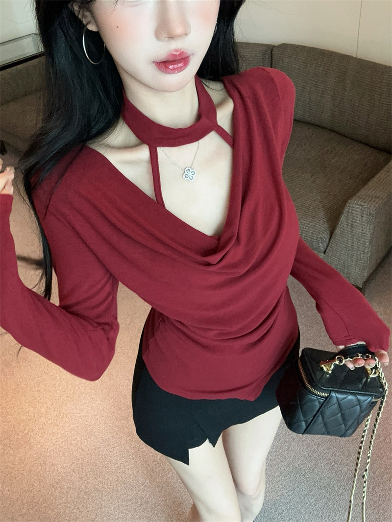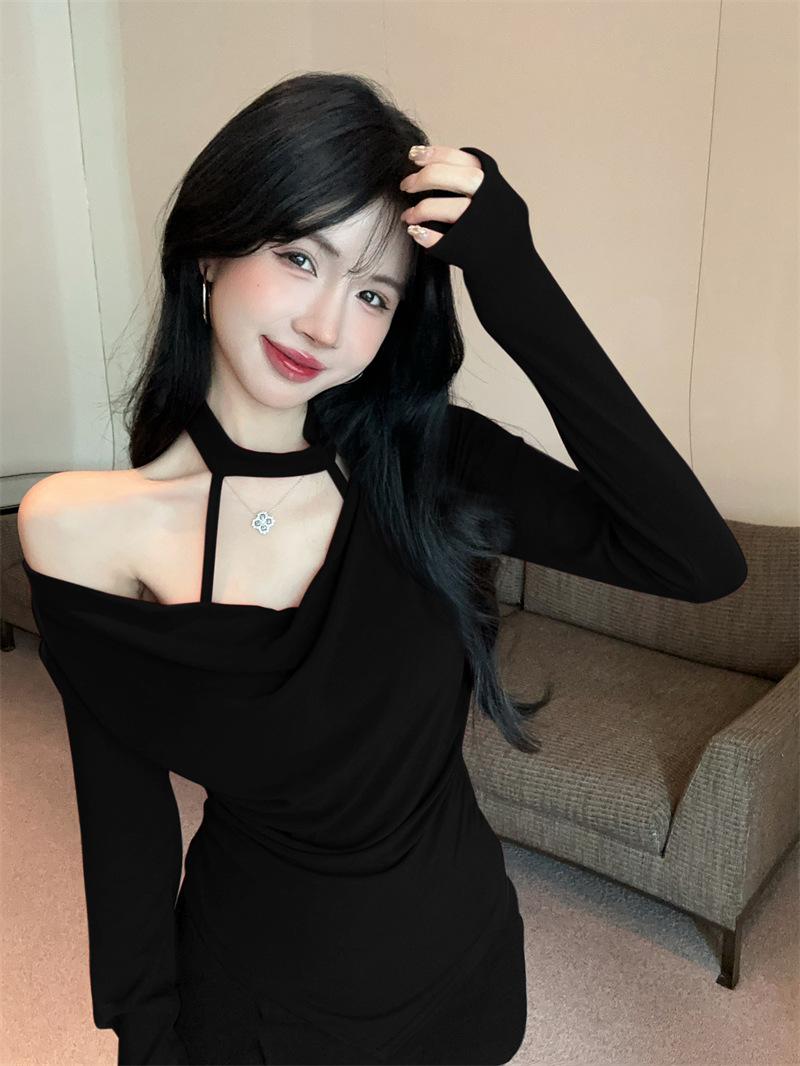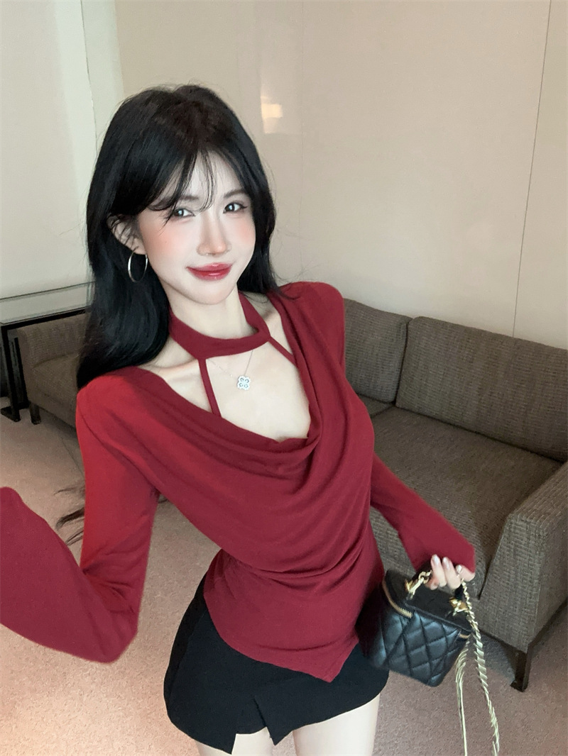 스파이스 걸스 순수한 욕망 프랑스 스타일 교수형 목 스윙 칼라 탑 여성의 가을 불규칙한 틈새 칼라 할로우 섹시 베이스 셔츠 트렌디