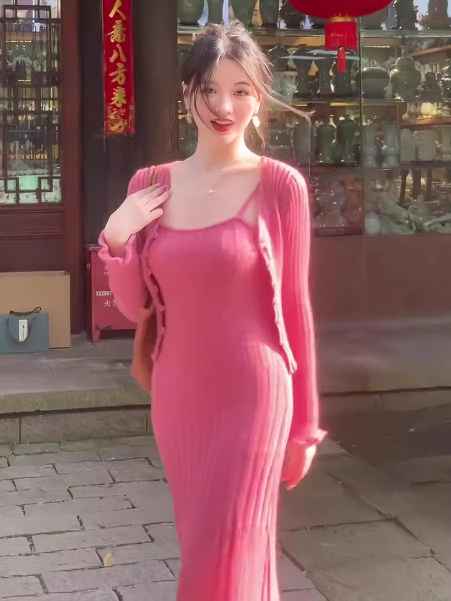 2025 가을 겨울 신상 디자인, 아름답고 섹시하며 순수한 매력의 슬림 핑크 가디건과 슬립 드레스 세트 (여성용)스토어 가기
