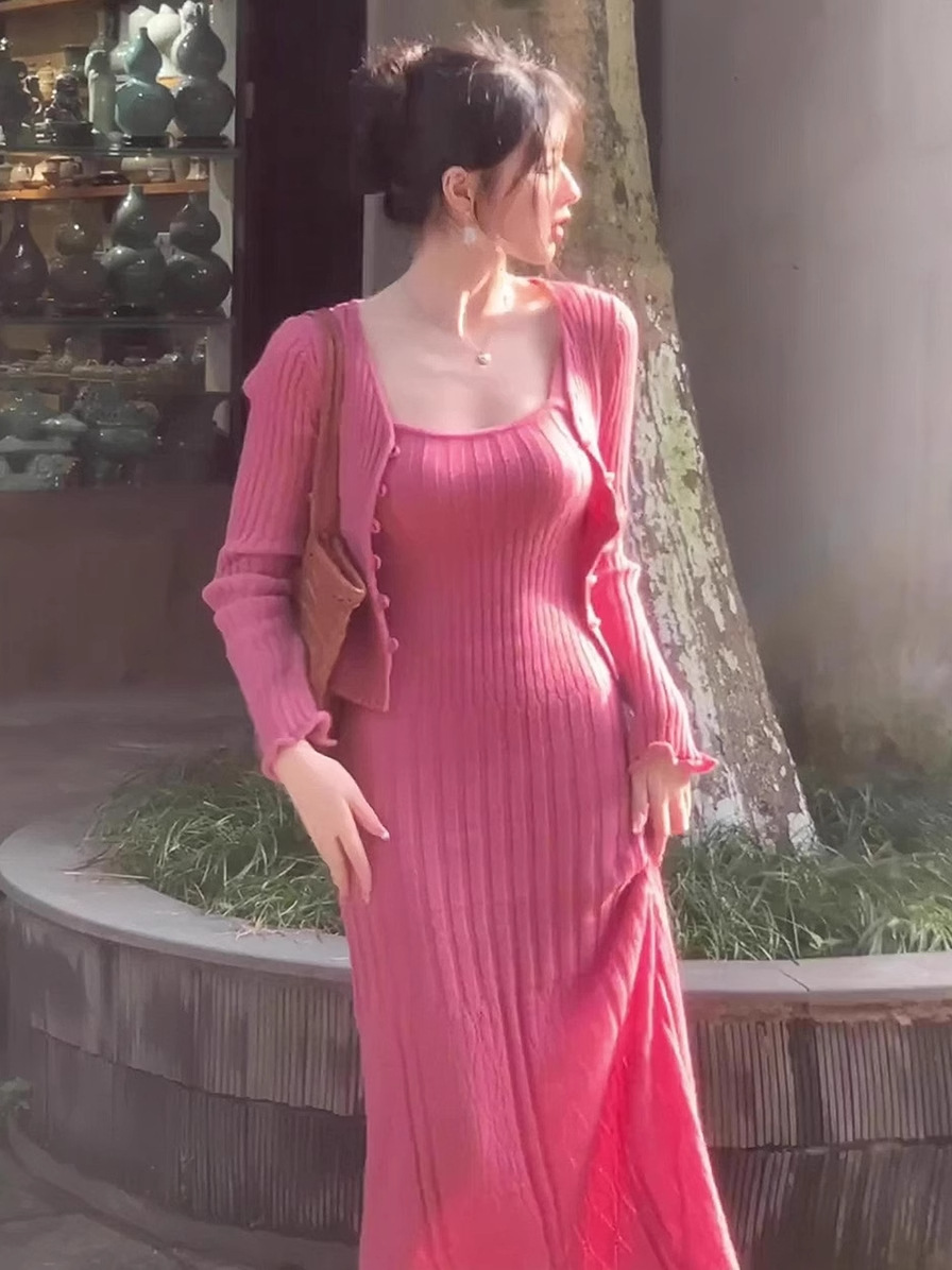 2025 가을 겨울 신상 디자인, 아름답고 섹시하며 순수한 매력의 슬림 핑크 가디건과 슬립 드레스 세트 (여성용)