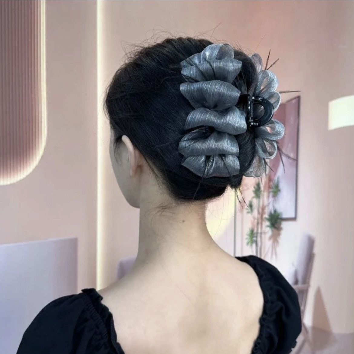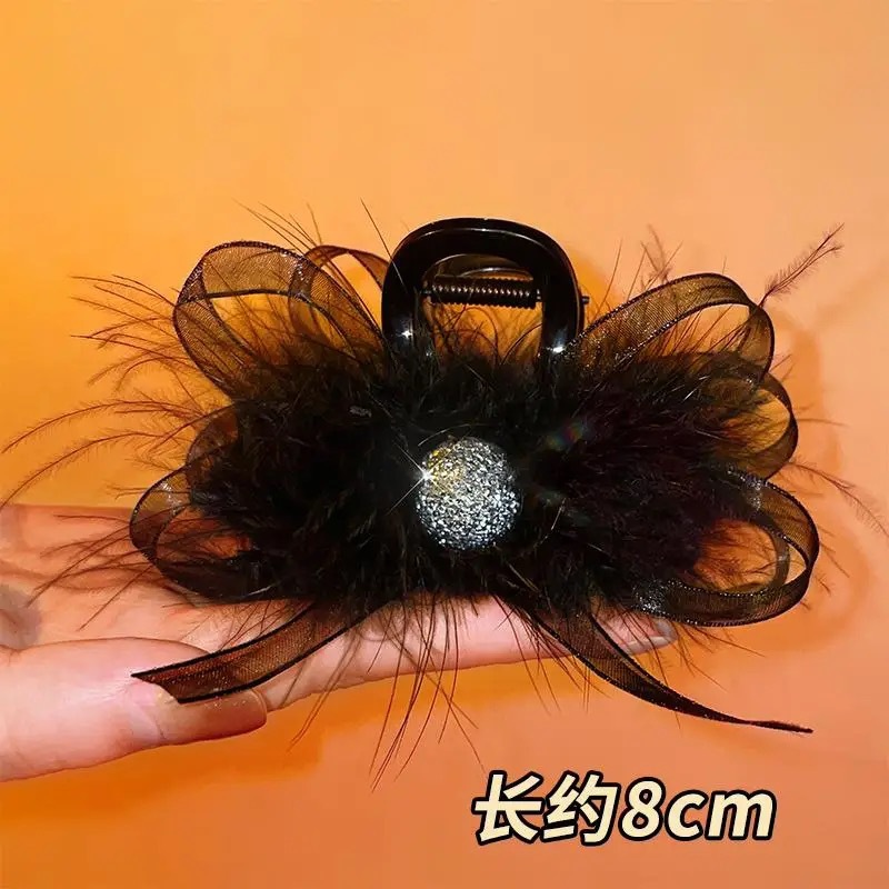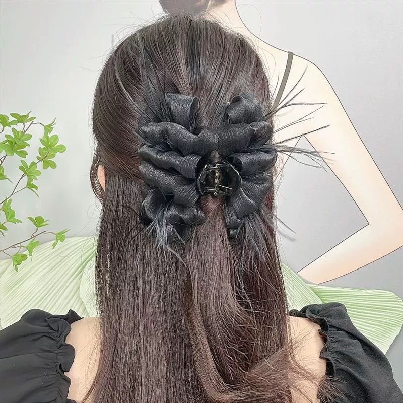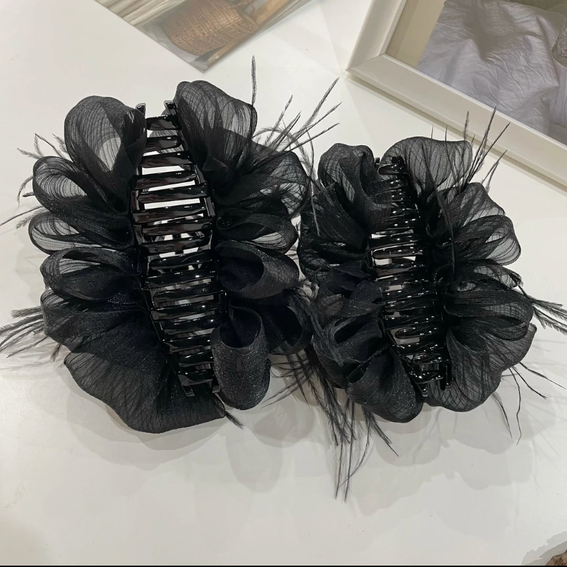 양면 타조 깃털 헤어핀 여성의 꽃 머리 잡아 메쉬 블랙 버블 그랩 클립 헤어 2024 새로운 헤어 액세서리