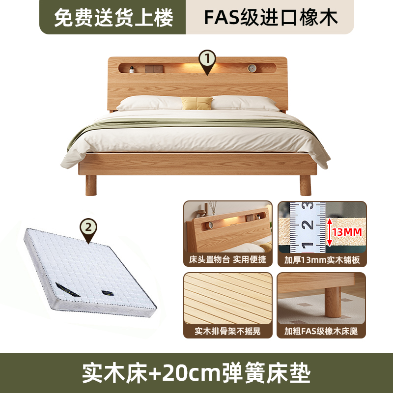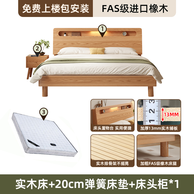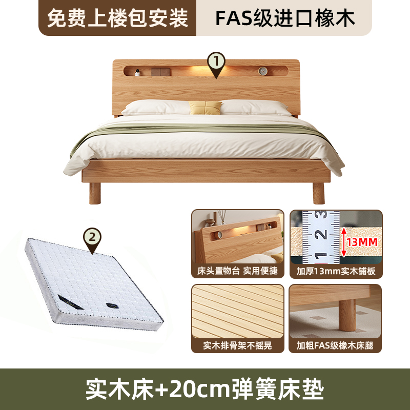 • 오크 침대 + 20cm 스프링 매트리스 + 침대협탁 * 1 [위층 패키지]