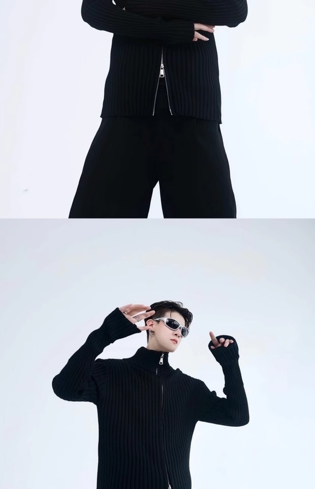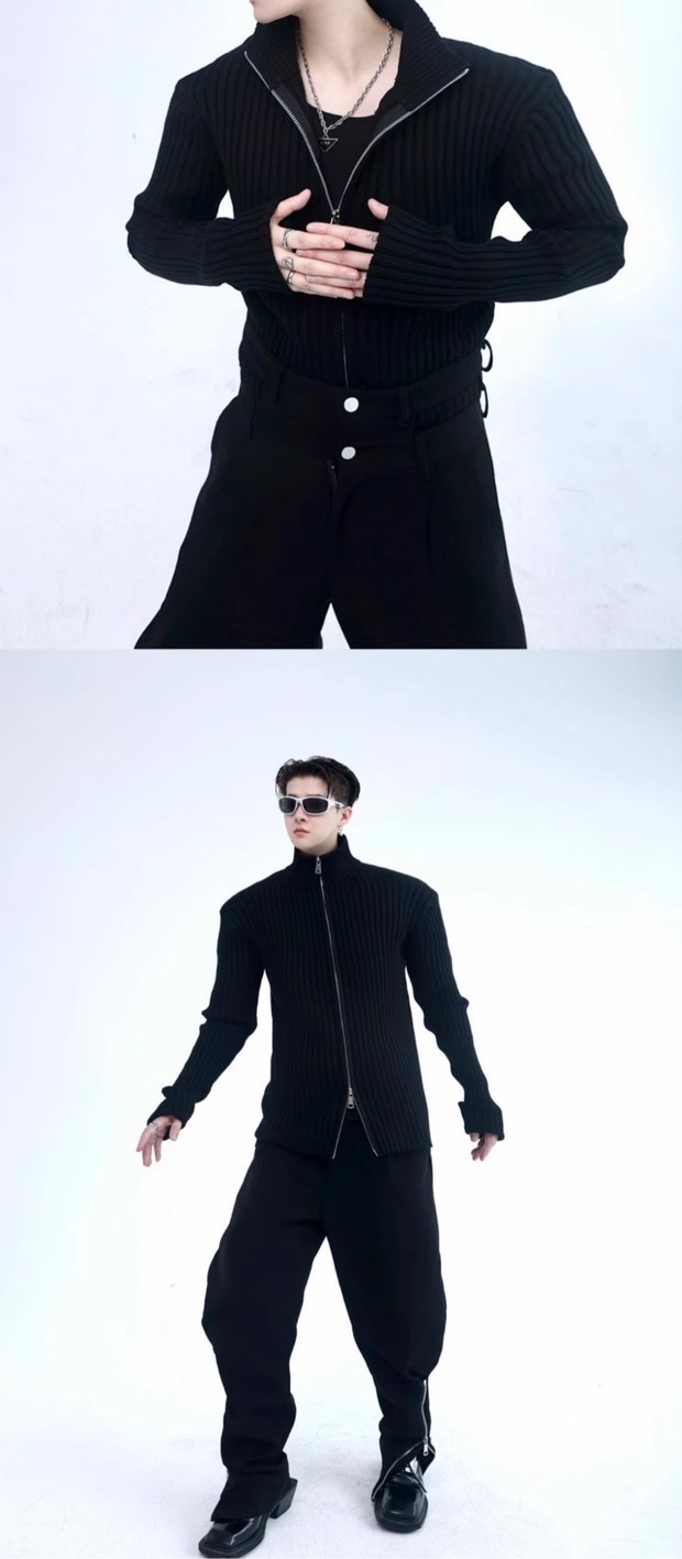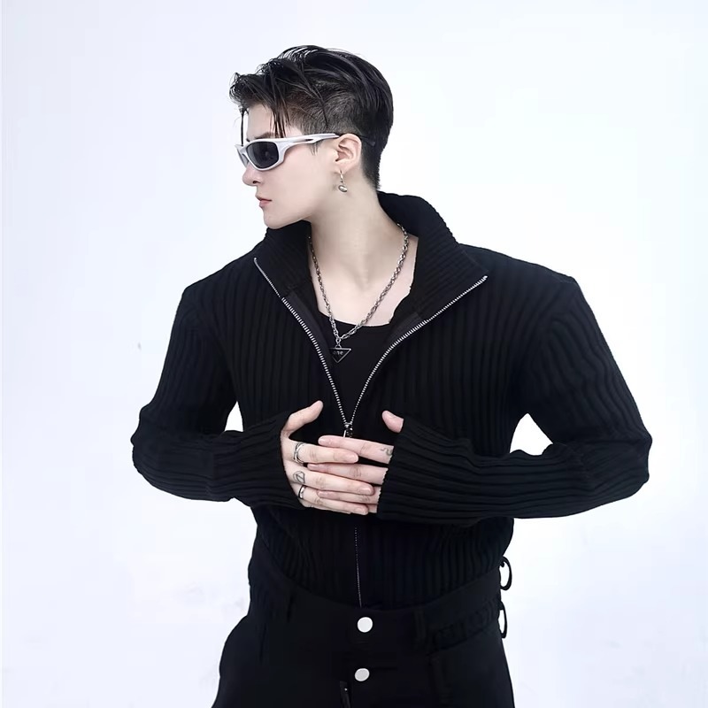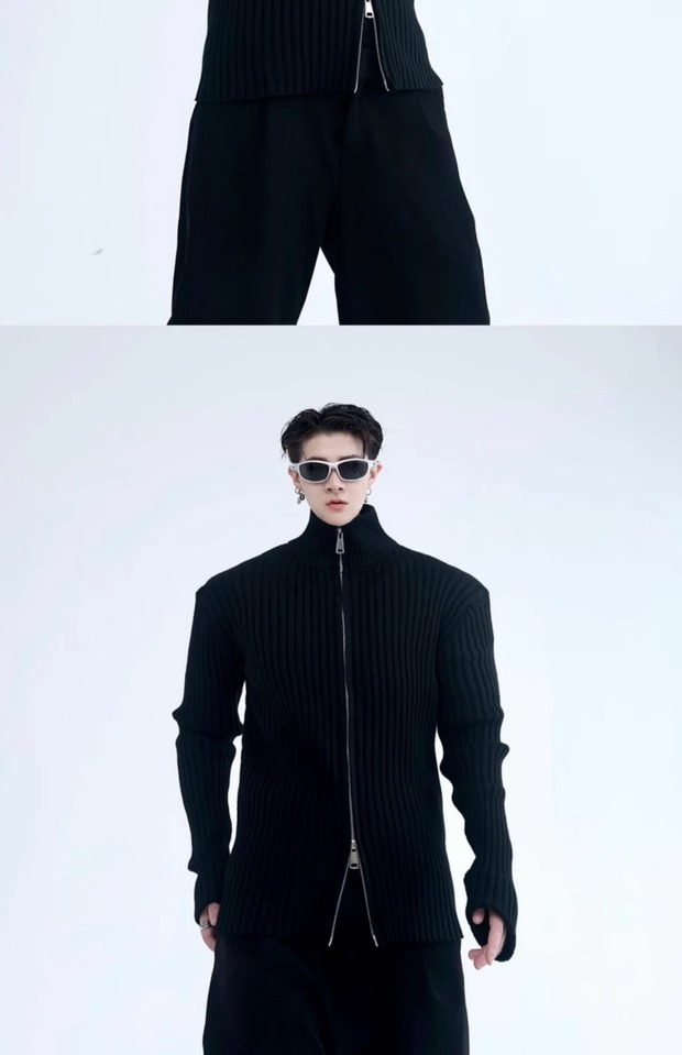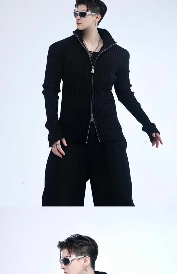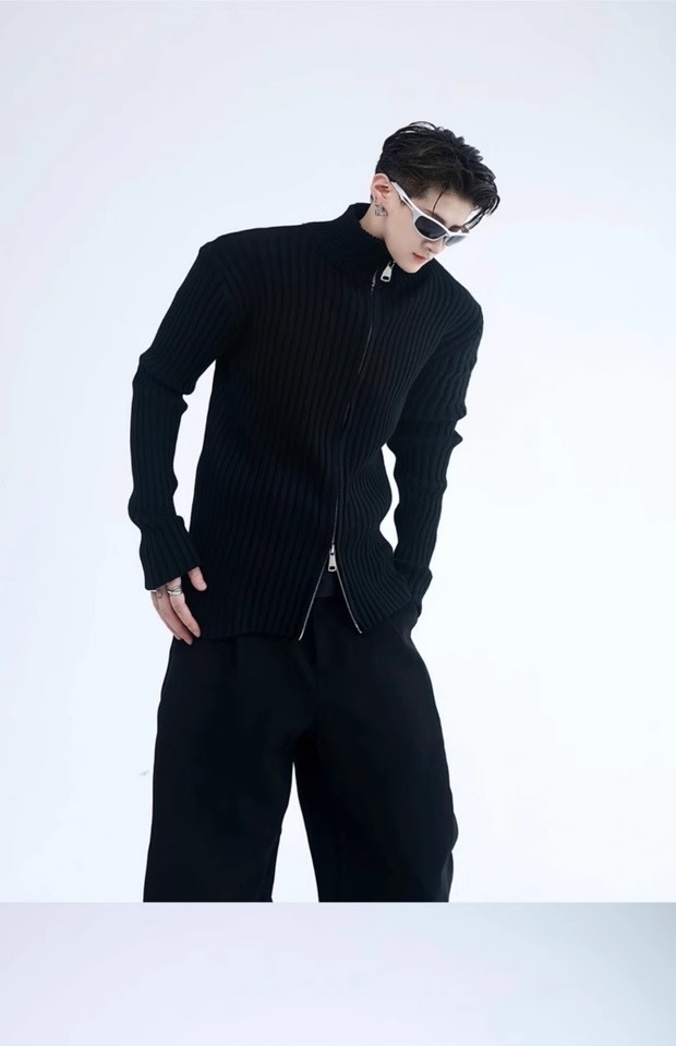 다크 스타일 카디건 핏 스웨터 남성용 틈새 더블 헤드 지퍼 디자인 센스 슬림 핏 Duffian 핸섬 칼라 니트 내부 림