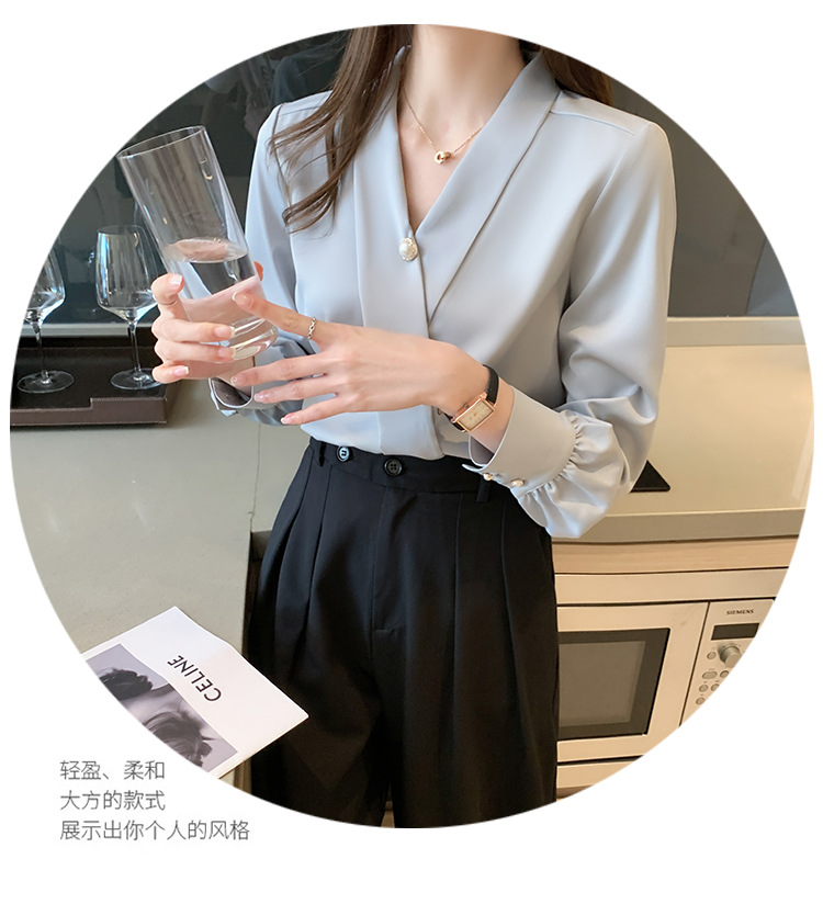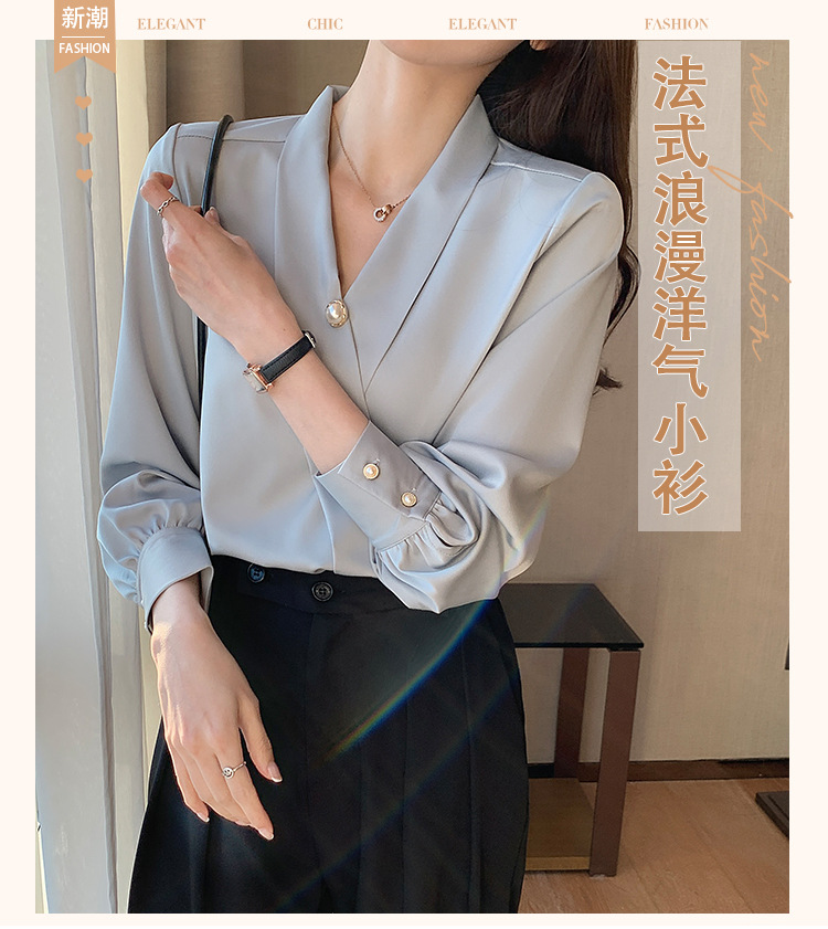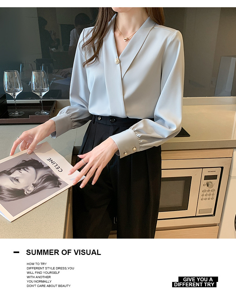 봄과 가을 새로운 스타일의 진주 장식 한국 실크 새틴 고급 V 넥 시폰 셔츠 여성 셔츠스토어 가기