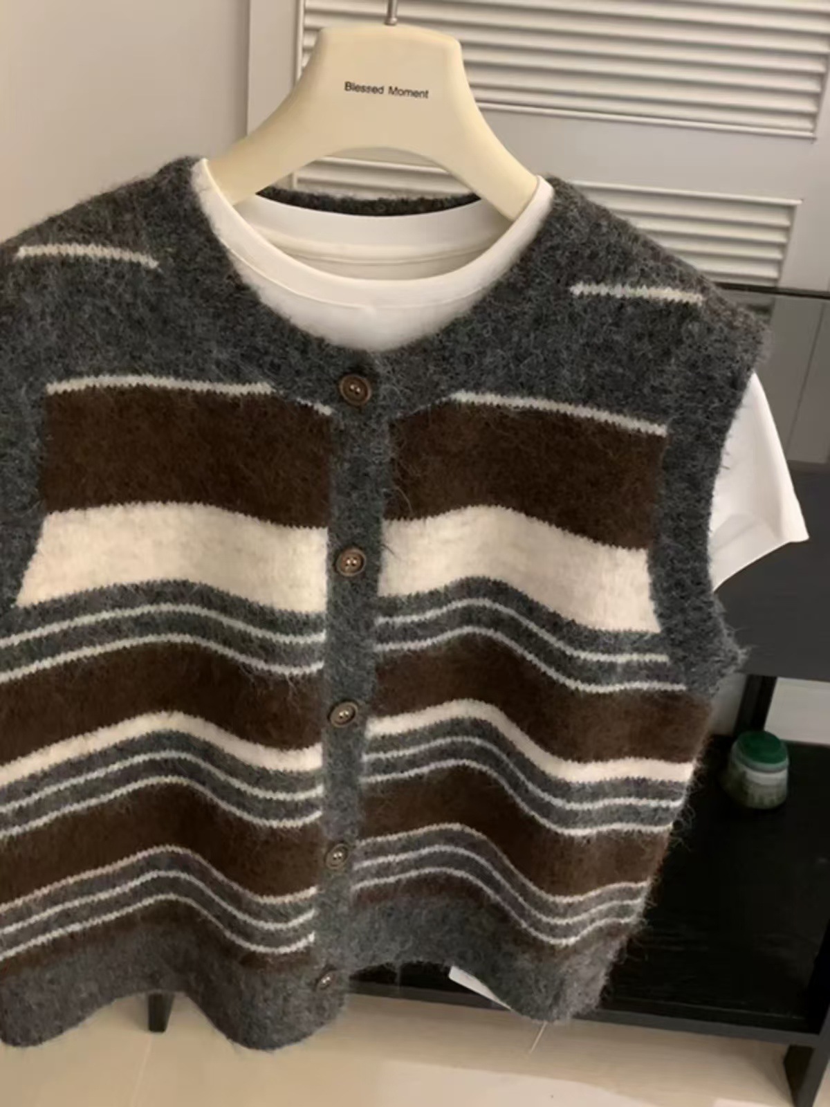 复古条纹慵懒风简约圆领气质针织马甲时尚秋款宽松叠穿坎肩上衣女