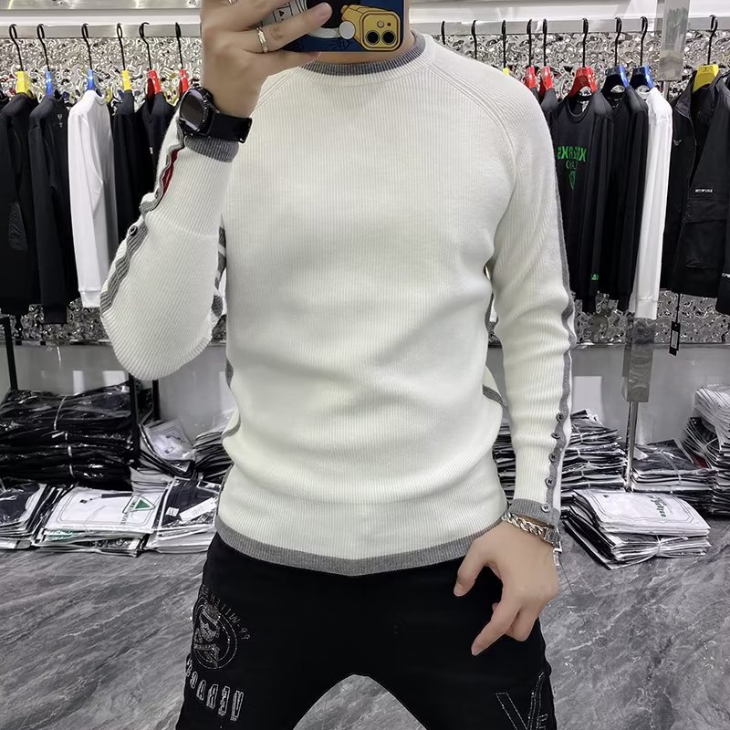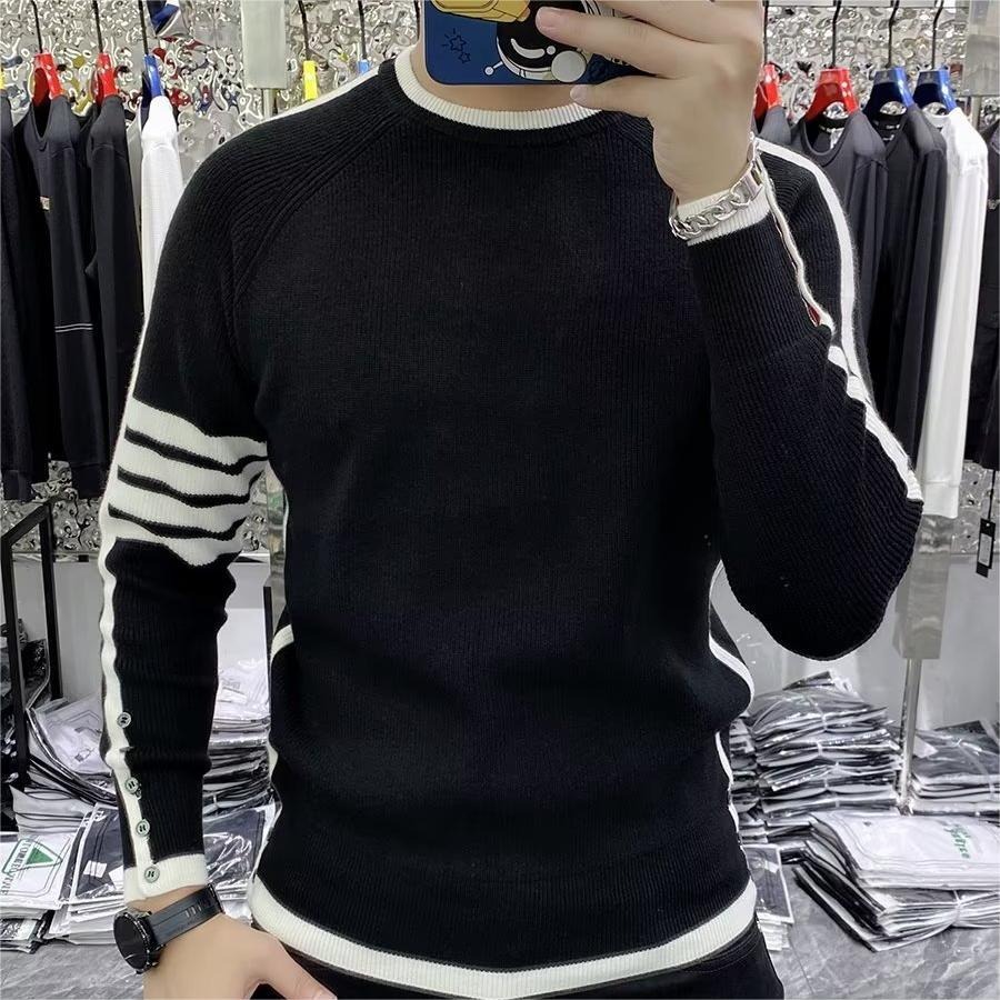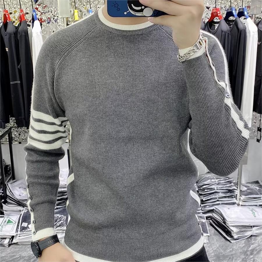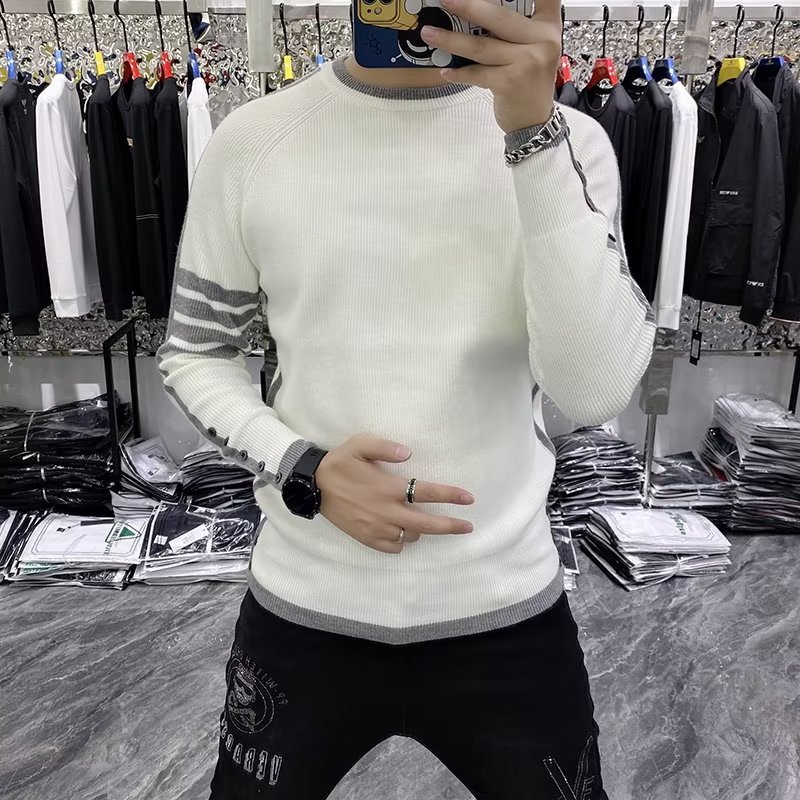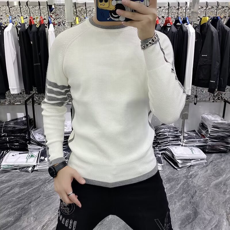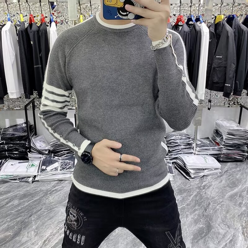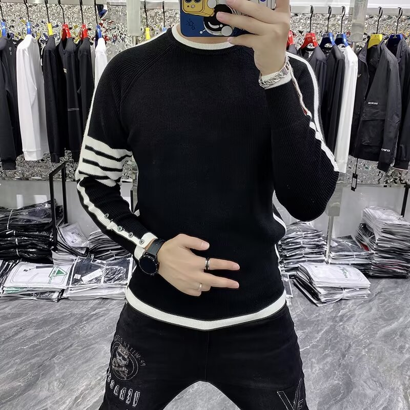 크루 넥 스웨터 남성용 슬림 핏 가을과 겨울 스트라이프 슬림 핏 청소년 내부 탑 트렌디 브랜드 2024 새로운 니트 베이스 셔츠