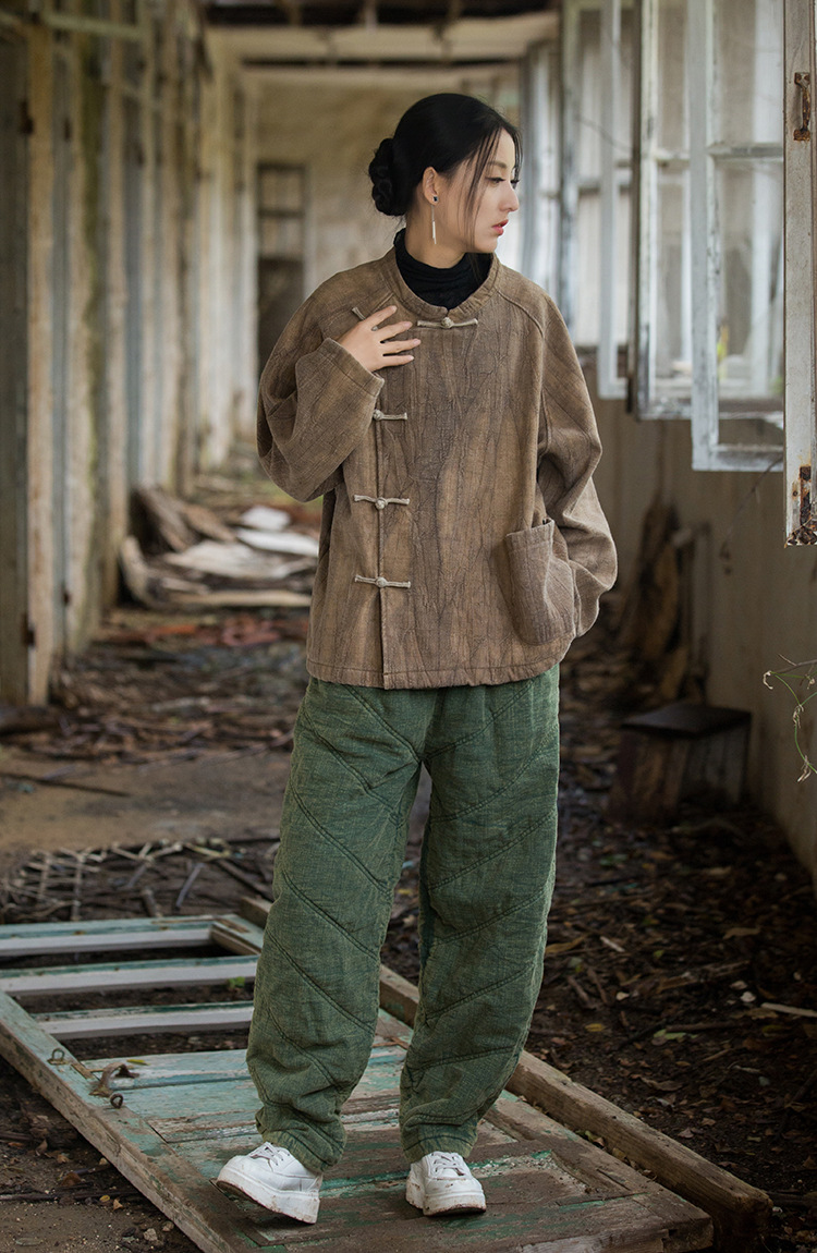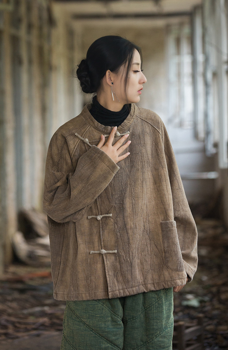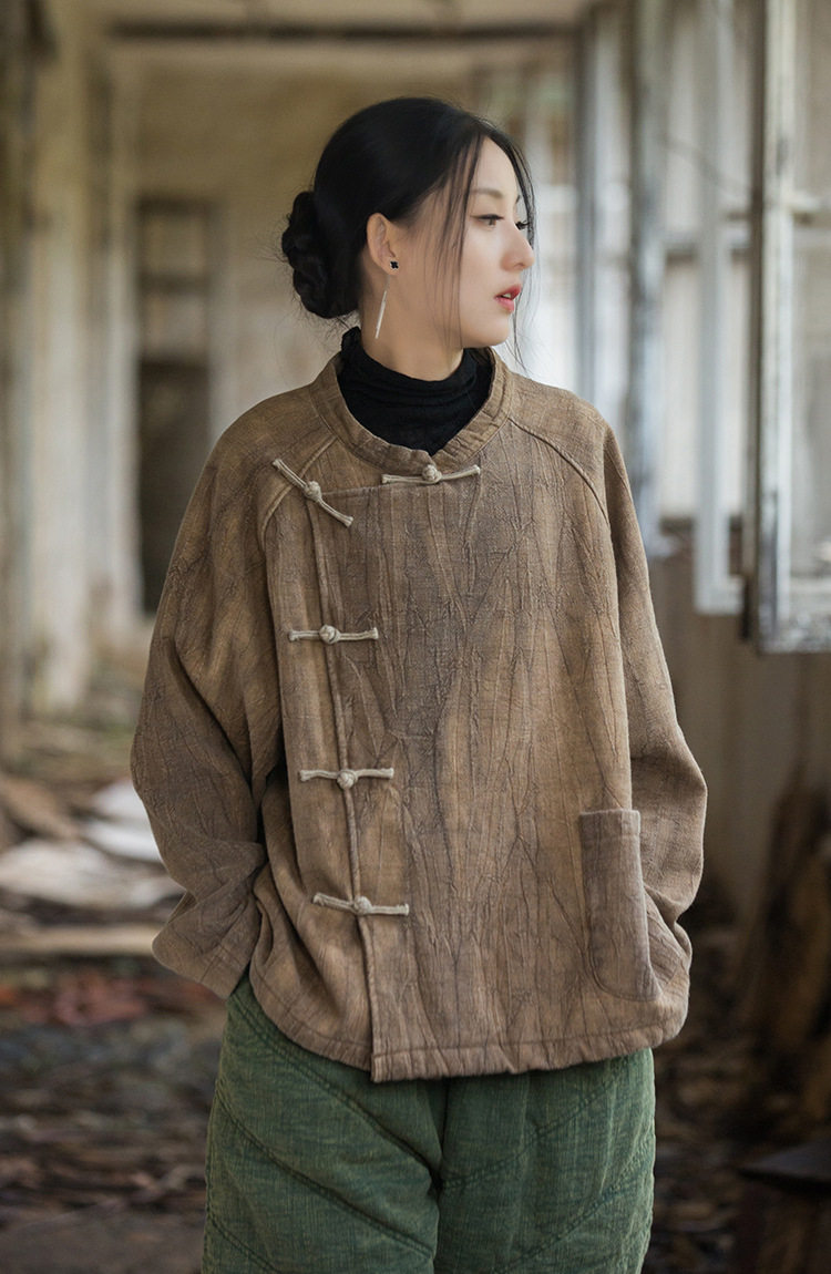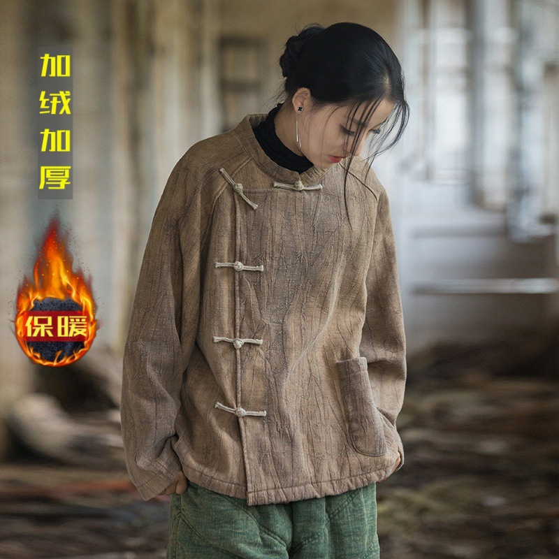 25 봄 여성의 새로운 스타일 라미 타이 염색 플러스 벨벳 두꺼운 따뜻한 겉옷 복고풍 문학 성격 버클 여성 티셔츠