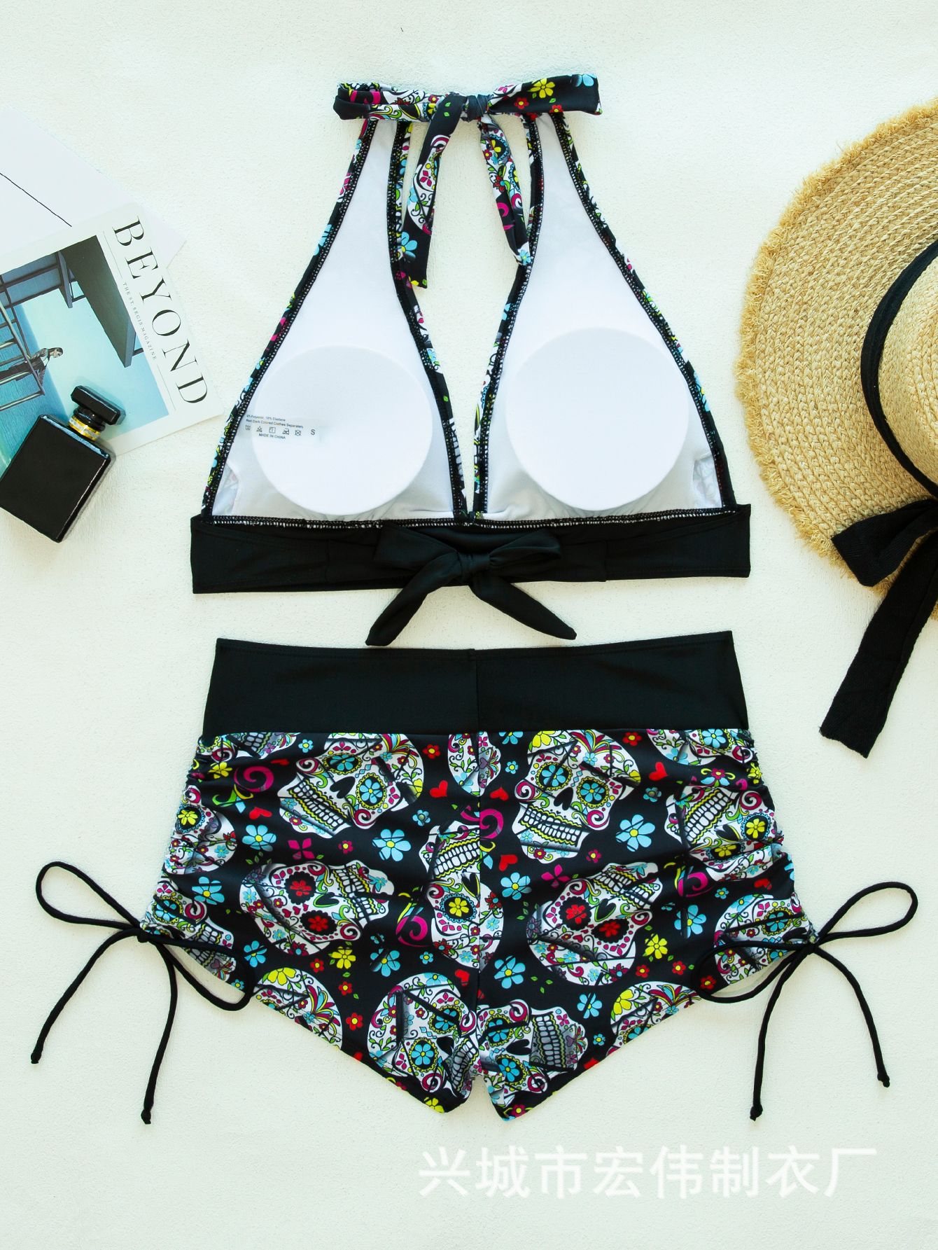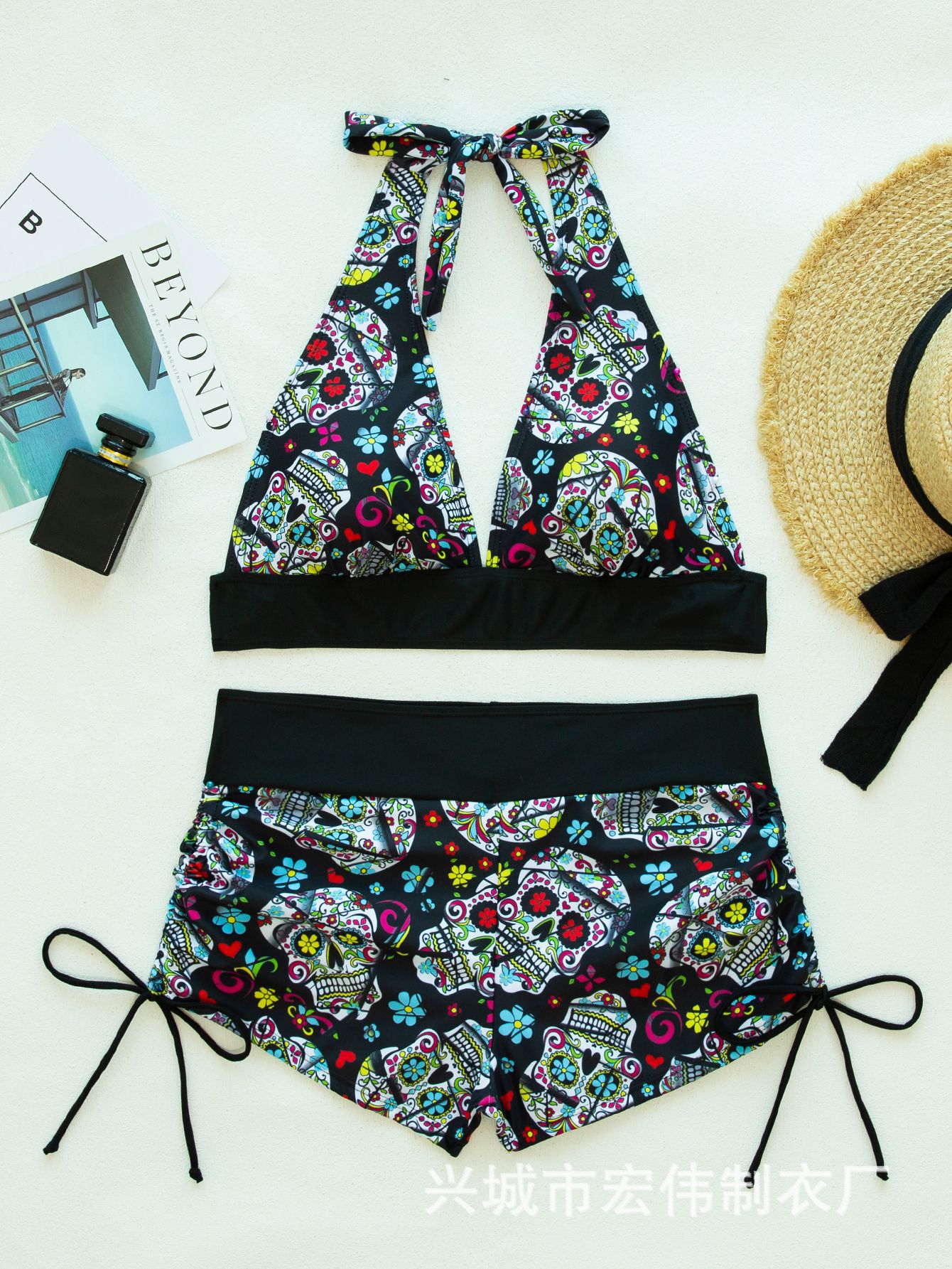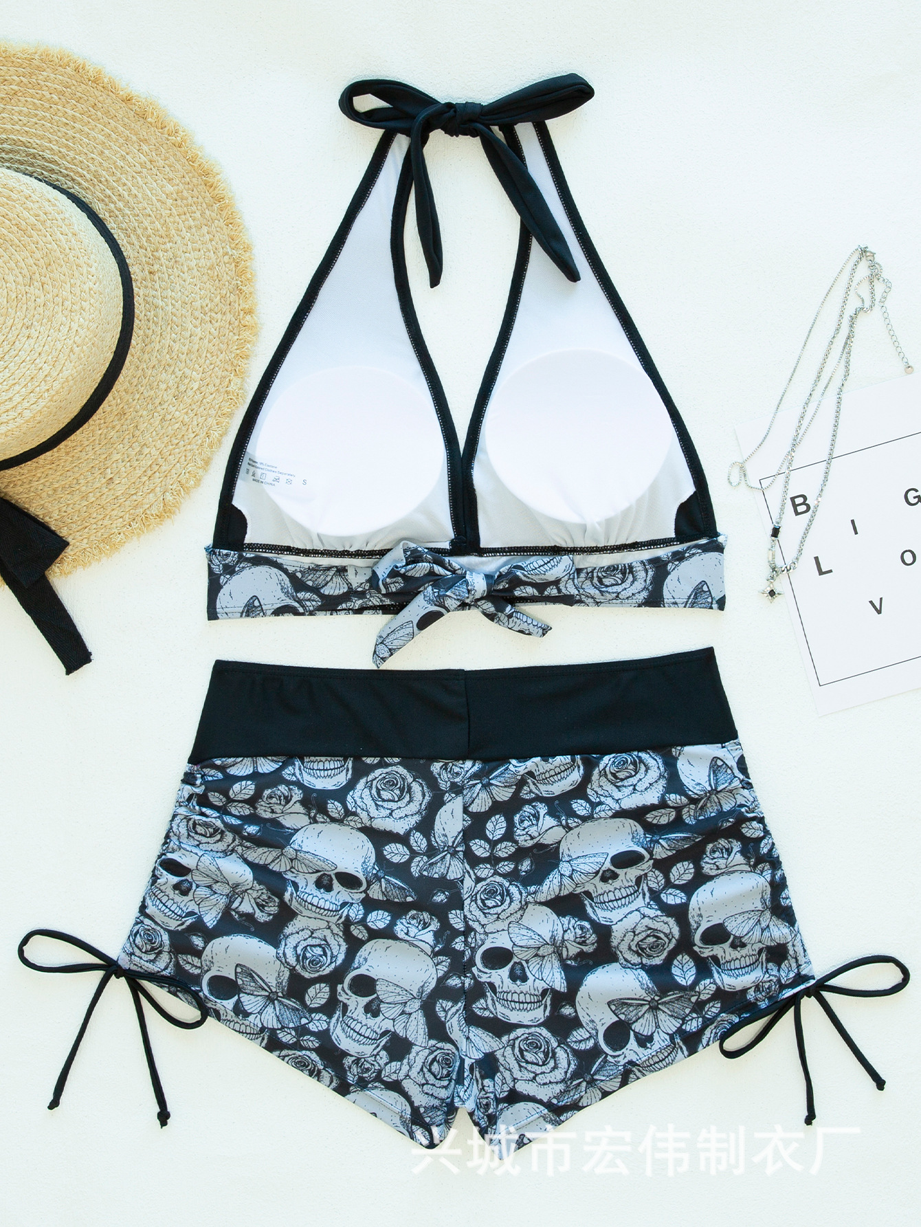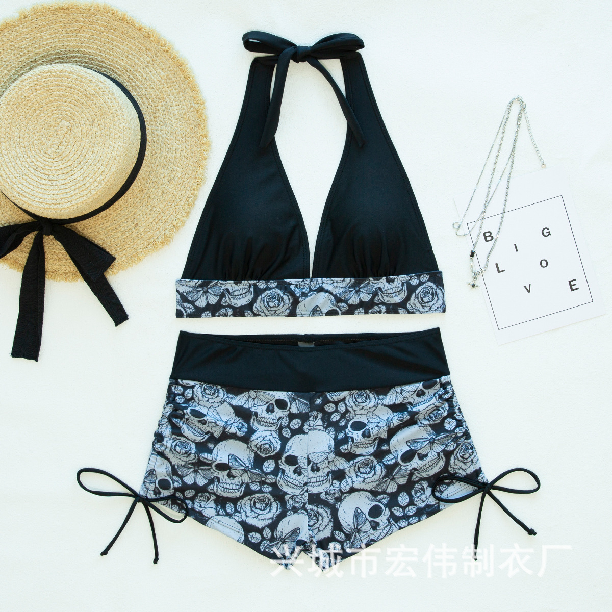 2025 새로운 유럽 및 미국 스타일 목 상자 수영복 비키니 보수적 인 두개골 인쇄 수영복 아마존