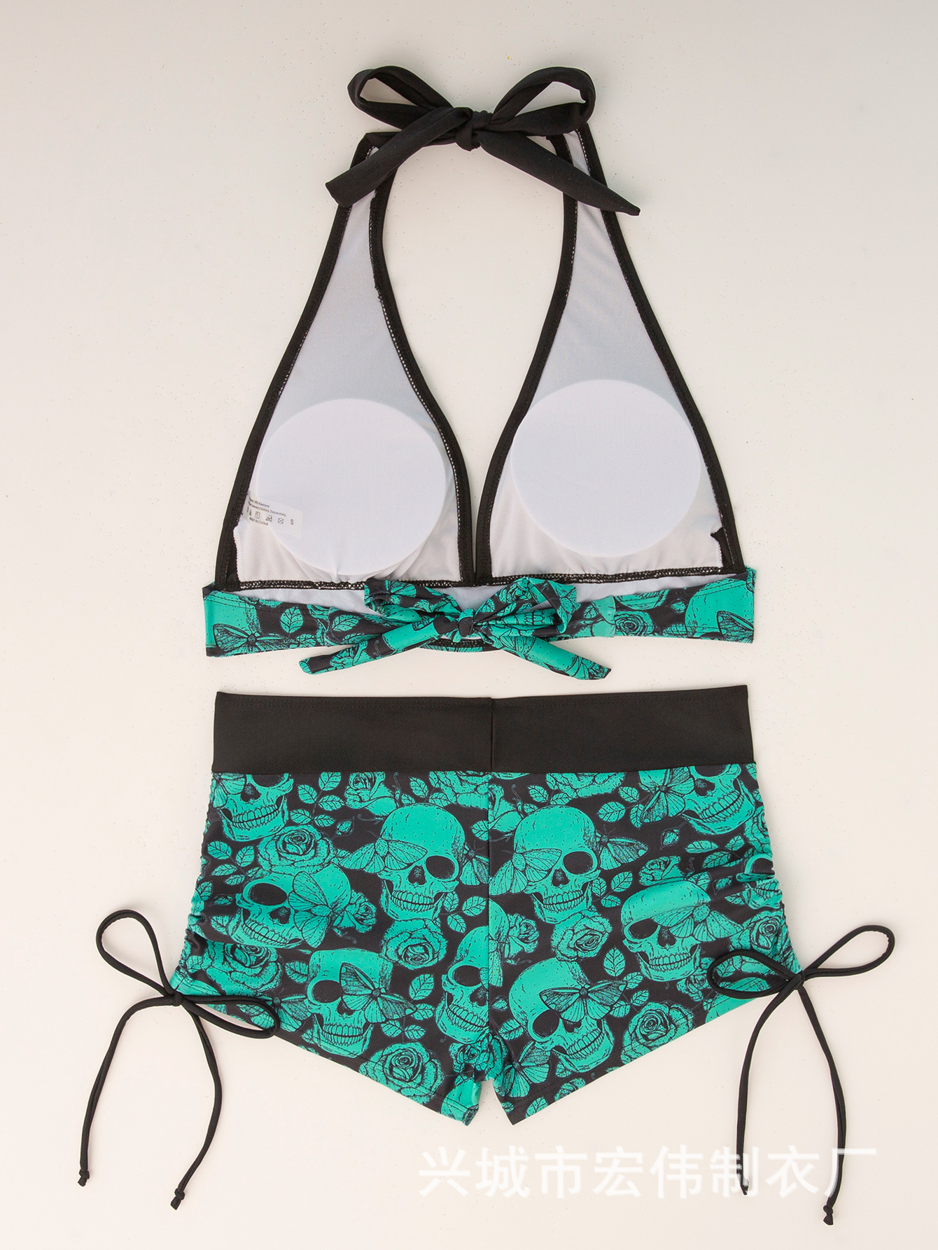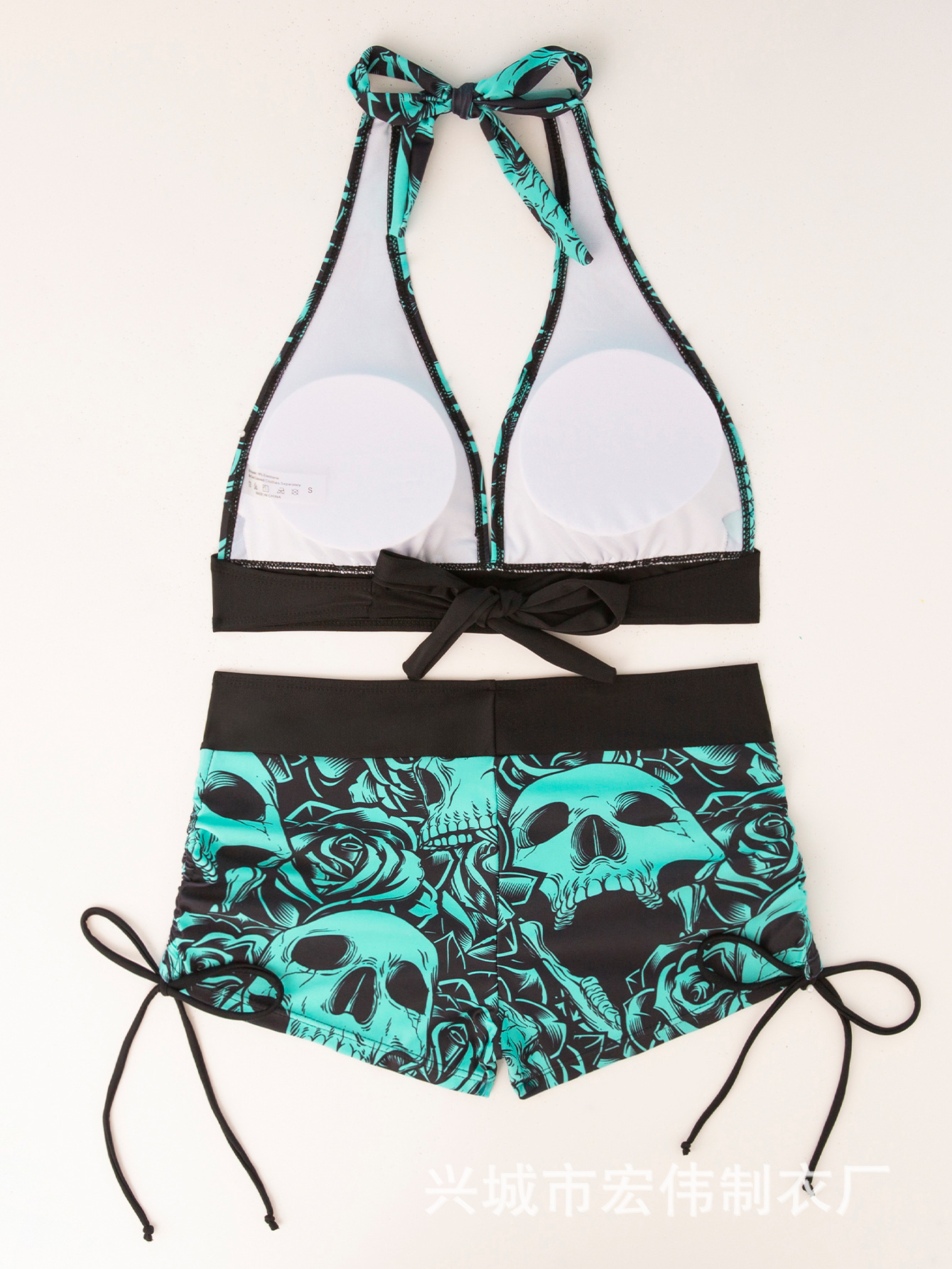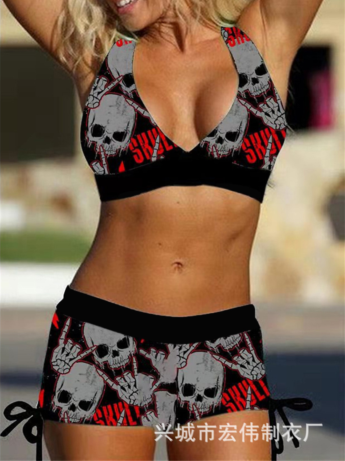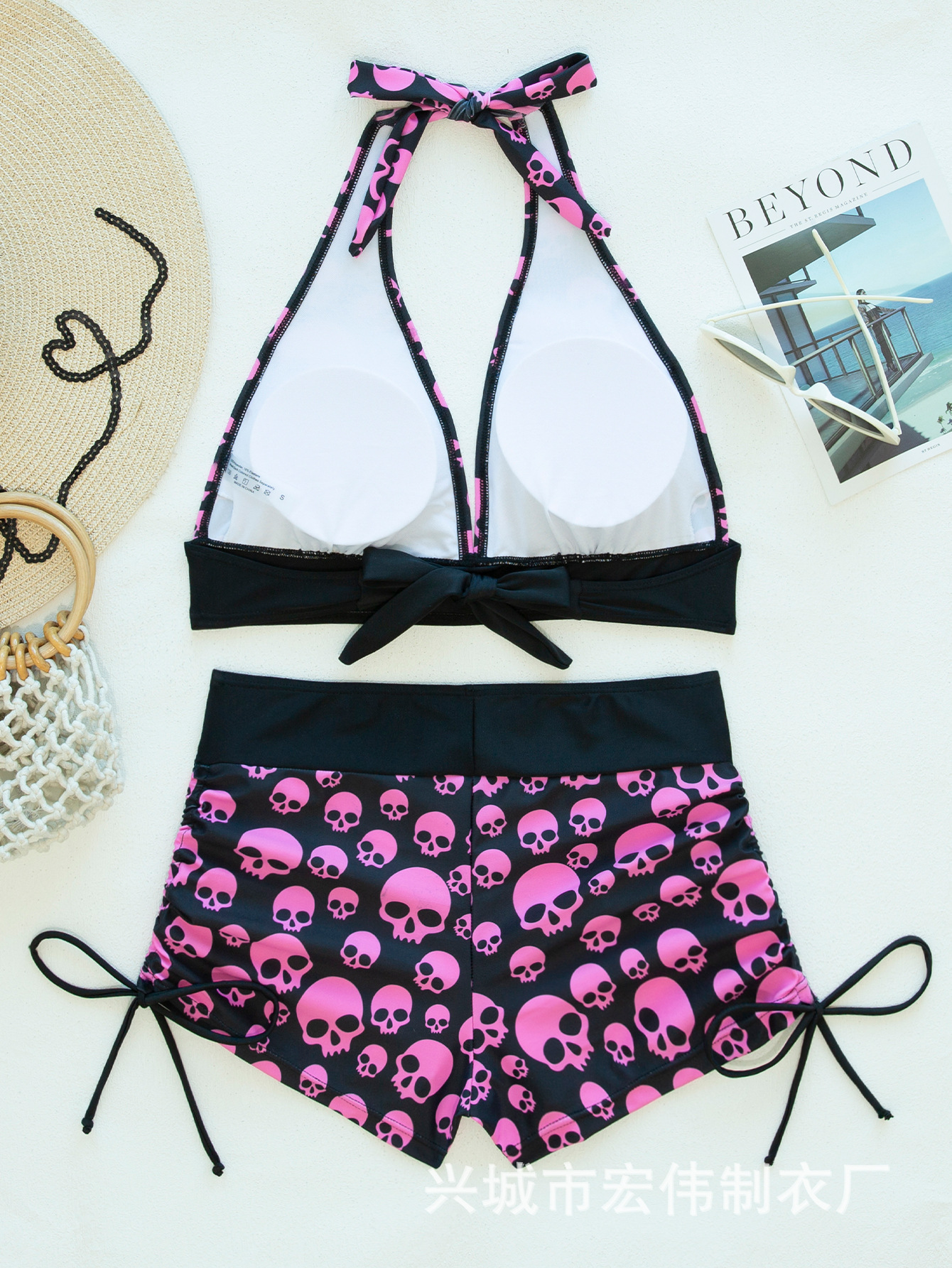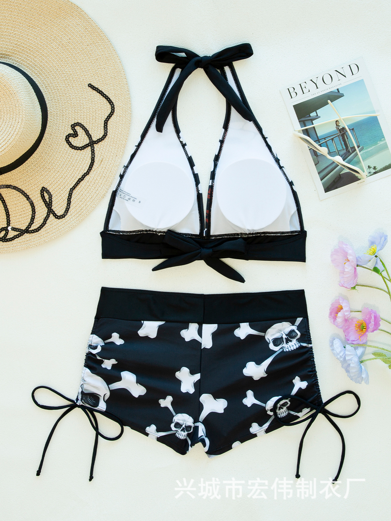 2025 새로운 유럽 및 미국 스타일 목 상자 수영복 비키니 보수적 인 두개골 인쇄 수영복 아마존