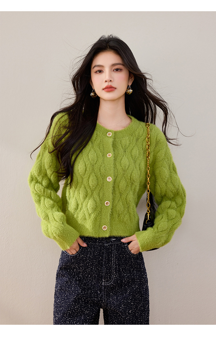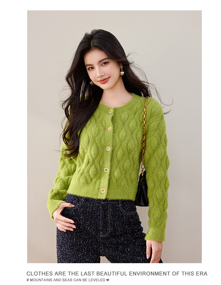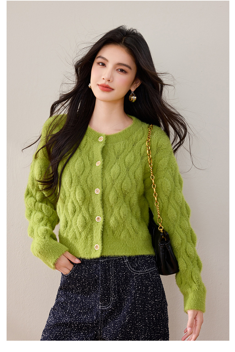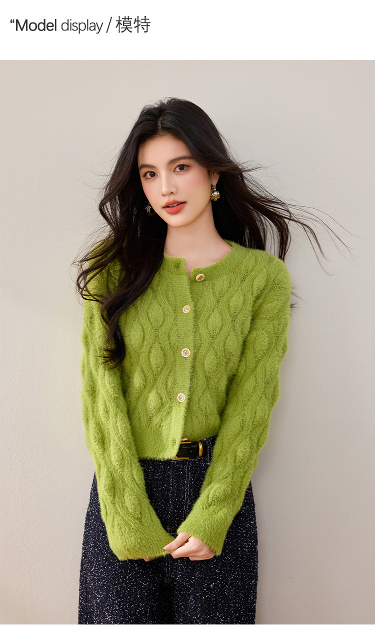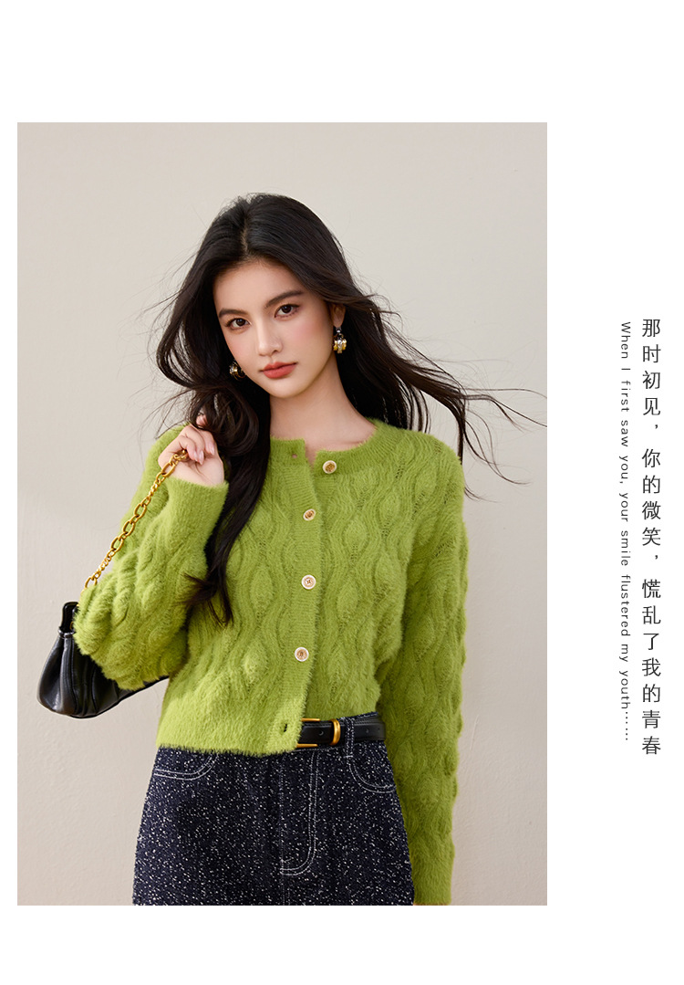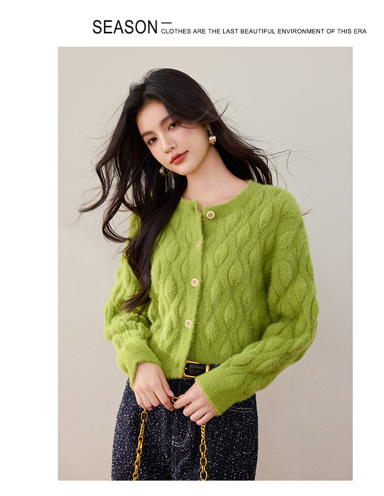 모조 밍크 헤어 니트 카디건 여성 2024 년 겨울 뉴 샤넬 스타일 봉제 빈티지 트위스트 짧은 라운드 넥 스웨터