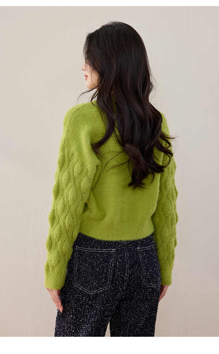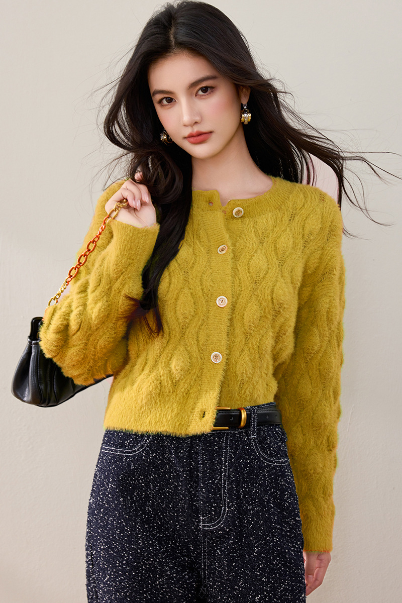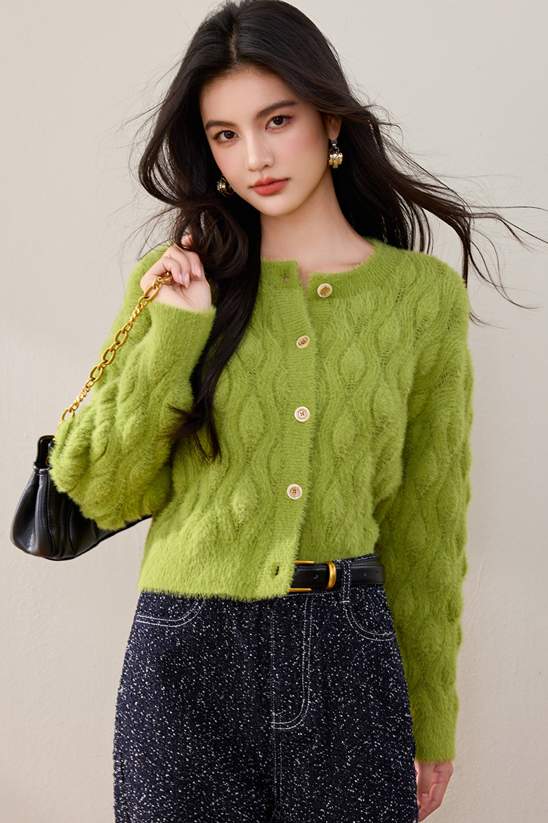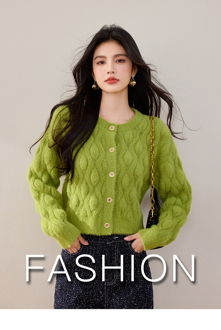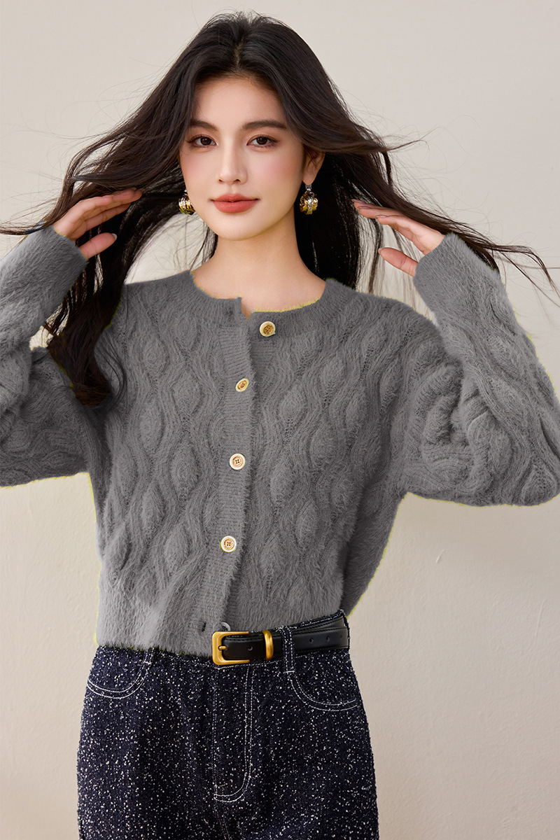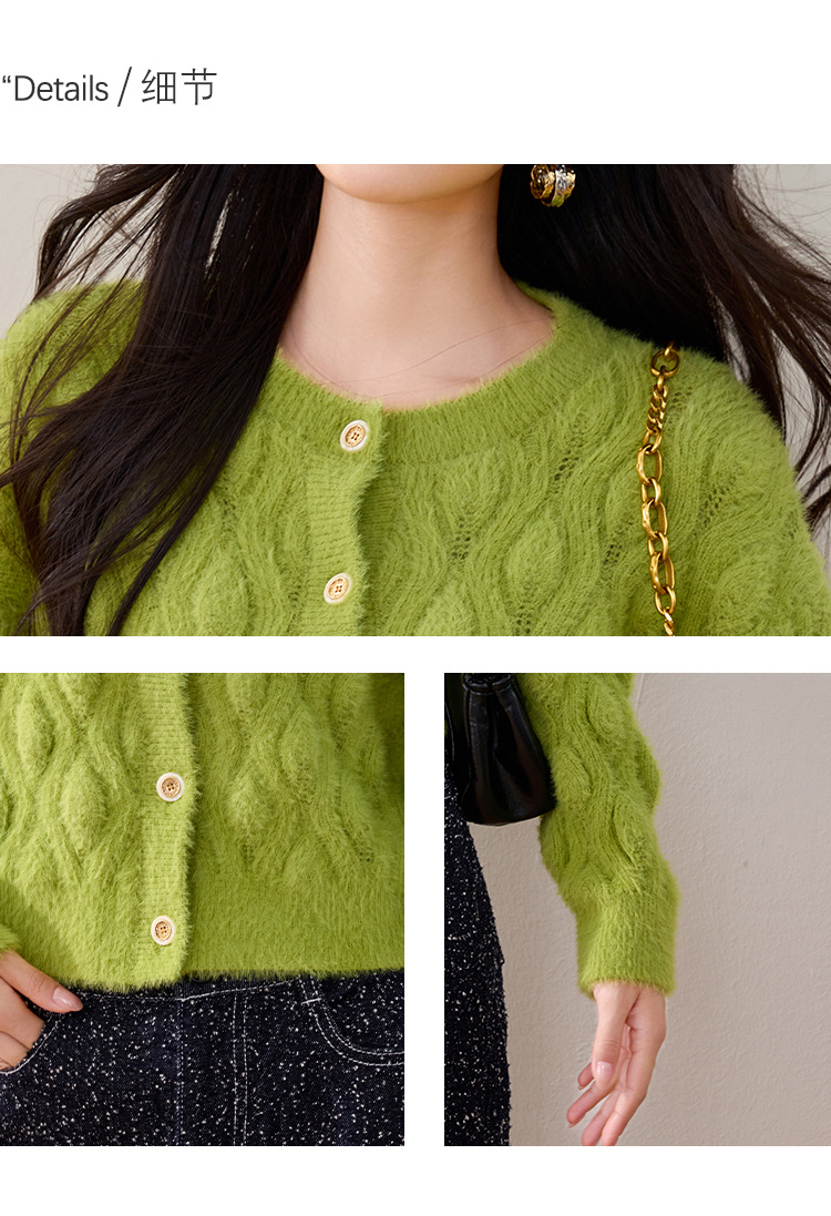 모조 밍크 헤어 니트 카디건 여성 2024 년 겨울 뉴 샤넬 스타일 봉제 빈티지 트위스트 짧은 라운드 넥 스웨터