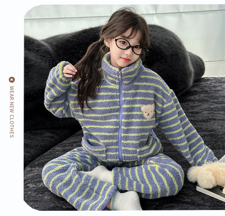 여자 산호 양털 잠옷 세트 2024 새로운 어린이 두꺼운 따뜻한 줄무늬 지퍼 카디건 홈 의류 소년