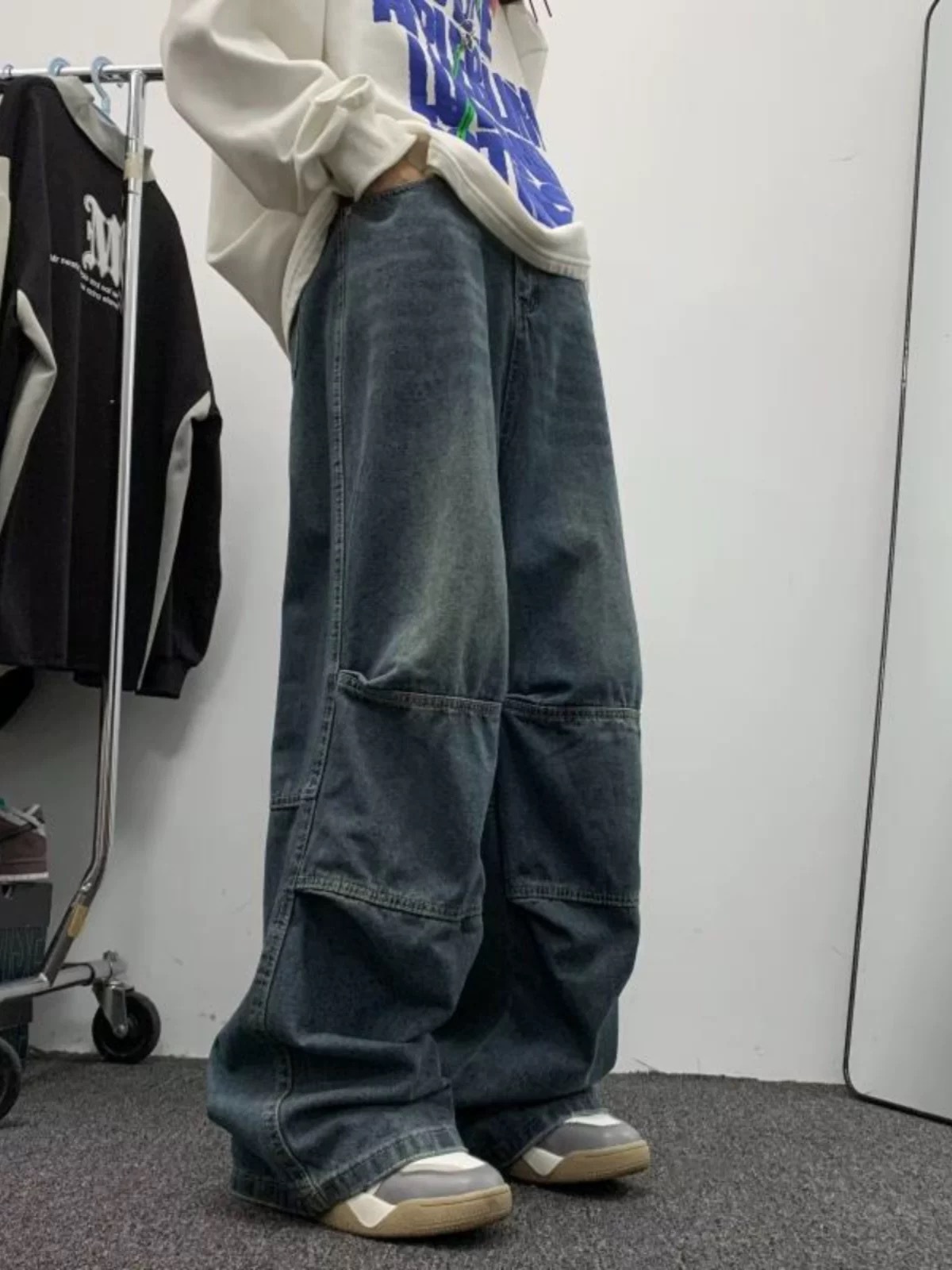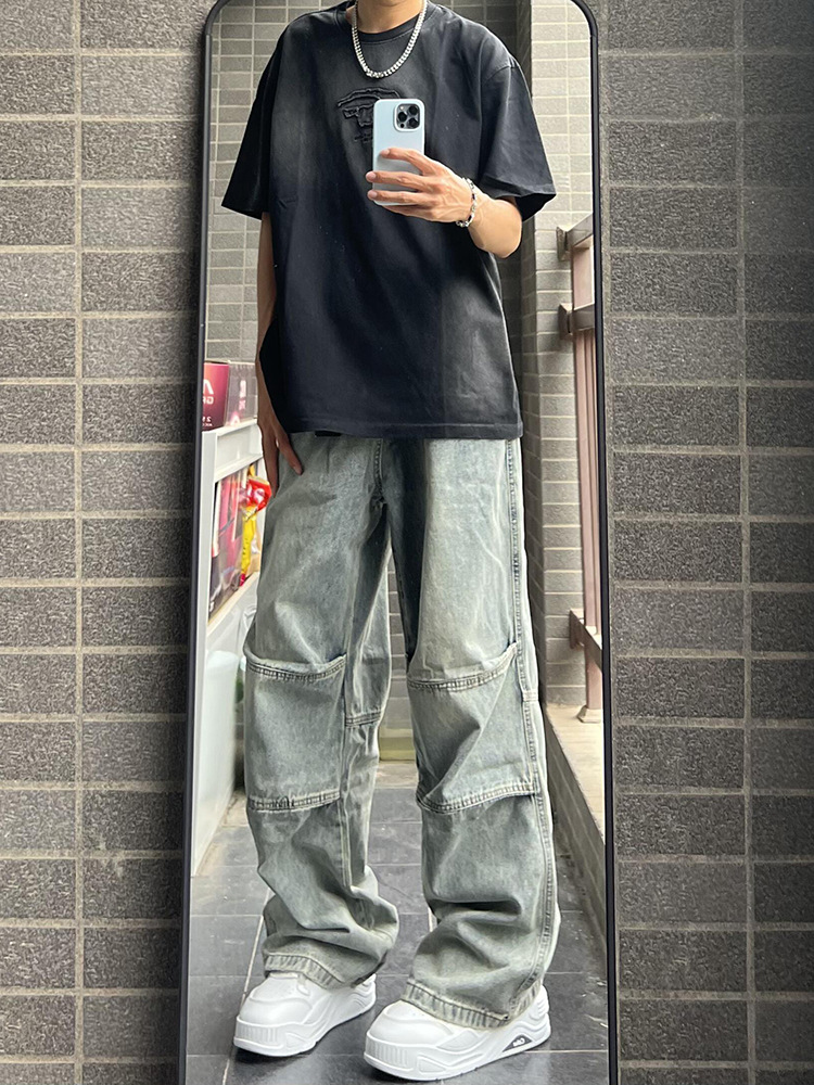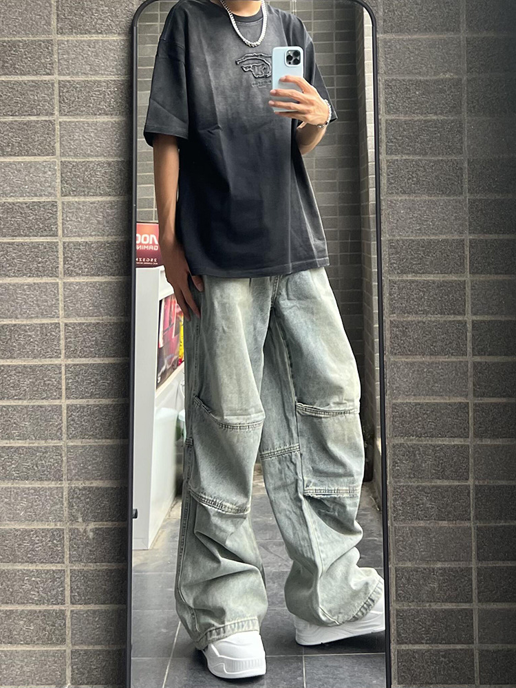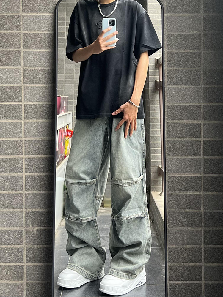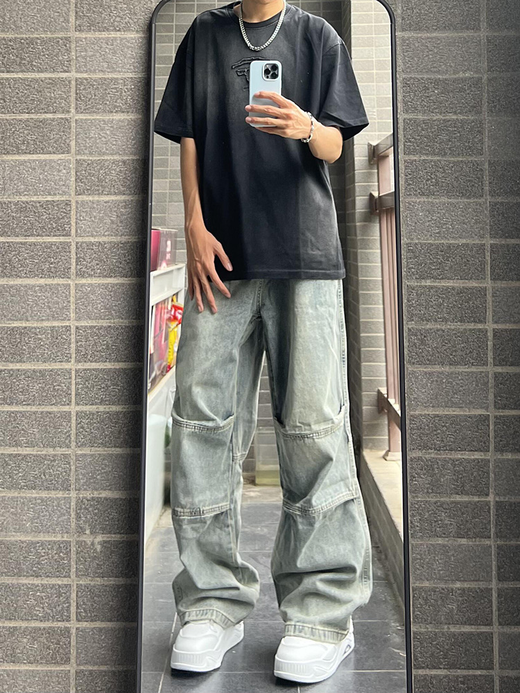 아메리칸 스타일 빈티지 세탁 툴링 청바지 남성용 스티칭 스트레이트 와이드 레그 팬츠 트렌디 브랜드 하이 스트리트 강아지 잘 생긴 긴 바지스토어 가기