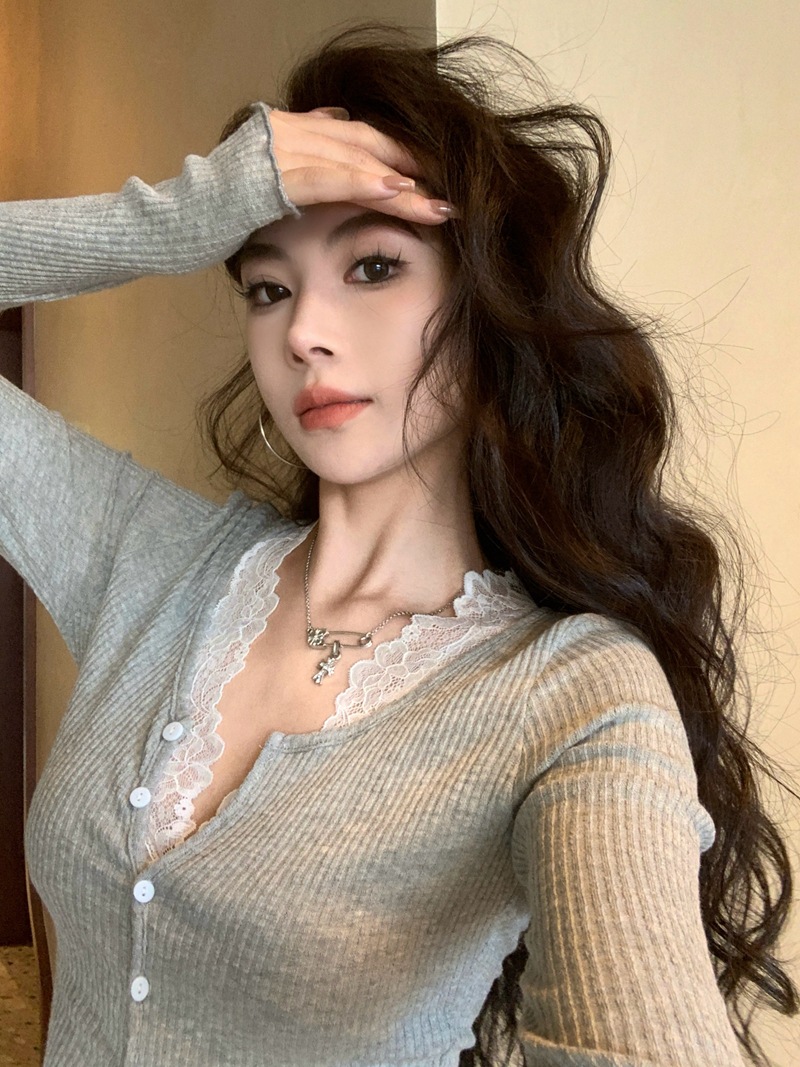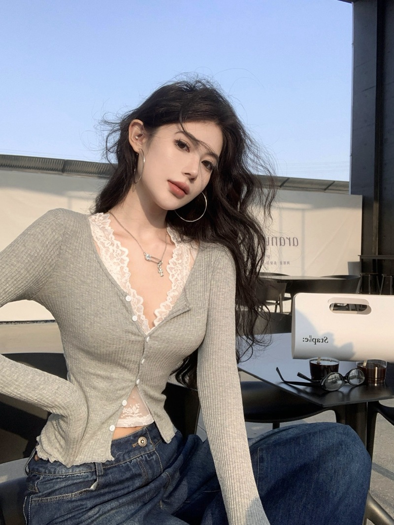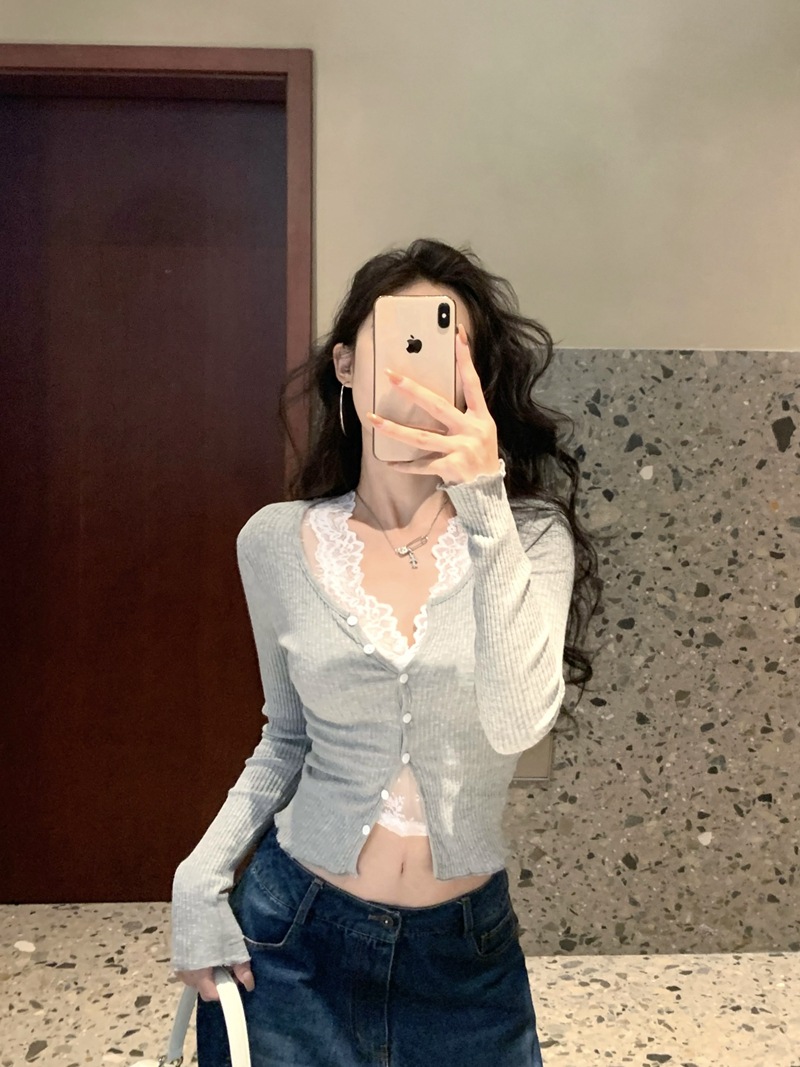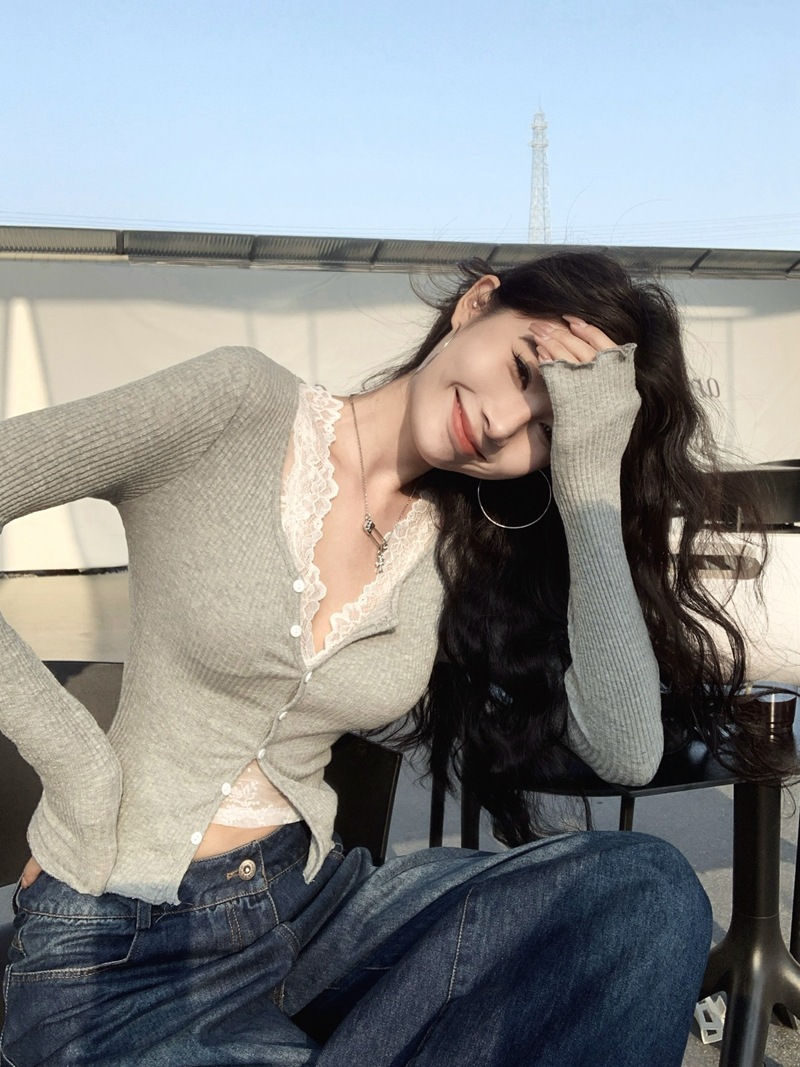 핫 걸 스타일 V 넥 긴팔 카디건 여성 가을 한국 스타일 슬림 핏 타이트 올 매치 그레이 짧은 슬림 핏 스택 탑