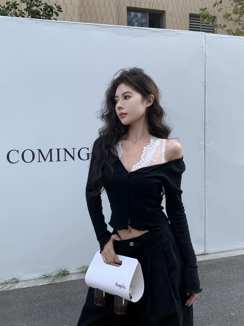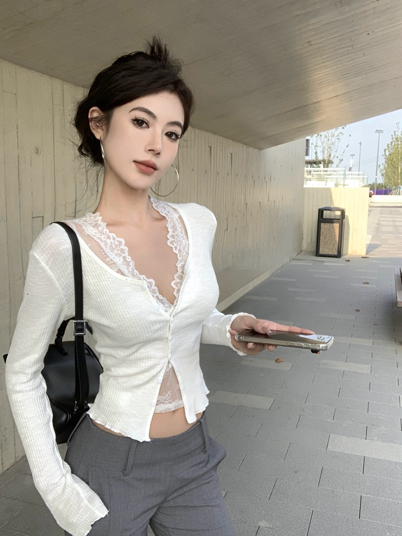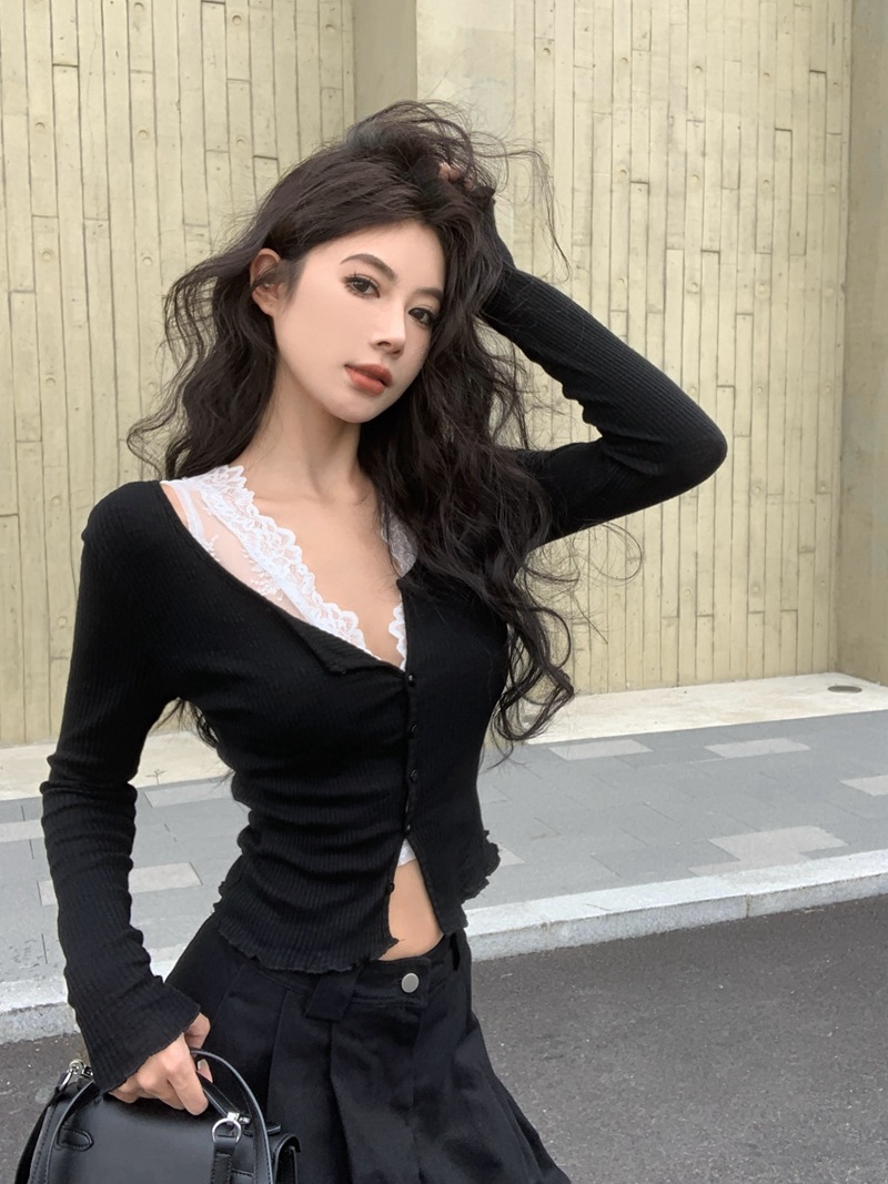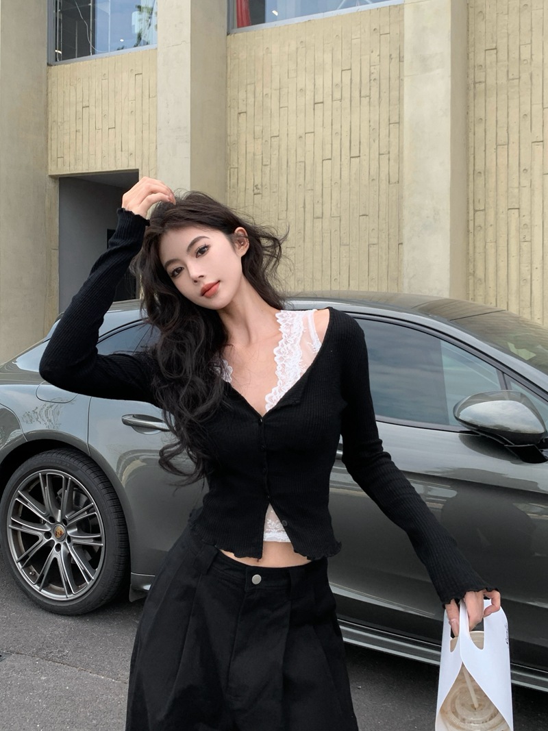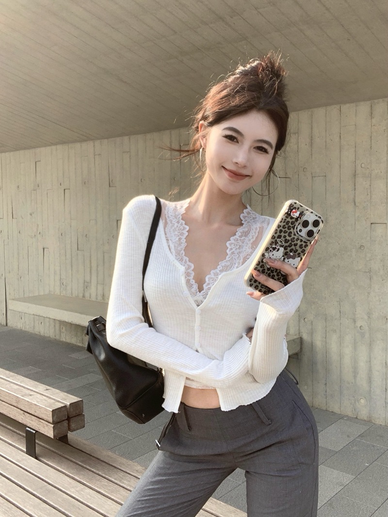 핫 걸 스타일 V 넥 긴팔 카디건 여성 가을 한국 스타일 슬림 핏 타이트 올 매치 그레이 짧은 슬림 핏 스택 탑