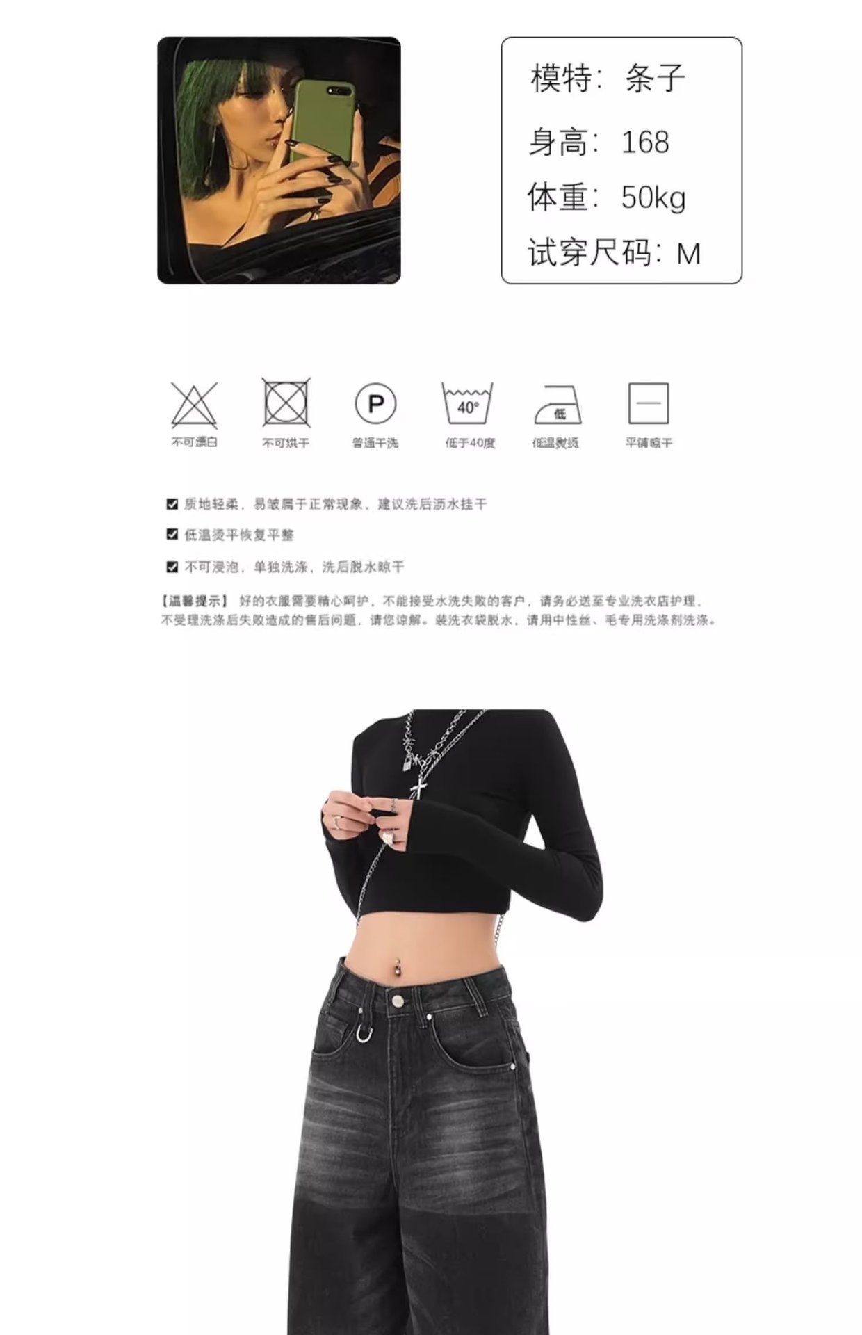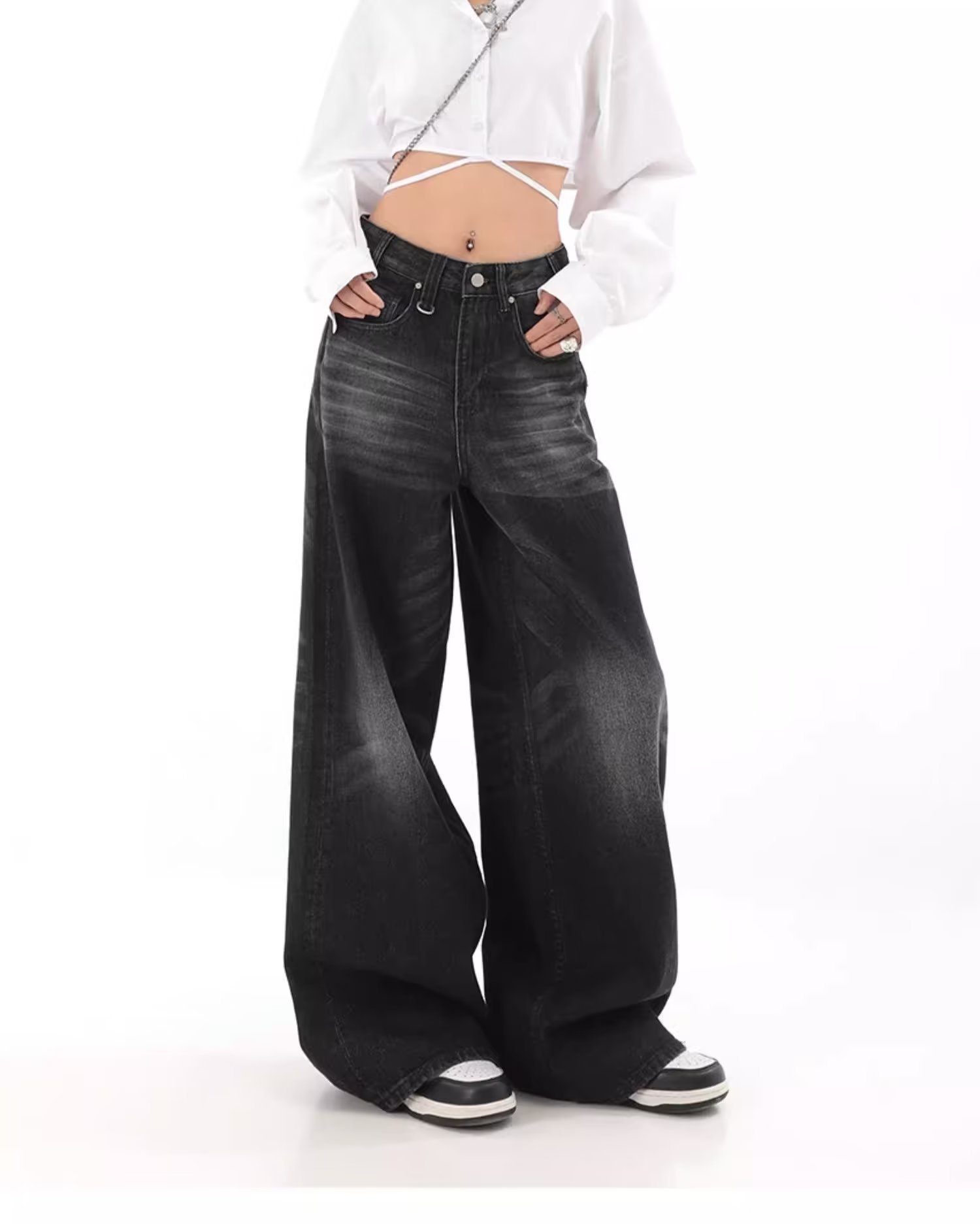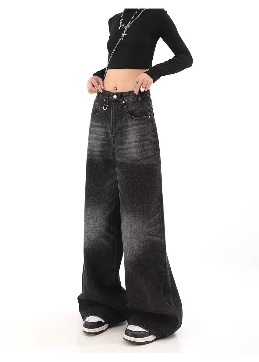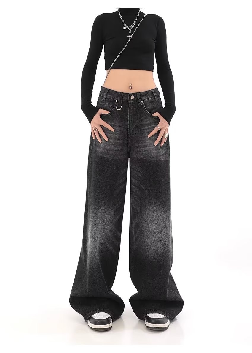 复古水洗做旧黑色阔腿牛仔裤女秋季新款高腰宽松直筒拖地长裤子潮