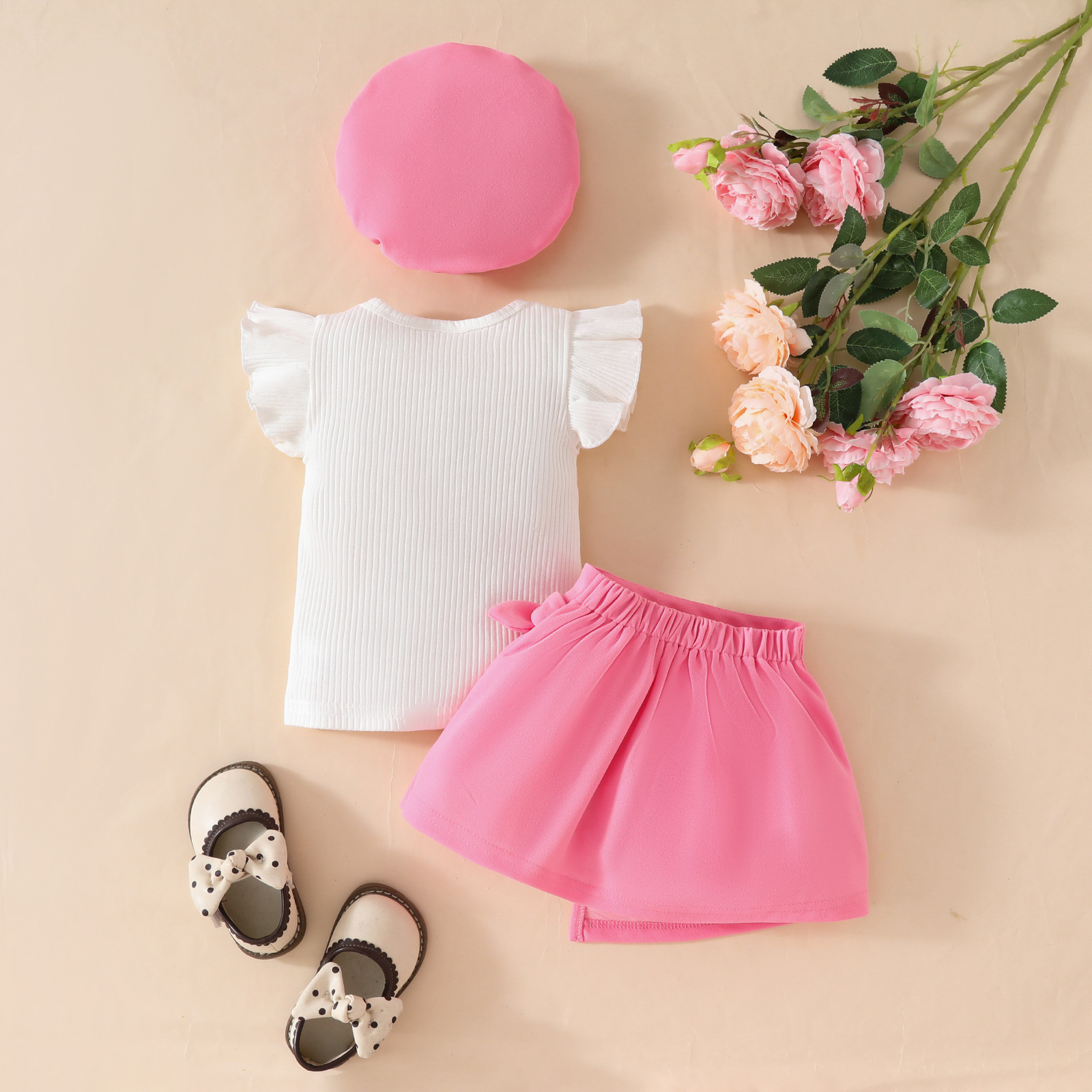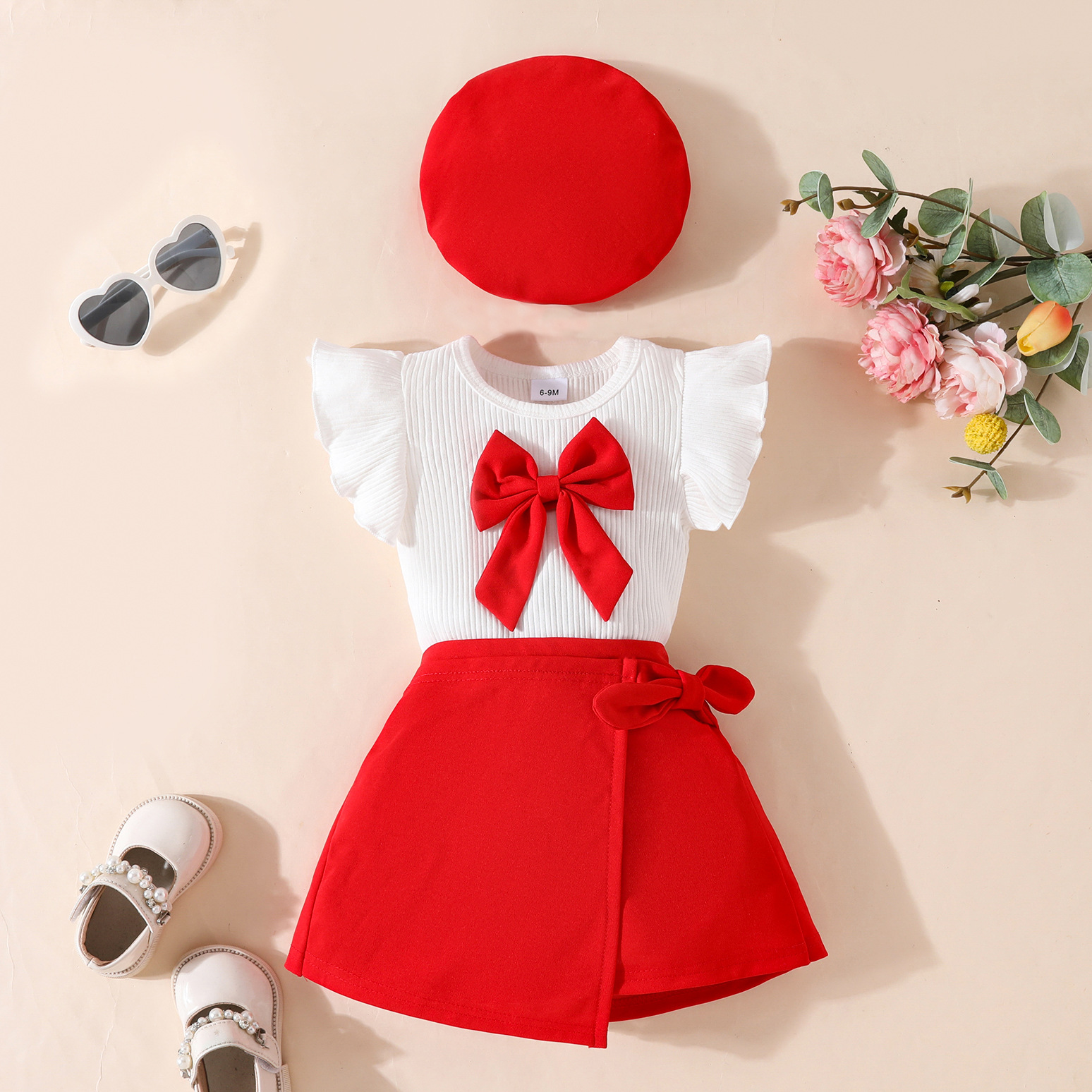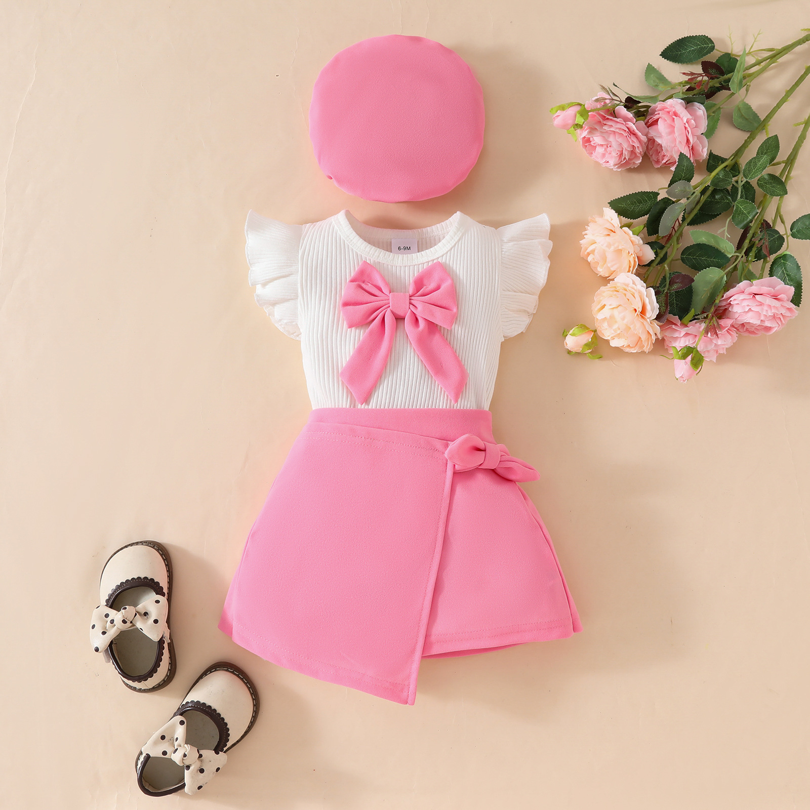 2025 여름 패션 유아 소녀 큰 활 베레모 민소매 탑 레이스 스커트 3 종 세트스토어 가기