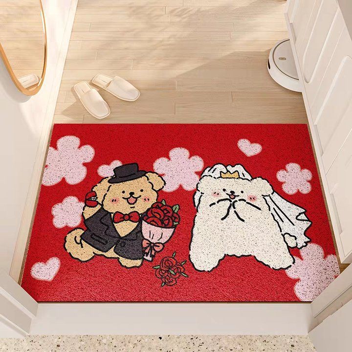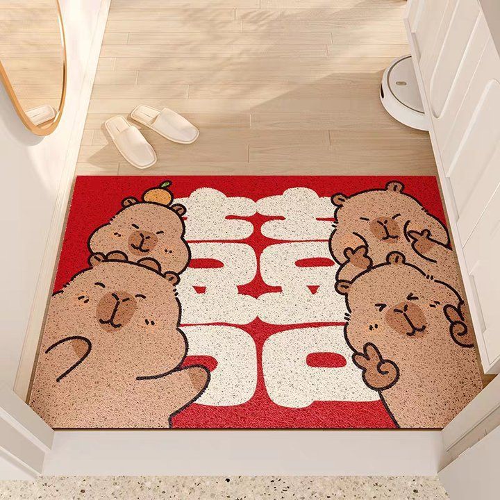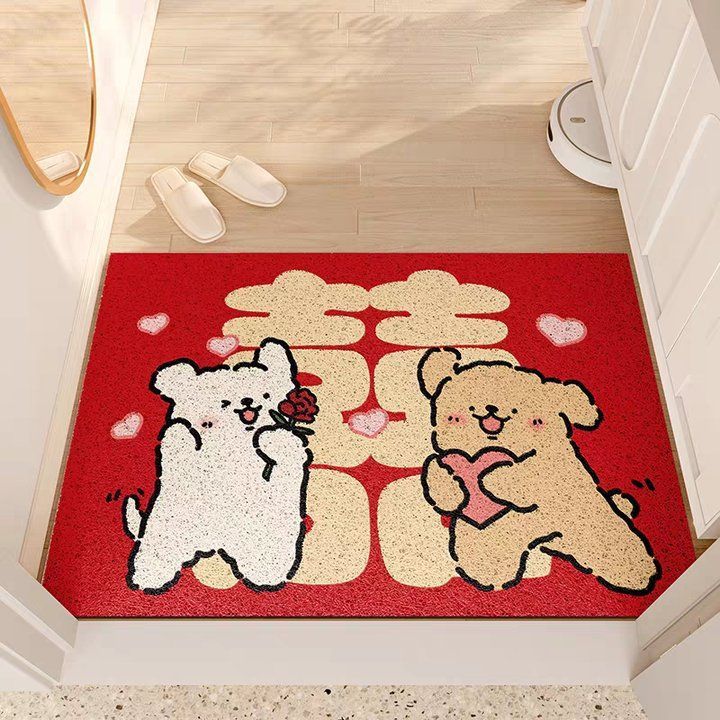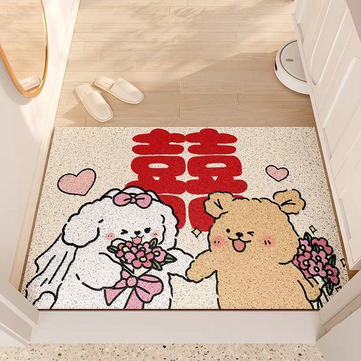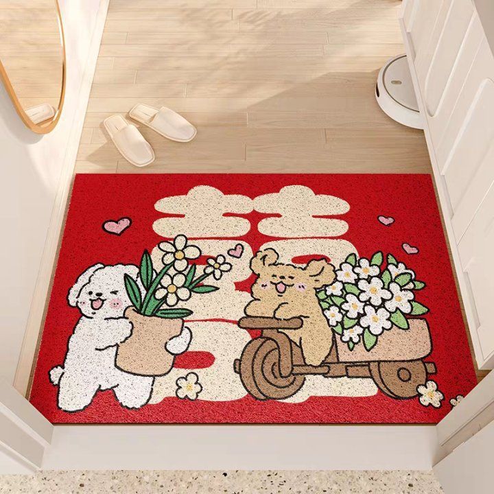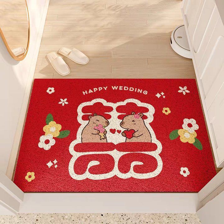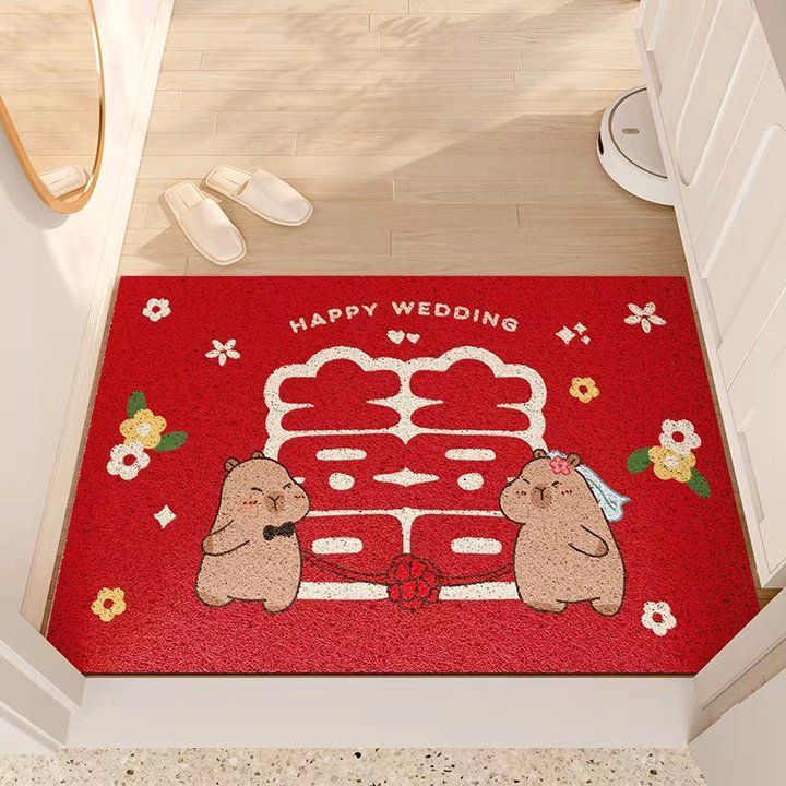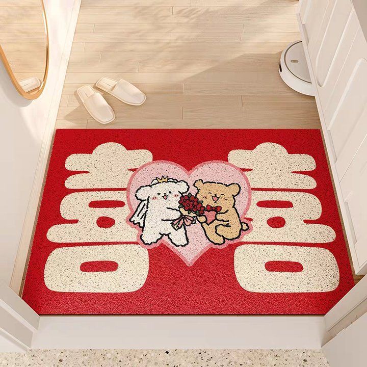웨딩 축제 실크 서클 플로어 매트 입구 미끄럼 방지 토양 마찰 발 매트 레드 해피 캐릭터 웨딩 룸 도어 카펫