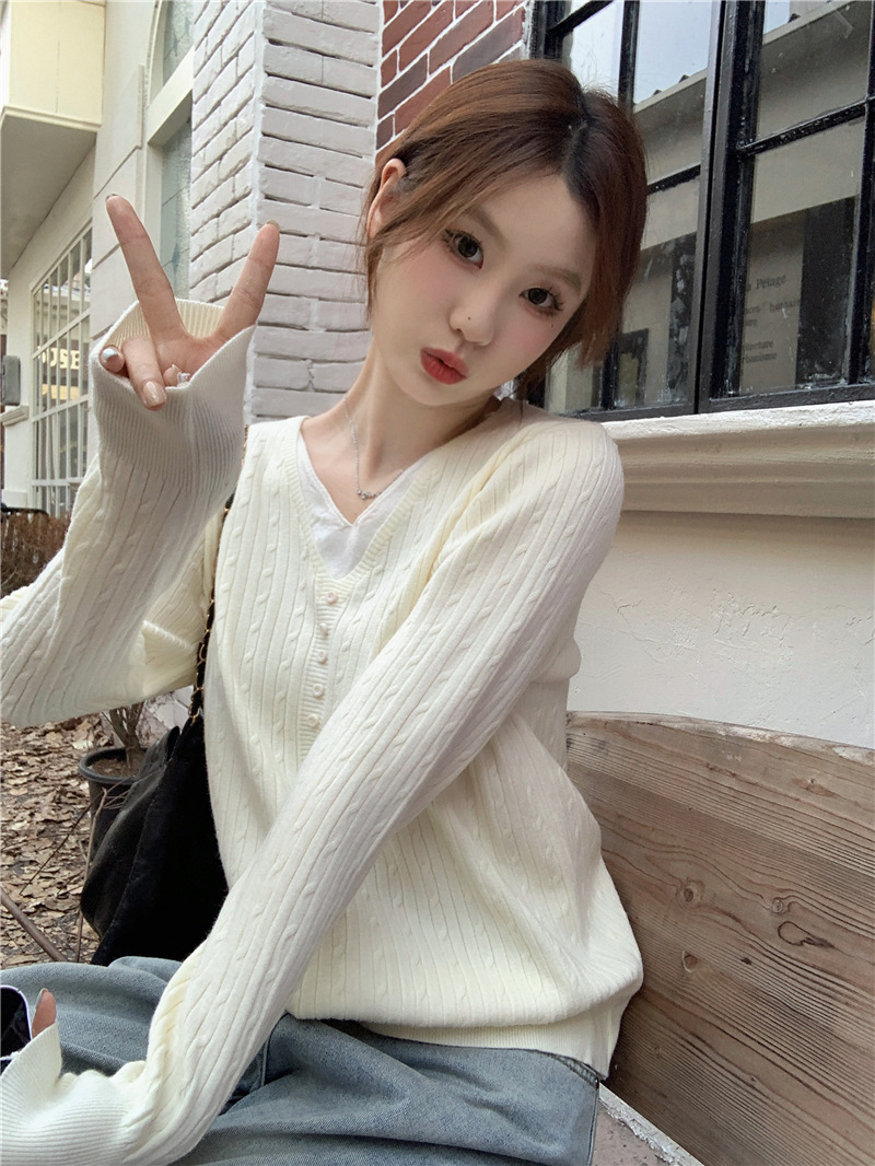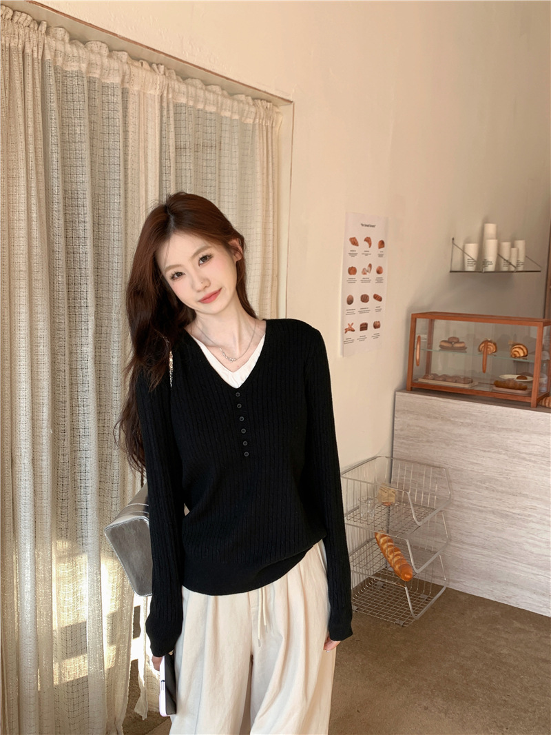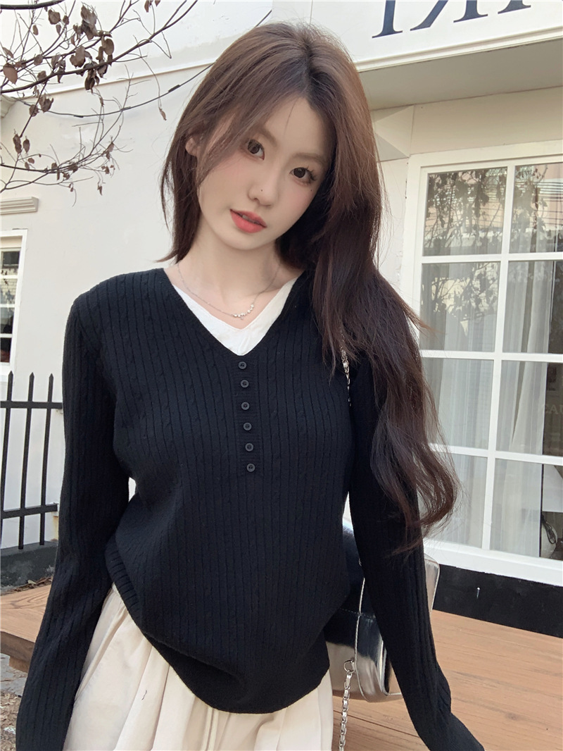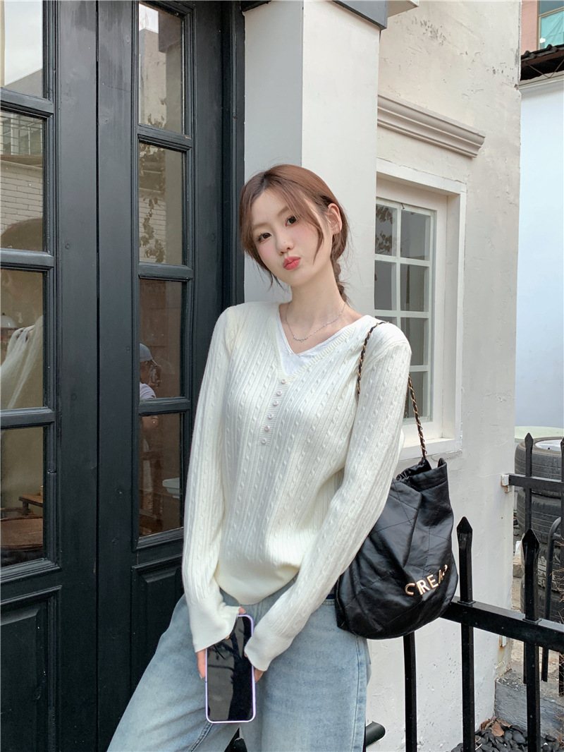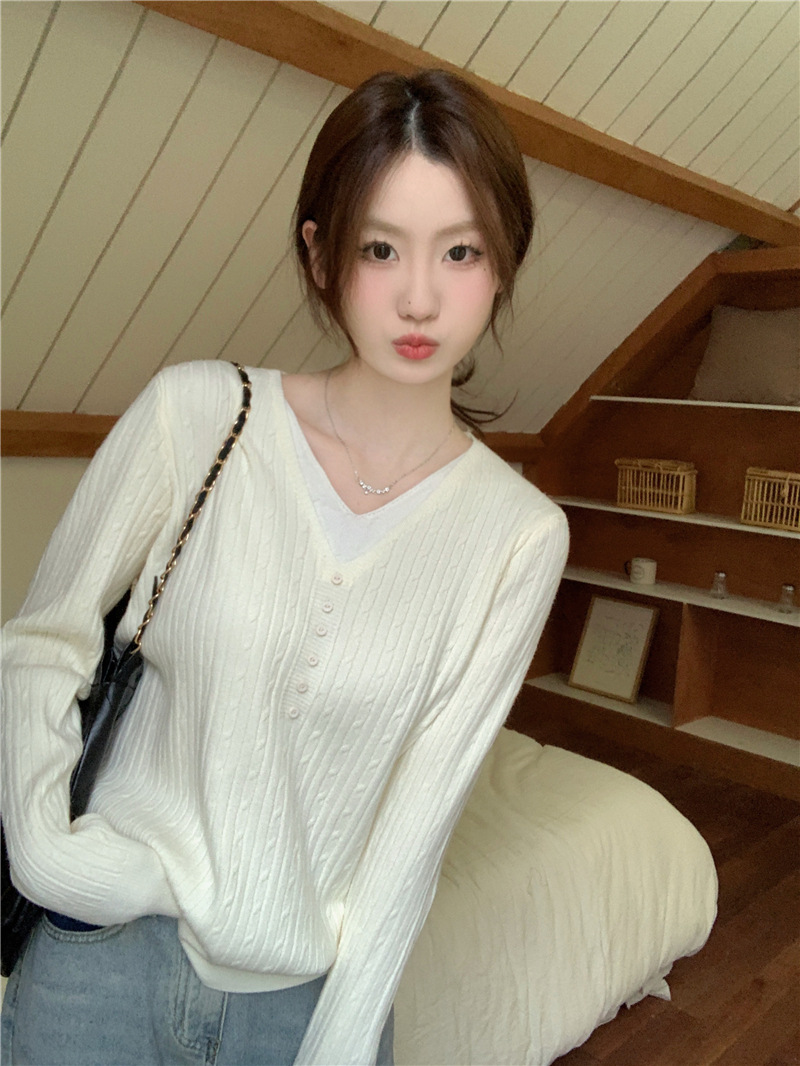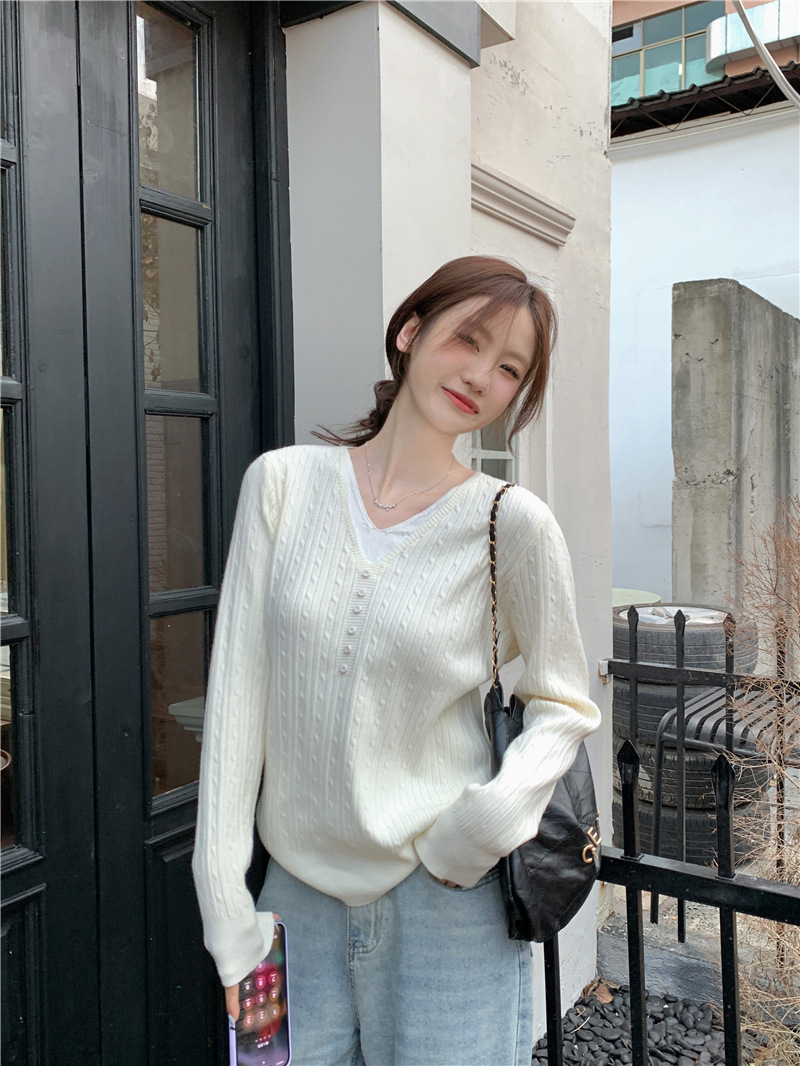 가짜 투피스 이너 니트 셔츠 여성베이스 셔츠 가을과 겨울 새 스타일 샤넬 스타일 아우터 살구색 V 넥 스웨터 여성용 탑스토어 가기