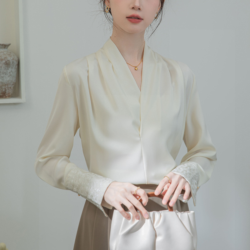 우아한 흰색 긴팔 쉬폰 셔츠 국가 스타일 말 얼굴 스커트 새로운 중국 V 넥 셔츠와 여성의 새로운 탑스토어 가기