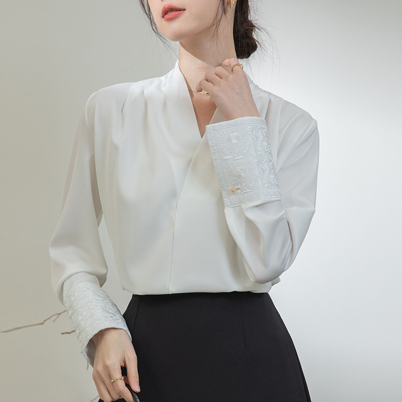 우아한 흰색 긴팔 쉬폰 셔츠 국가 스타일 말 얼굴 스커트 새로운 중국 V 넥 셔츠와 여성의 새로운 탑