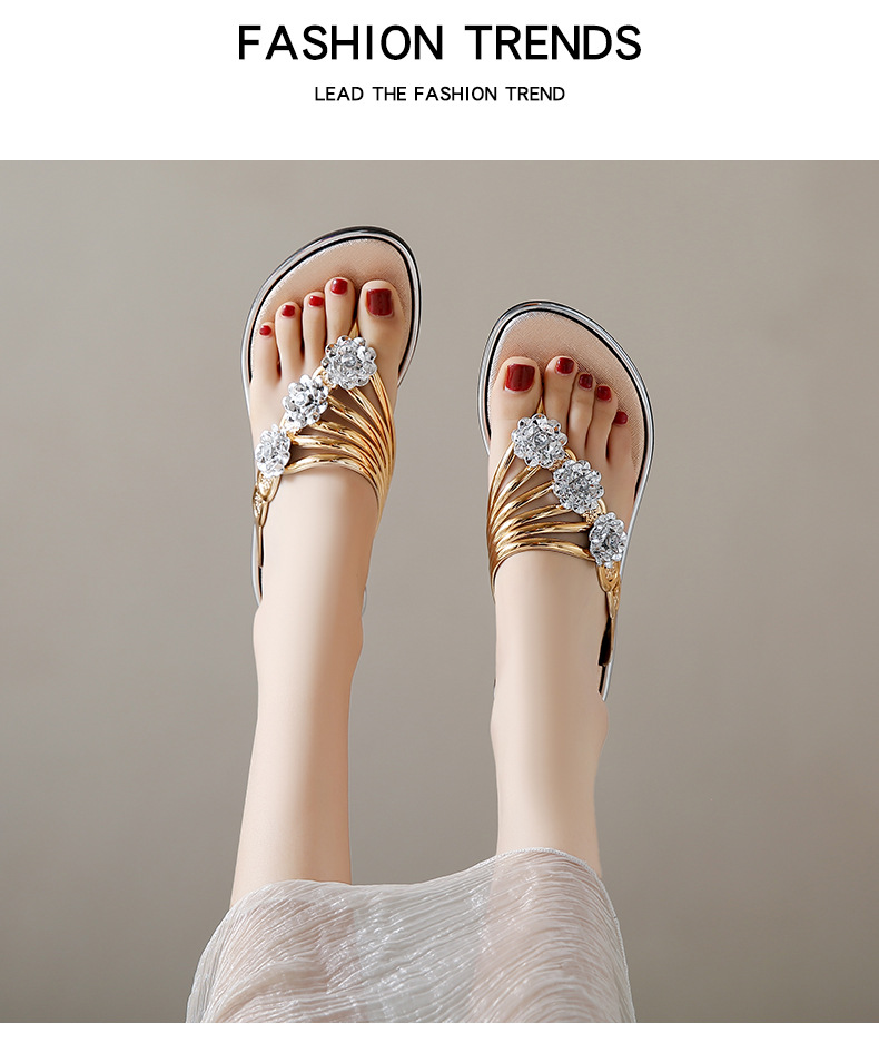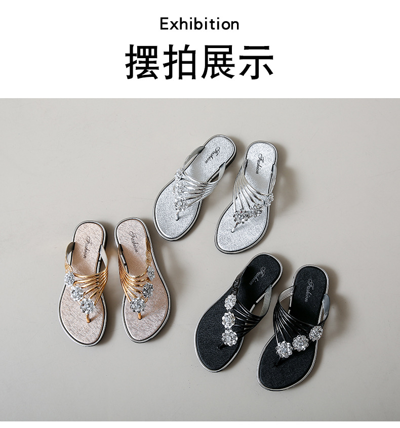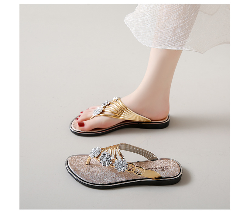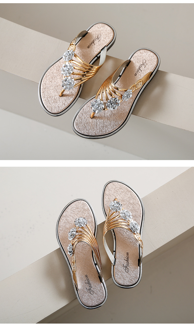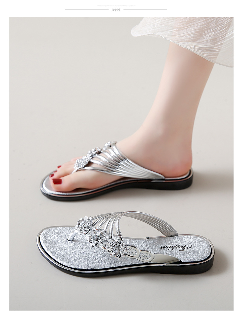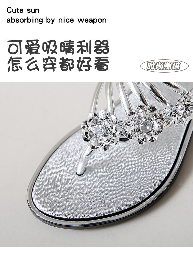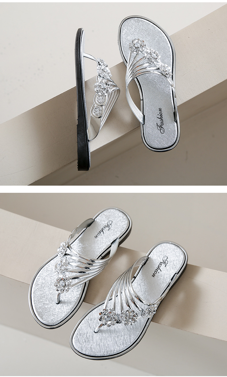 대외 무역 플립 플롭 여성 슬리퍼 여름 평면 바닥 3 꽃 다이아몬드 실버 클램프 신발 비치 샌들 여성