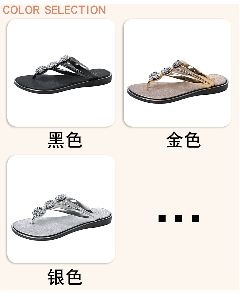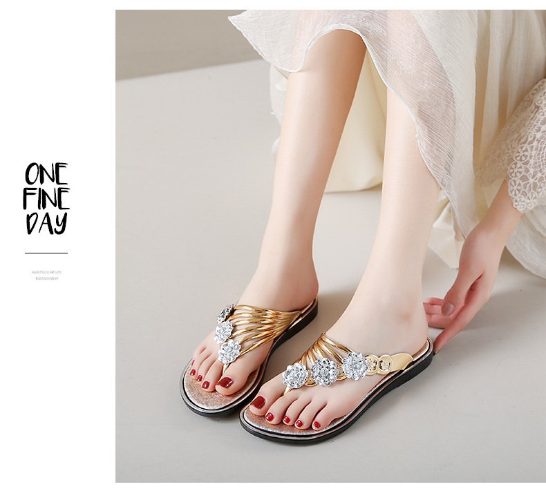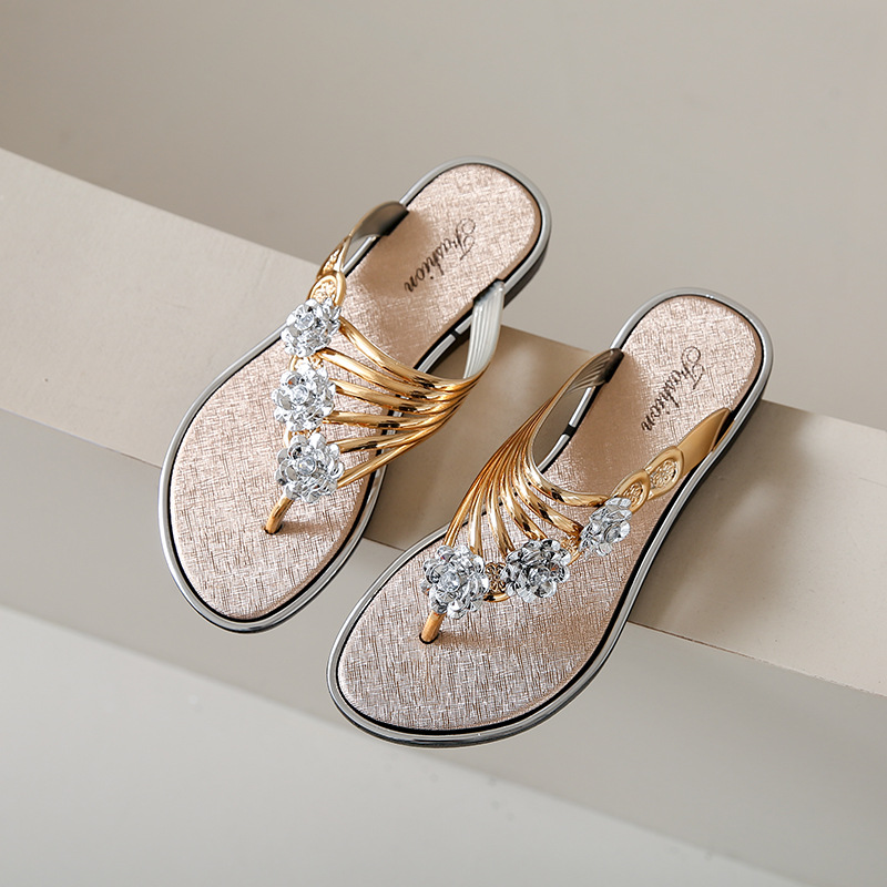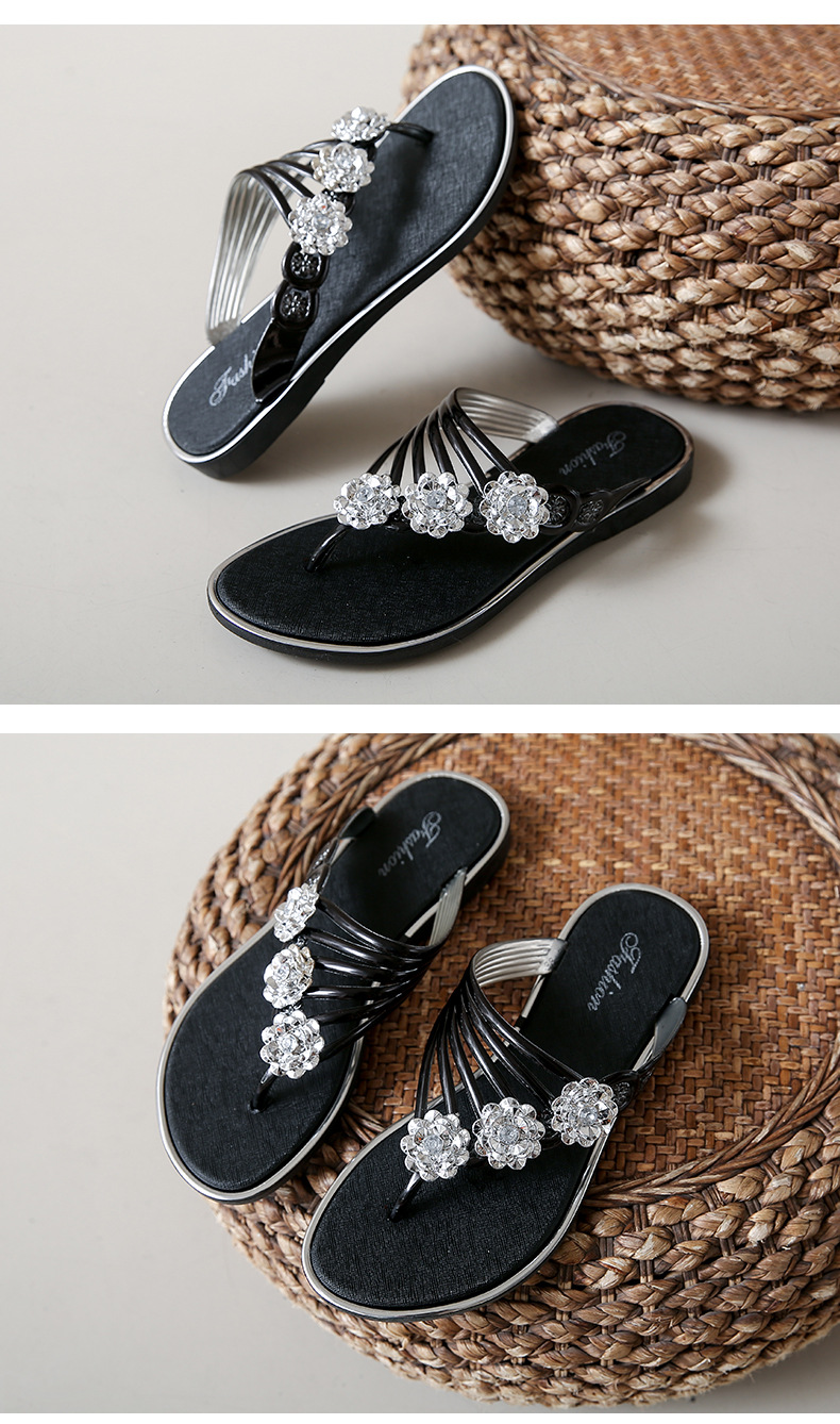 대외 무역 플립 플롭 여성 슬리퍼 여름 평면 바닥 3 꽃 다이아몬드 실버 클램프 신발 비치 샌들 여성스토어 가기