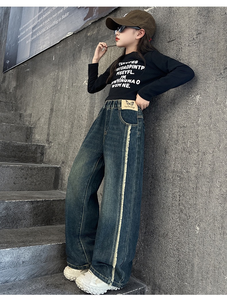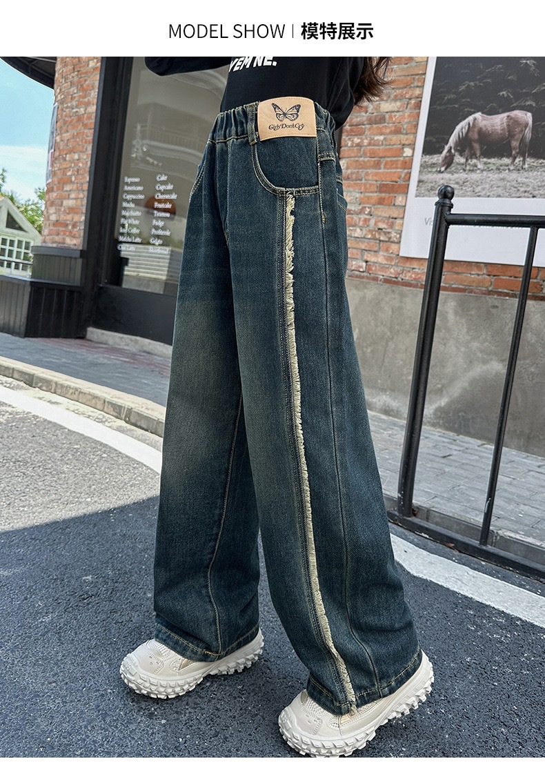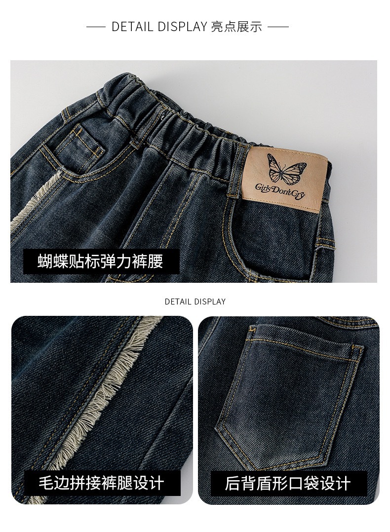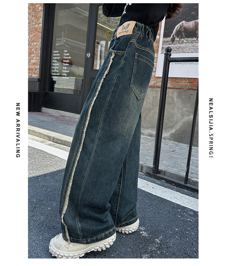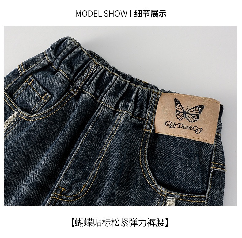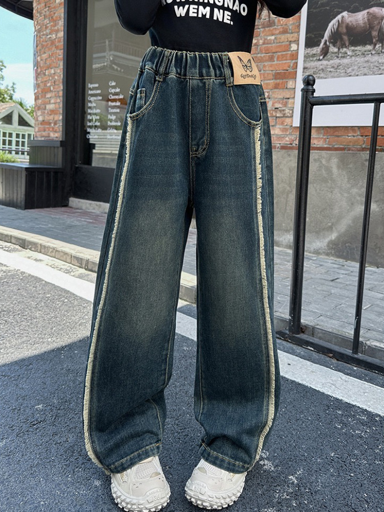 여아 봄 아동복 2025 새로운 스타일 한국식 로우 엣지 청바지 나비 라벨 루즈 와이드 팬츠 트렌디스토어 가기