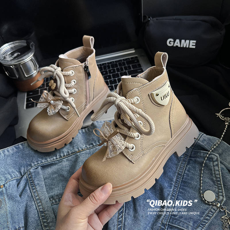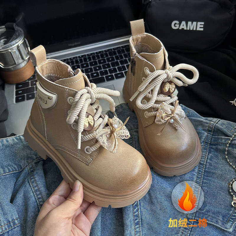겨울 기모 어린이 코튼 부츠 정품 가죽 걸스 한국 스타일 Bowknot 마틴 부츠 패션 보이즈 가죽 부츠 베이비 부츠