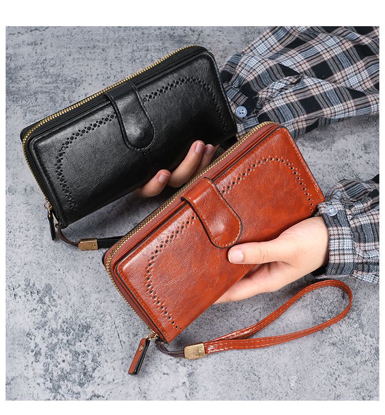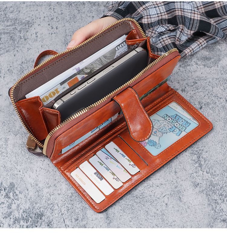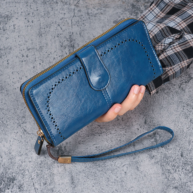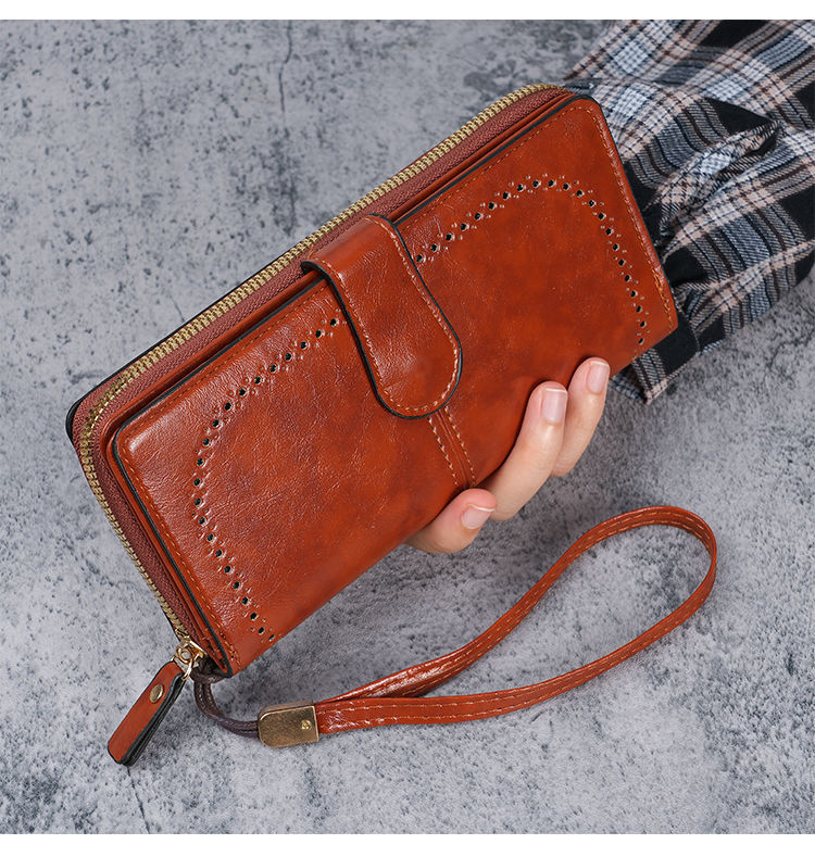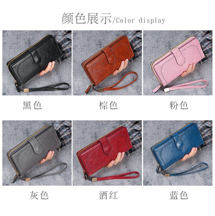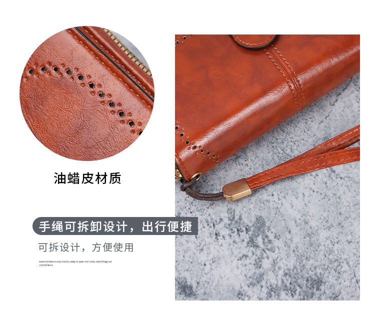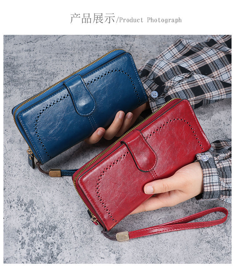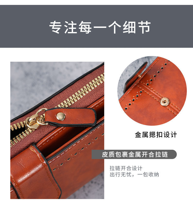 국경을 넘는 라벨 부착 가능한 패션 오일왁스 가죽 여성용 대용량 지갑, 롱 스타일 여성용 지폐 지갑, 다층 지갑스토어 가기