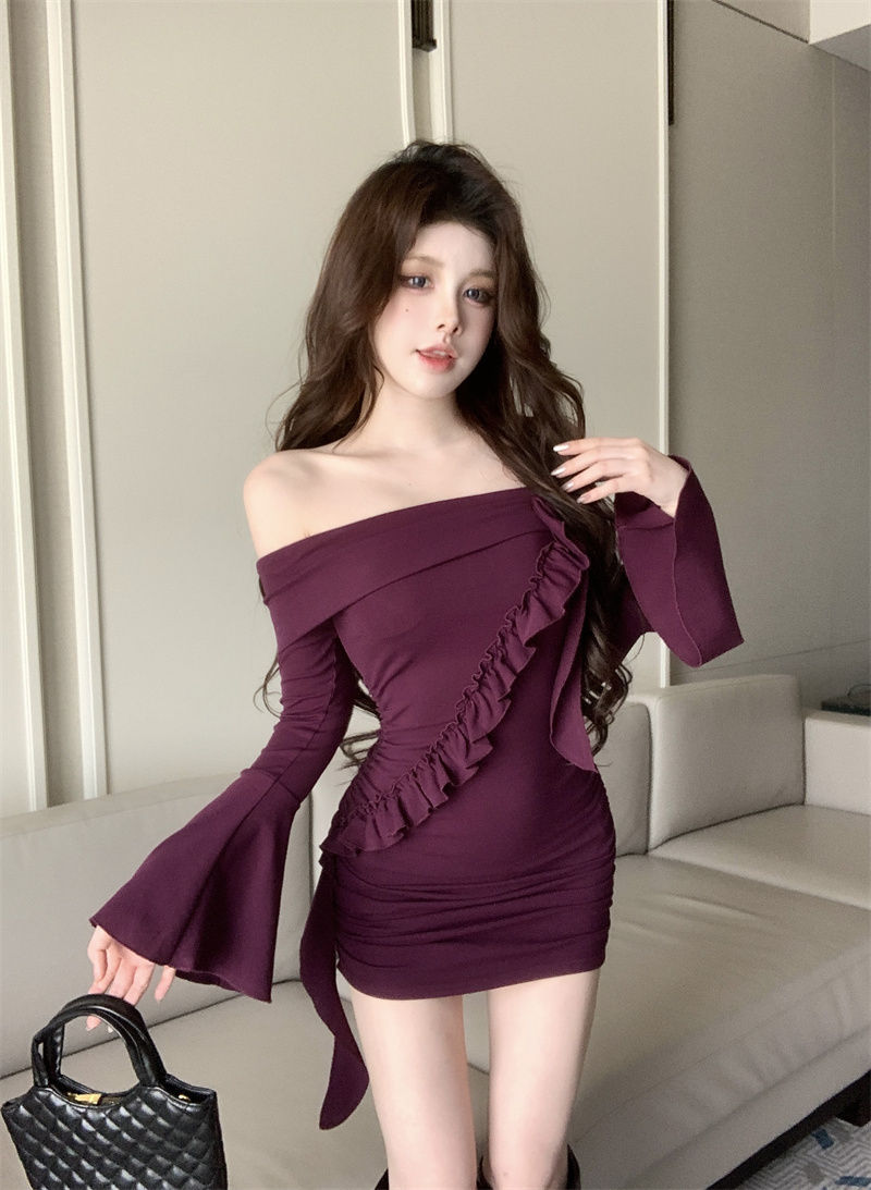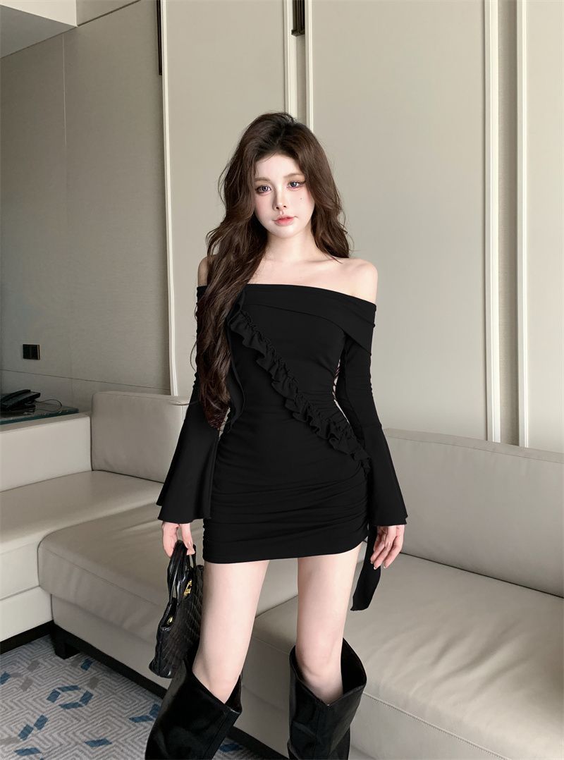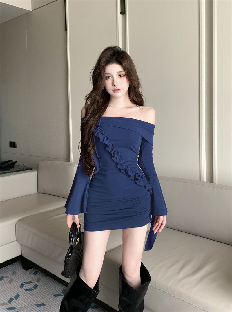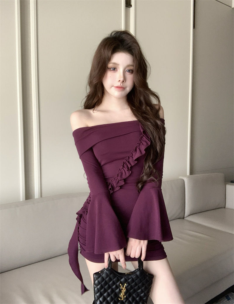 순수한 섹시한 스파이스 소녀 오프 숄더 원피스 여성의 가을과 겨울 새로운 틈새 꽉 끼는 슬리밍 내부 힙합 스커트