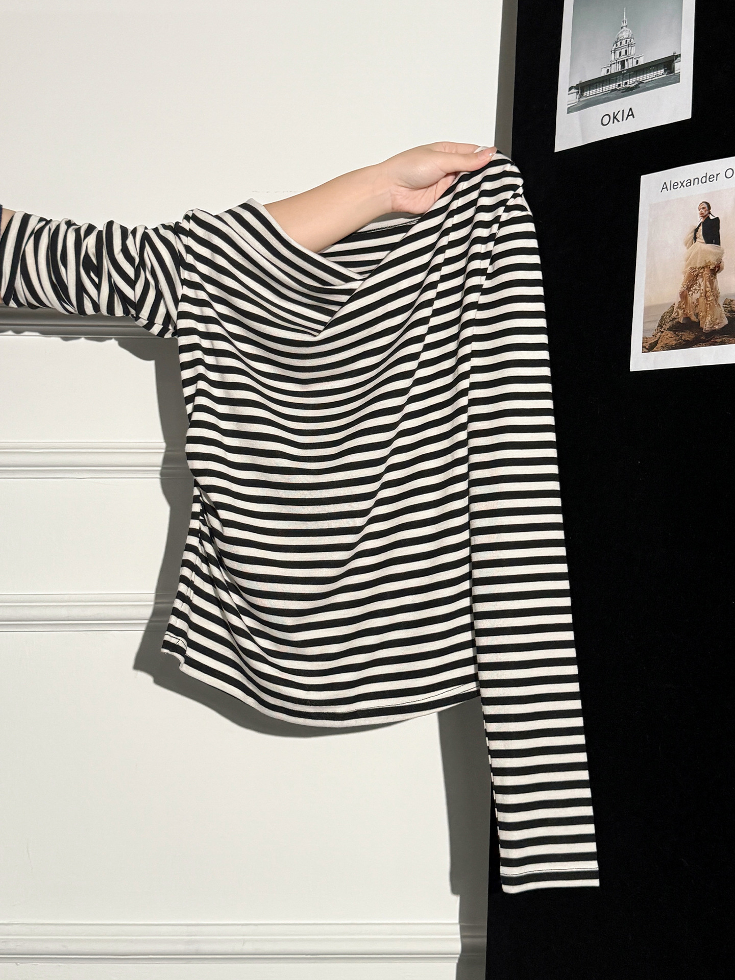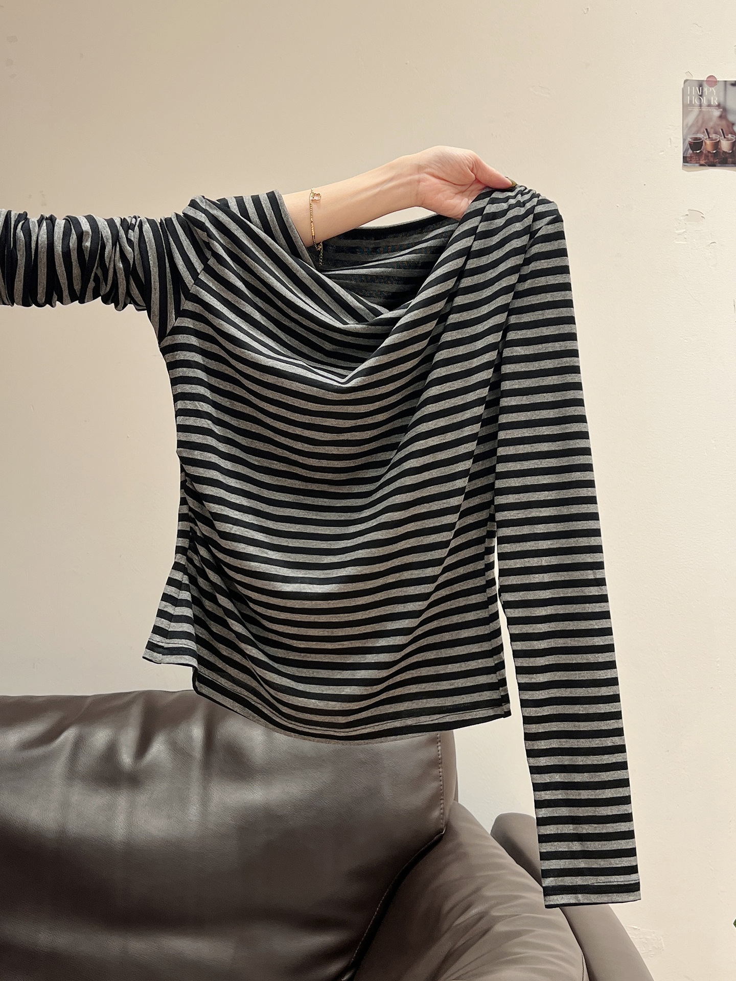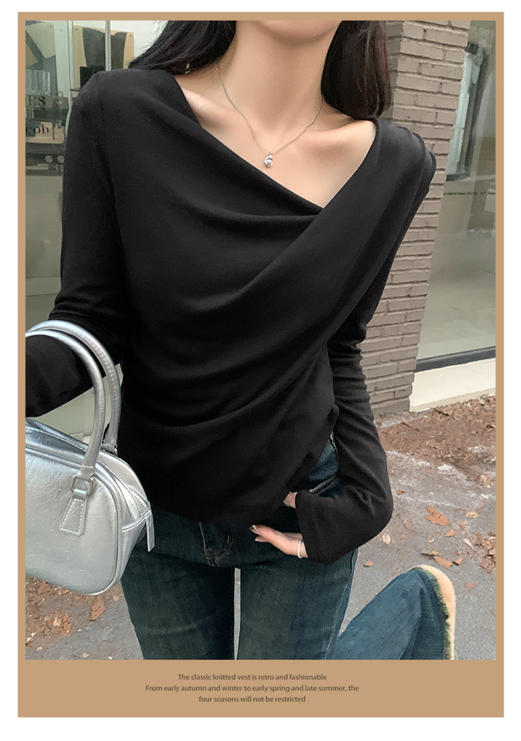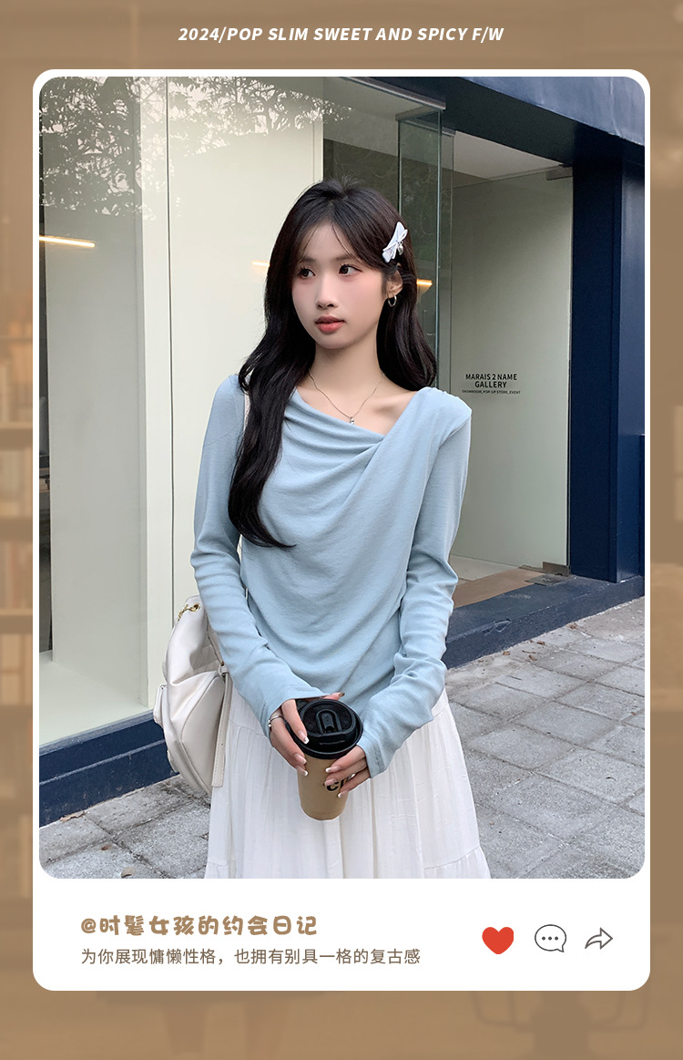 순수한 욕망 한 캐릭터 칼라 어깨 긴팔 스웨터 여성의 가을과 겨울 스윙 칼라 오브리크 숄더 플리트 타이트베이스 탑