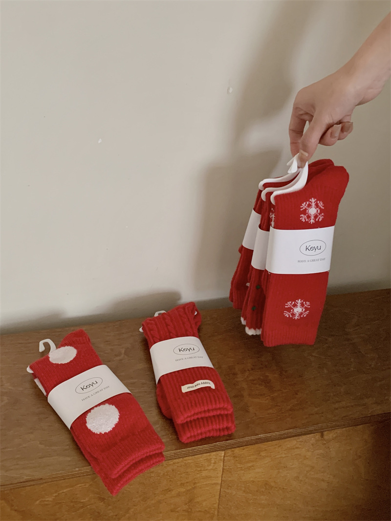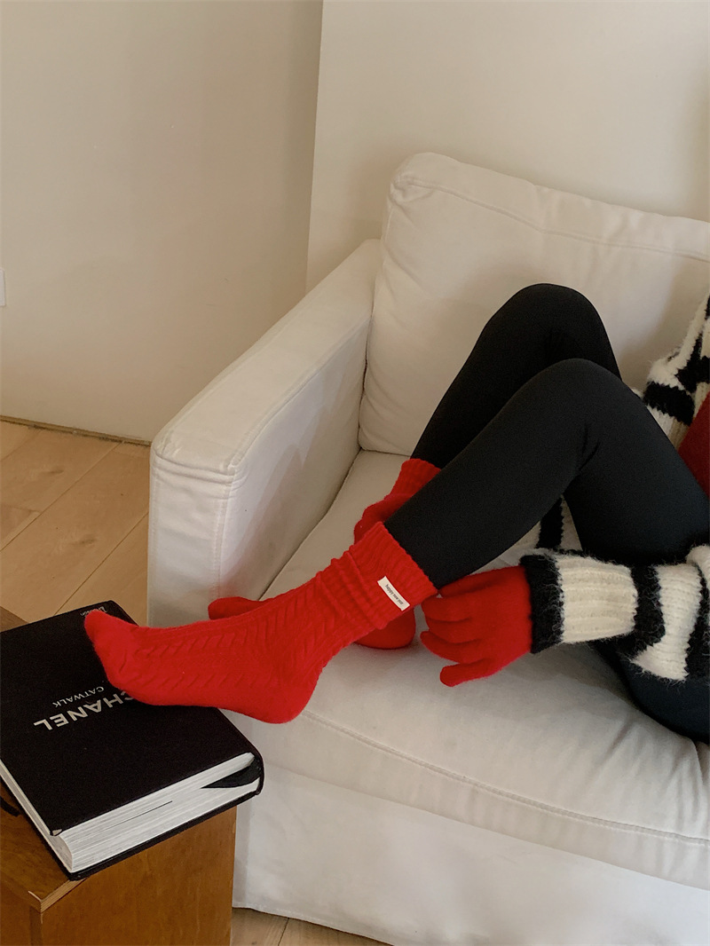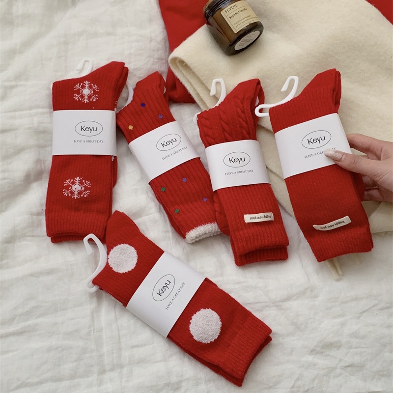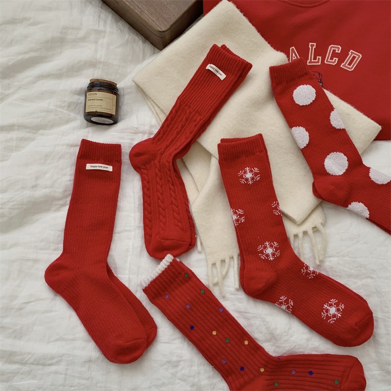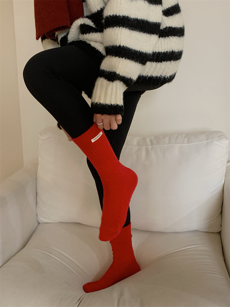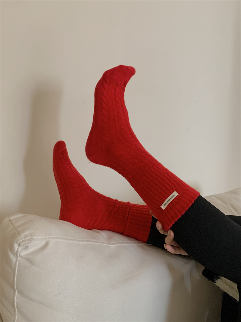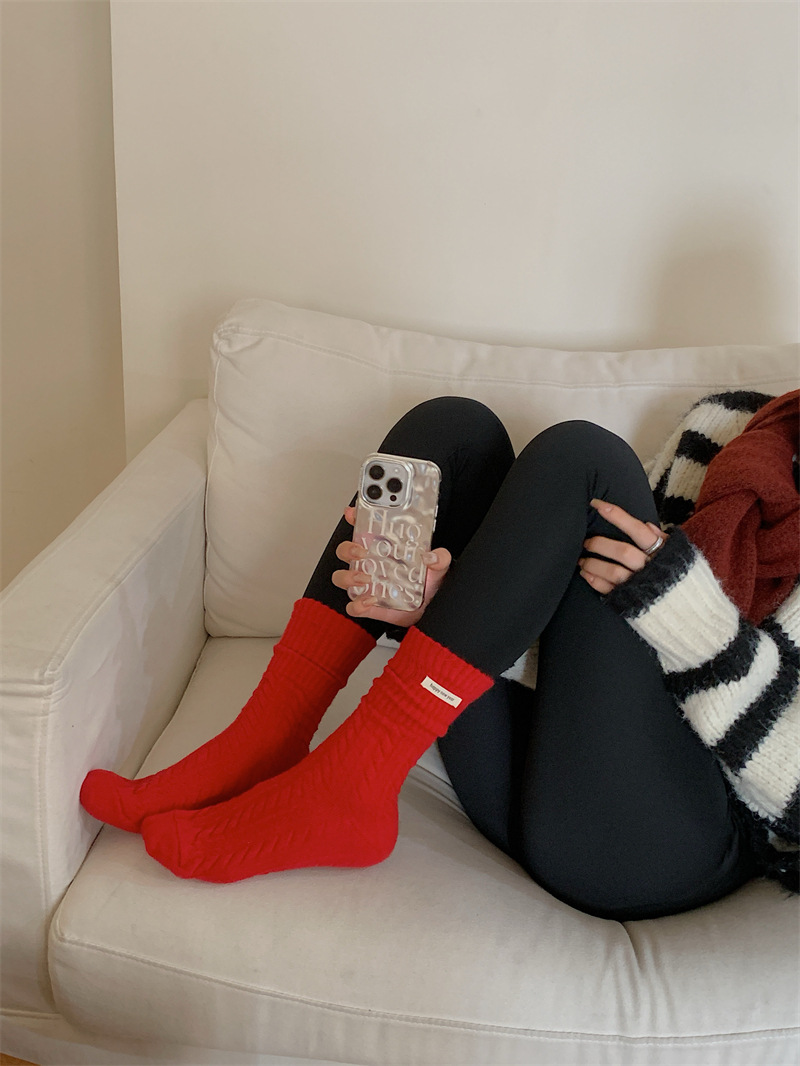"새해 크리스마스 레드" 빨간 양말 여성 천 라벨 중장 양말 가을과 겨울 큰 파도 트위스트 더미 양말스토어 가기