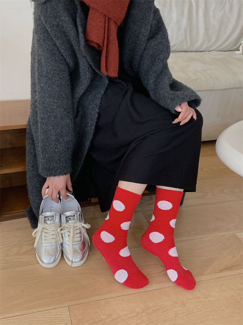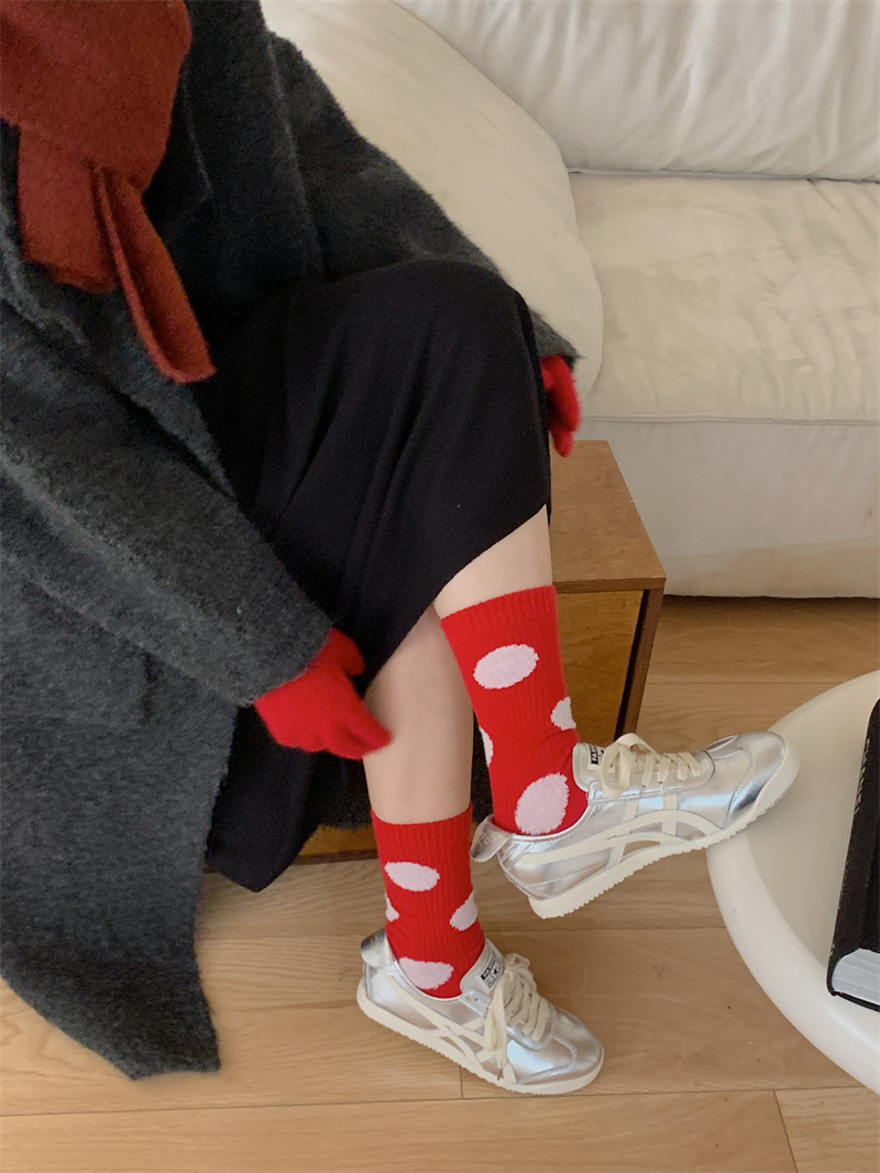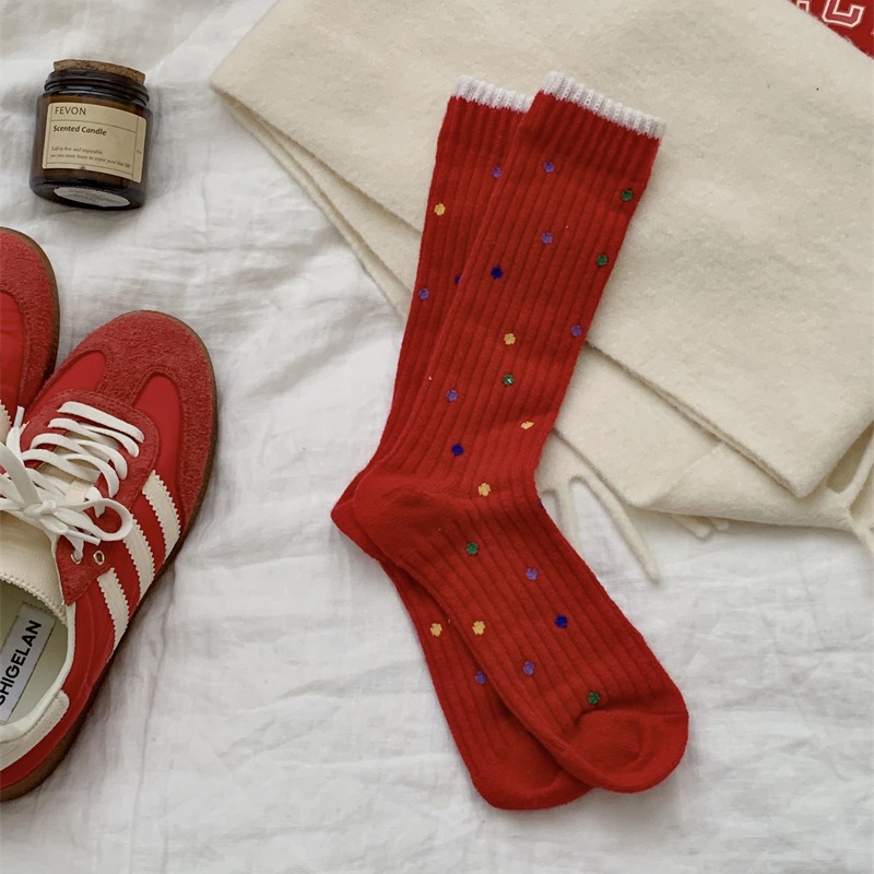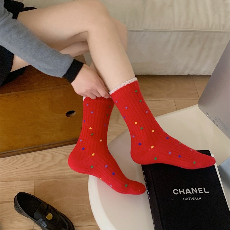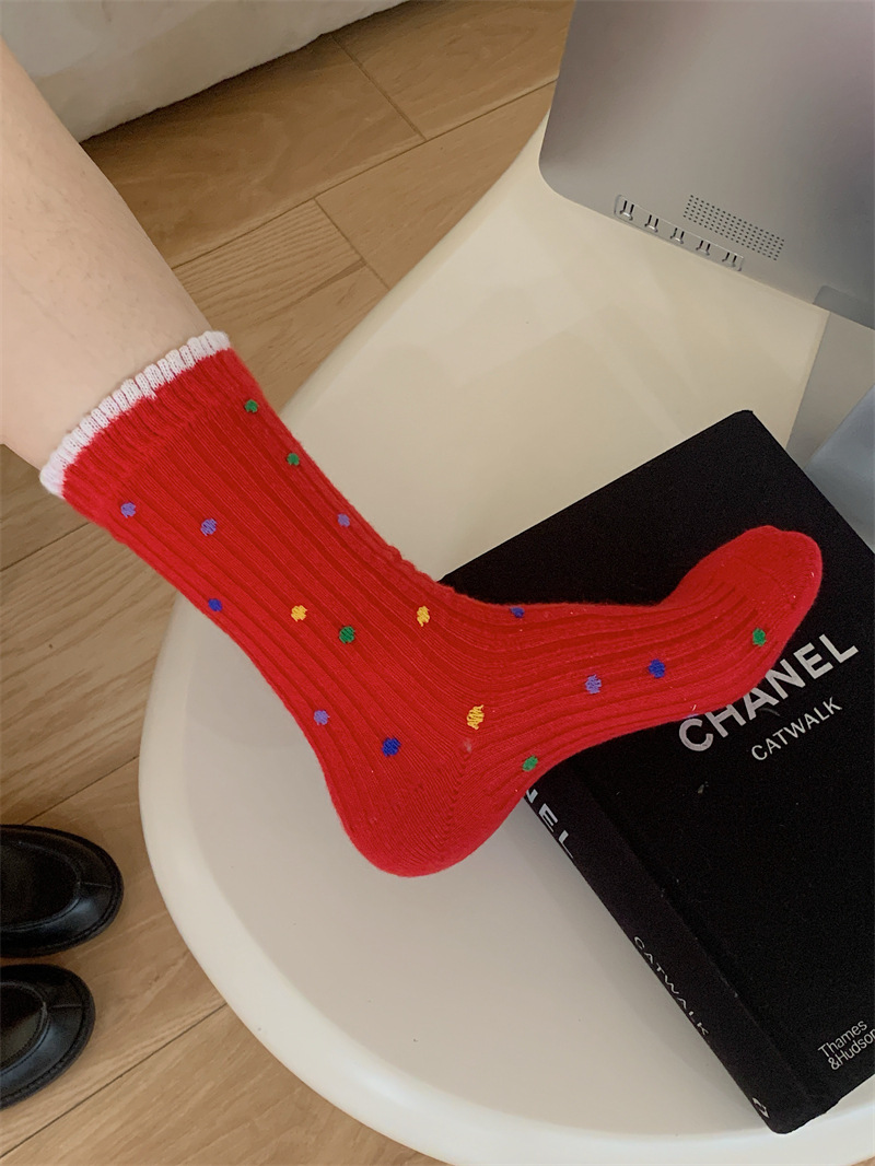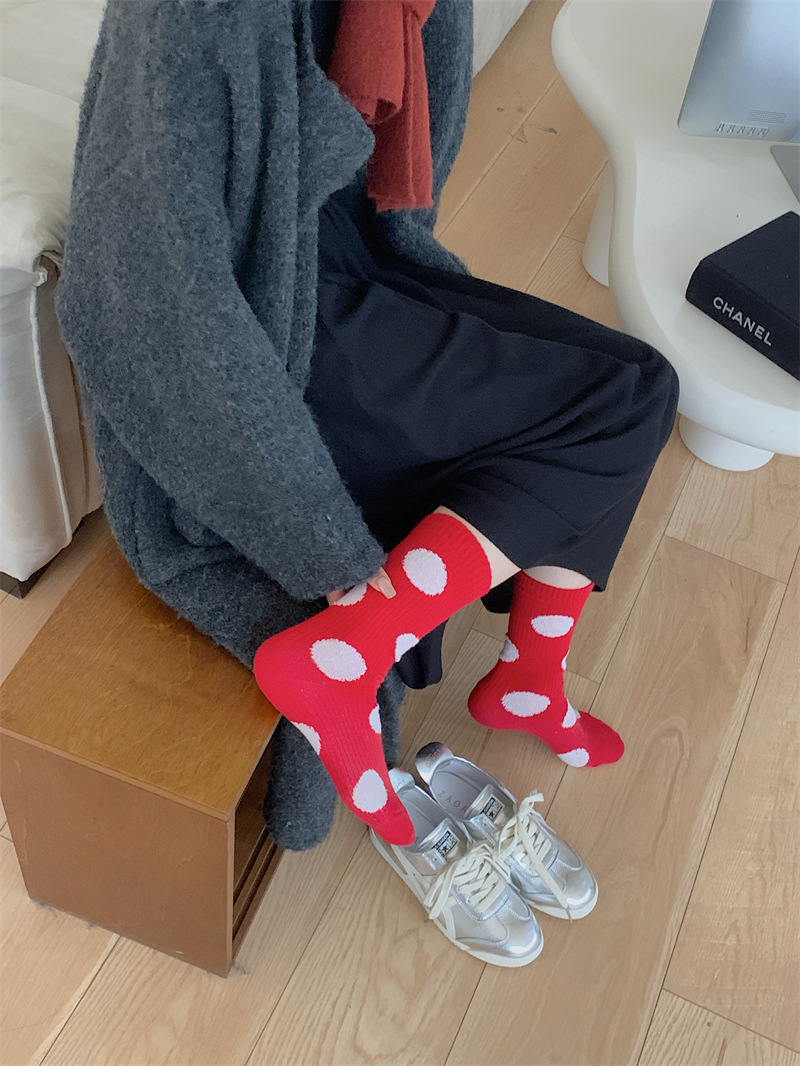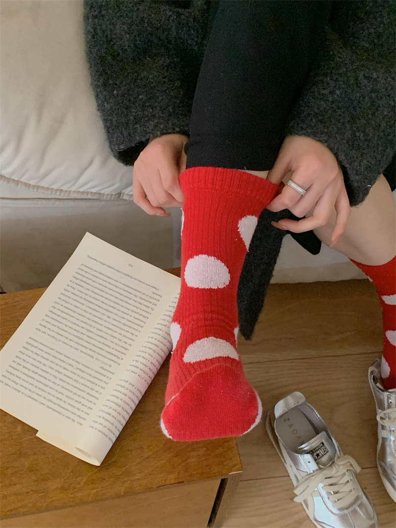 "새해 크리스마스 레드" 빨간 양말 여성 천 라벨 중장 양말 가을과 겨울 큰 파도 트위스트 더미 양말스토어 가기