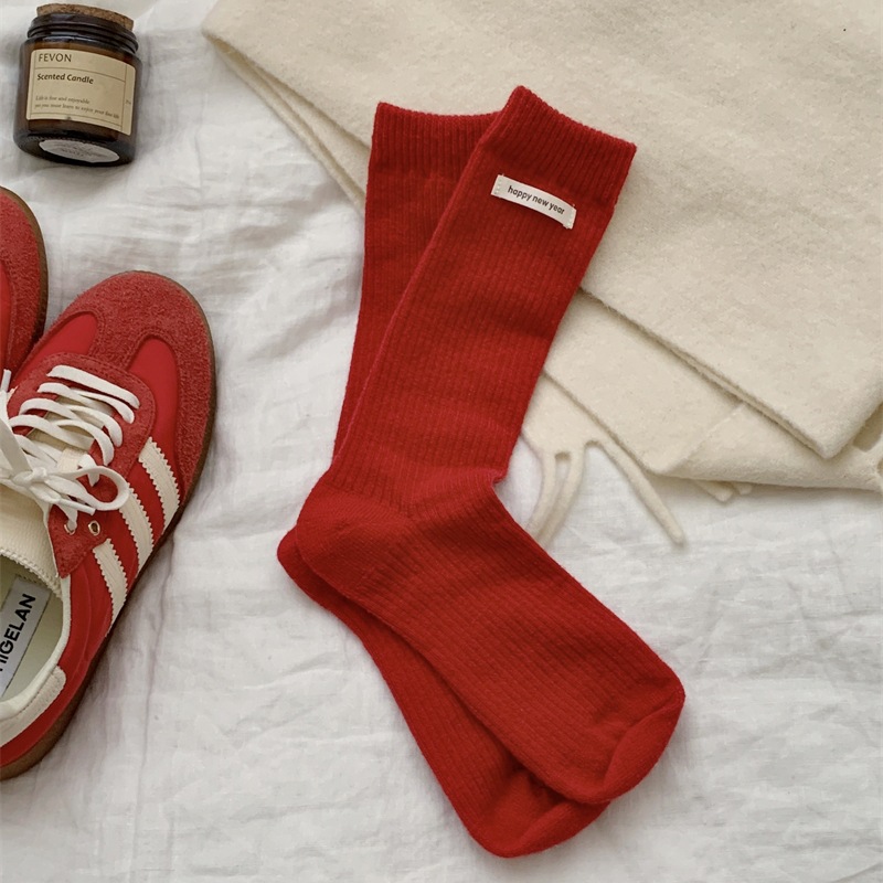 "새해 크리스마스 레드" 빨간 양말 여성 천 라벨 중장 양말 가을과 겨울 큰 파도 트위스트 더미 양말