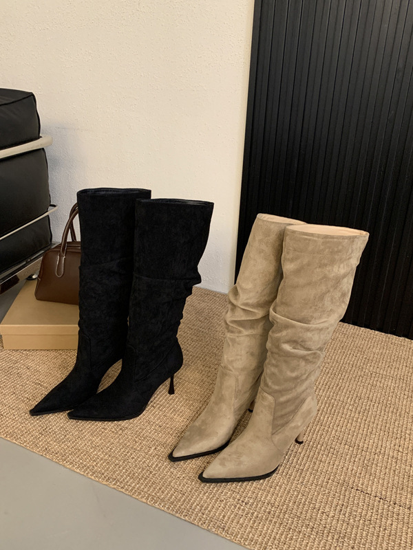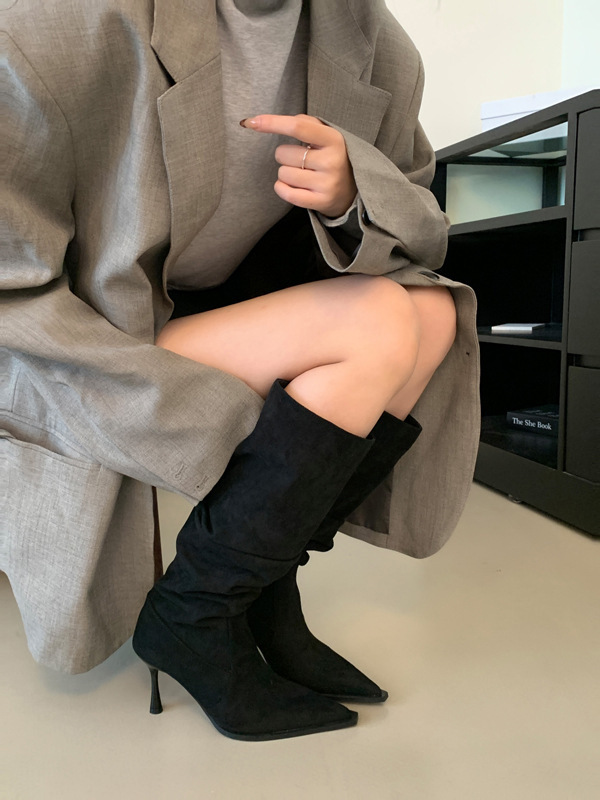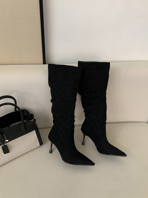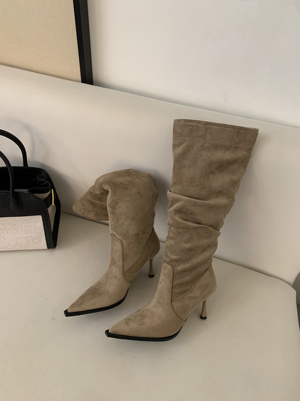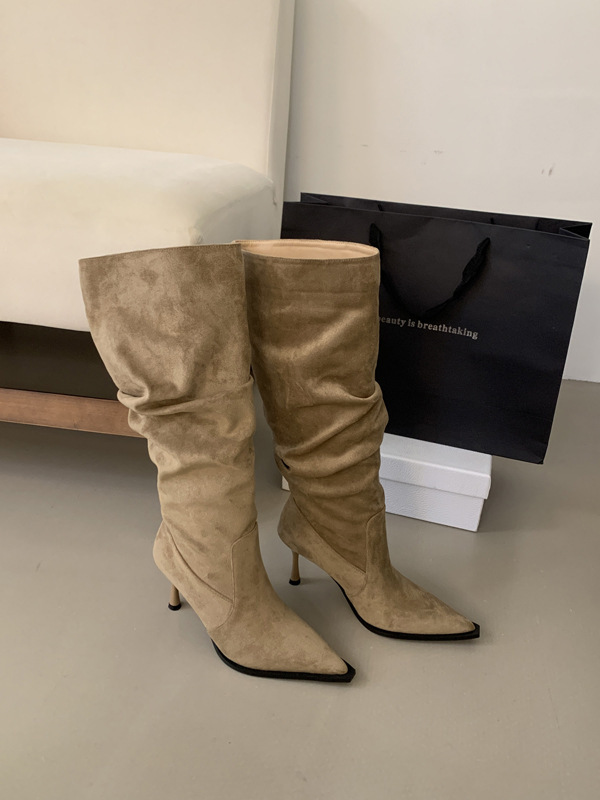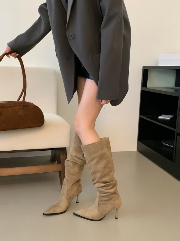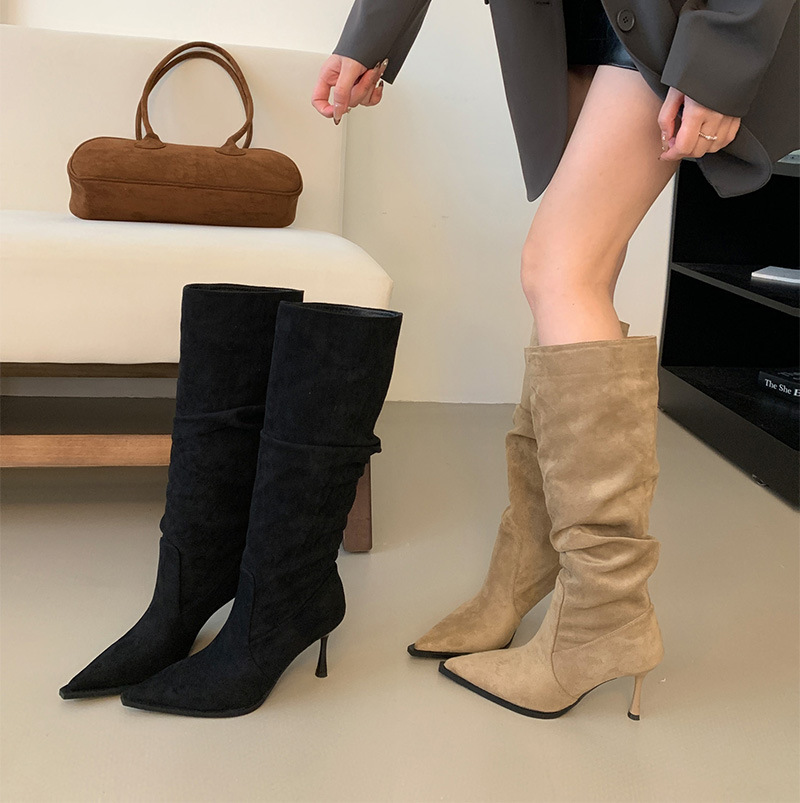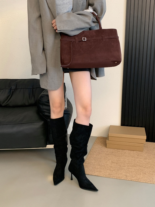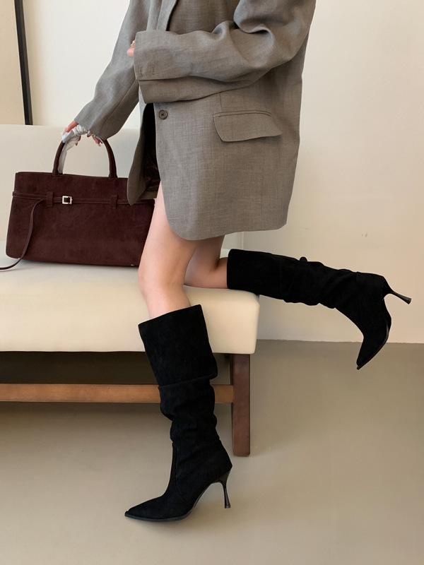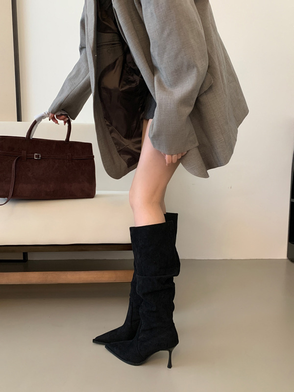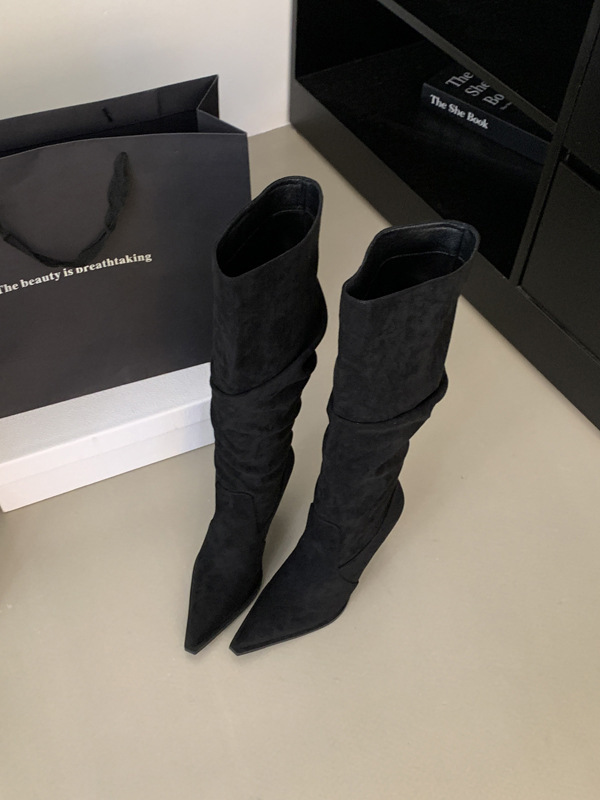 프랑스 스타일 섹시한 포인팅 스웨이드 플리츠 힙 부츠 2024 가을과 겨울 여성 벨트 버클 얇은 힐 하이 배럴 얇은 부츠스토어 가기