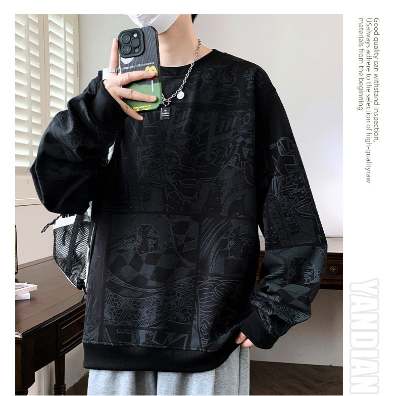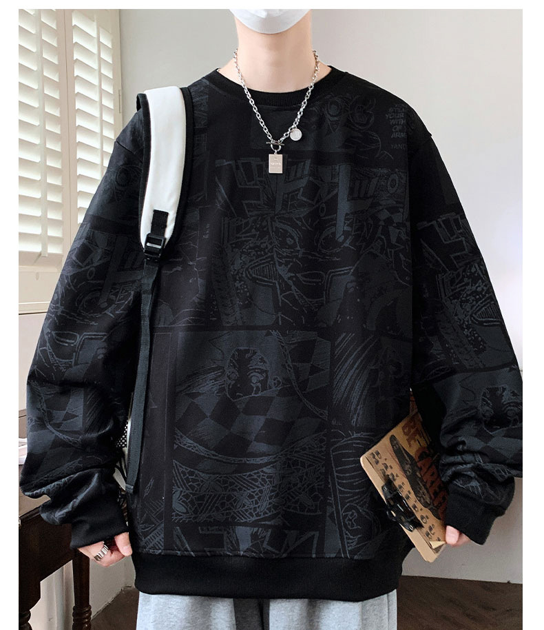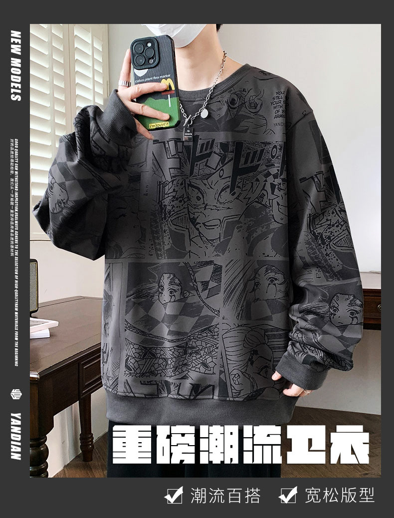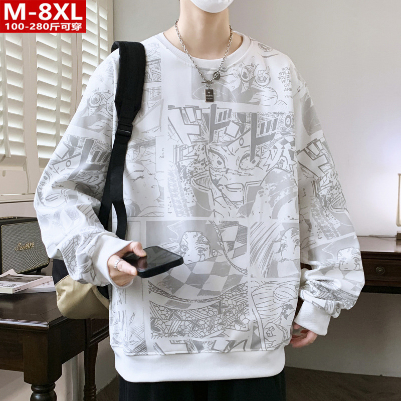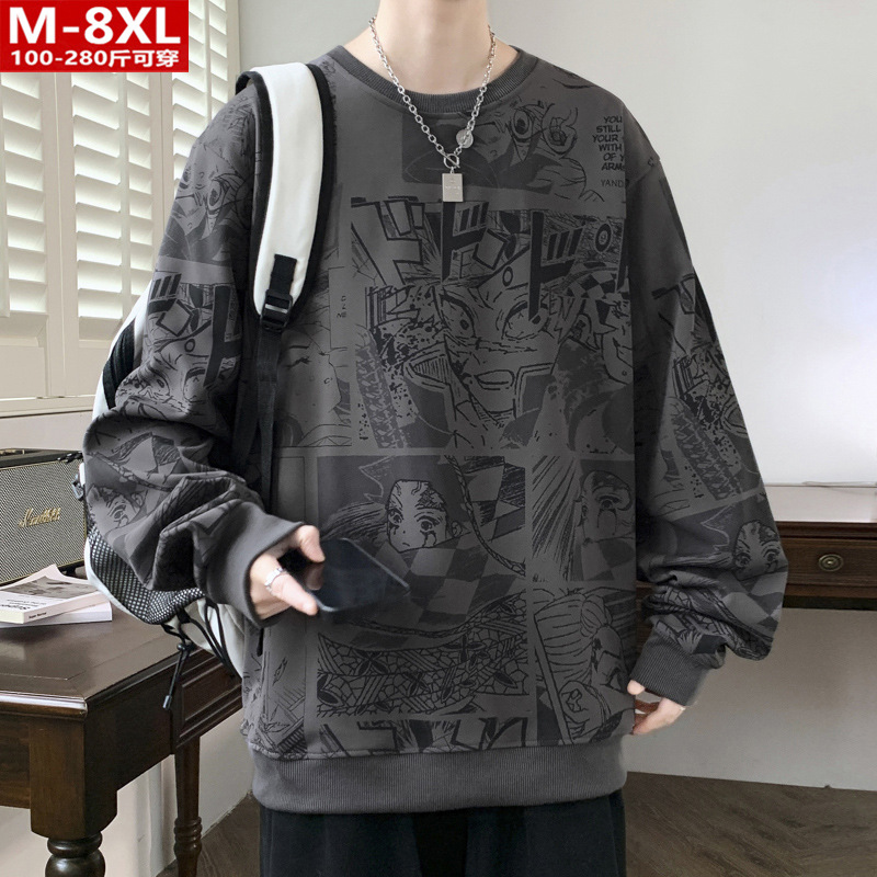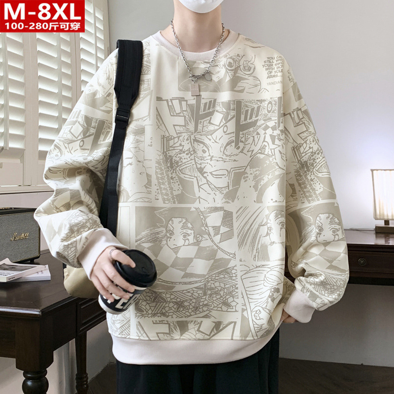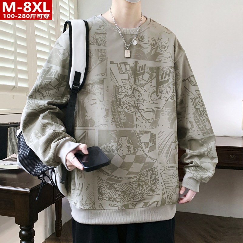 봄과 가을 트렌디 한 홍콩 스타일 남자의 인쇄 된 크루 넥 니트 스웨터 통통한 대형 플러스 사이즈 느슨한 스포츠 캐주얼 탑스토어 가기