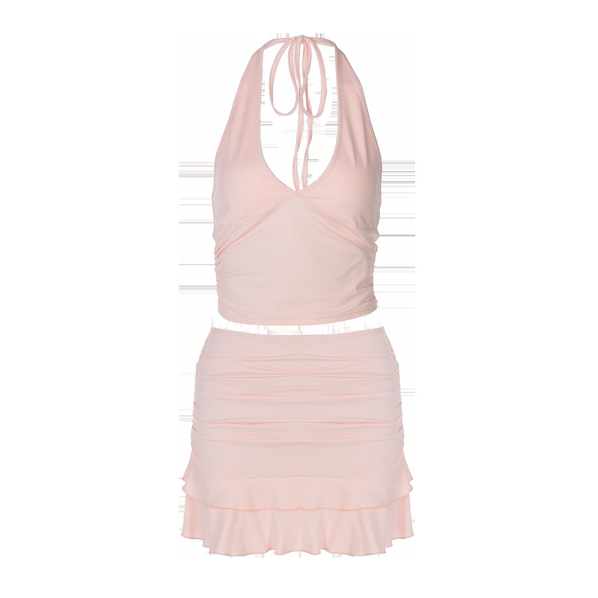유럽과 미국의 국경 간 섹시 V 넥 할로우 아웃 넥 조끼 타이트 울트라 짧은 솔리드 컬러 우드 이어 스커트 세트 투피스 세트스토어 가기