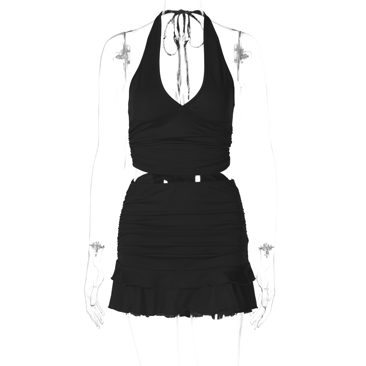 유럽과 미국의 국경 간 섹시 V 넥 할로우 아웃 넥 조끼 타이트 울트라 짧은 솔리드 컬러 우드 이어 스커트 세트 투피스 세트