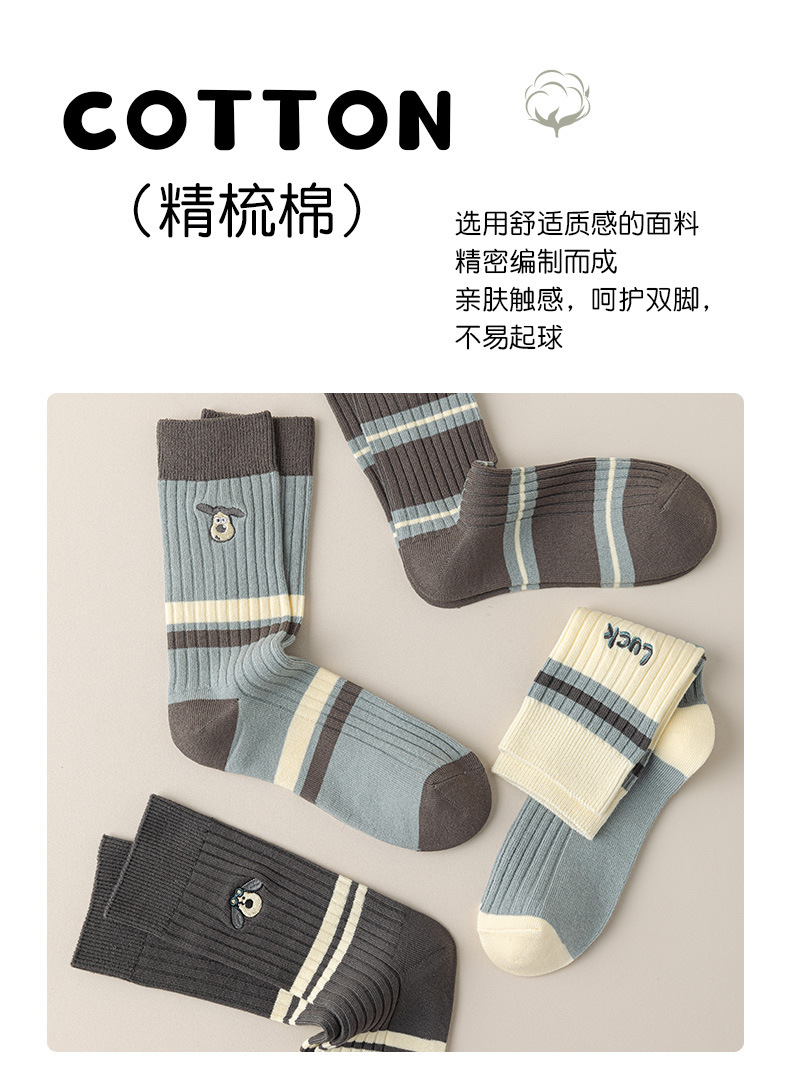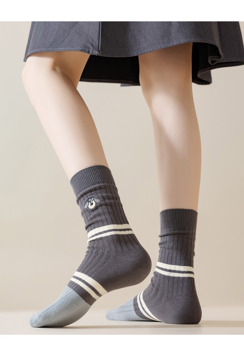 쌍 양말 여성 강아지 자수 그레이 블루 코튼 땀 흡수 통기성 스트라이프 미드 양말 가을 및 겨울 올 매치 여자 스타킹