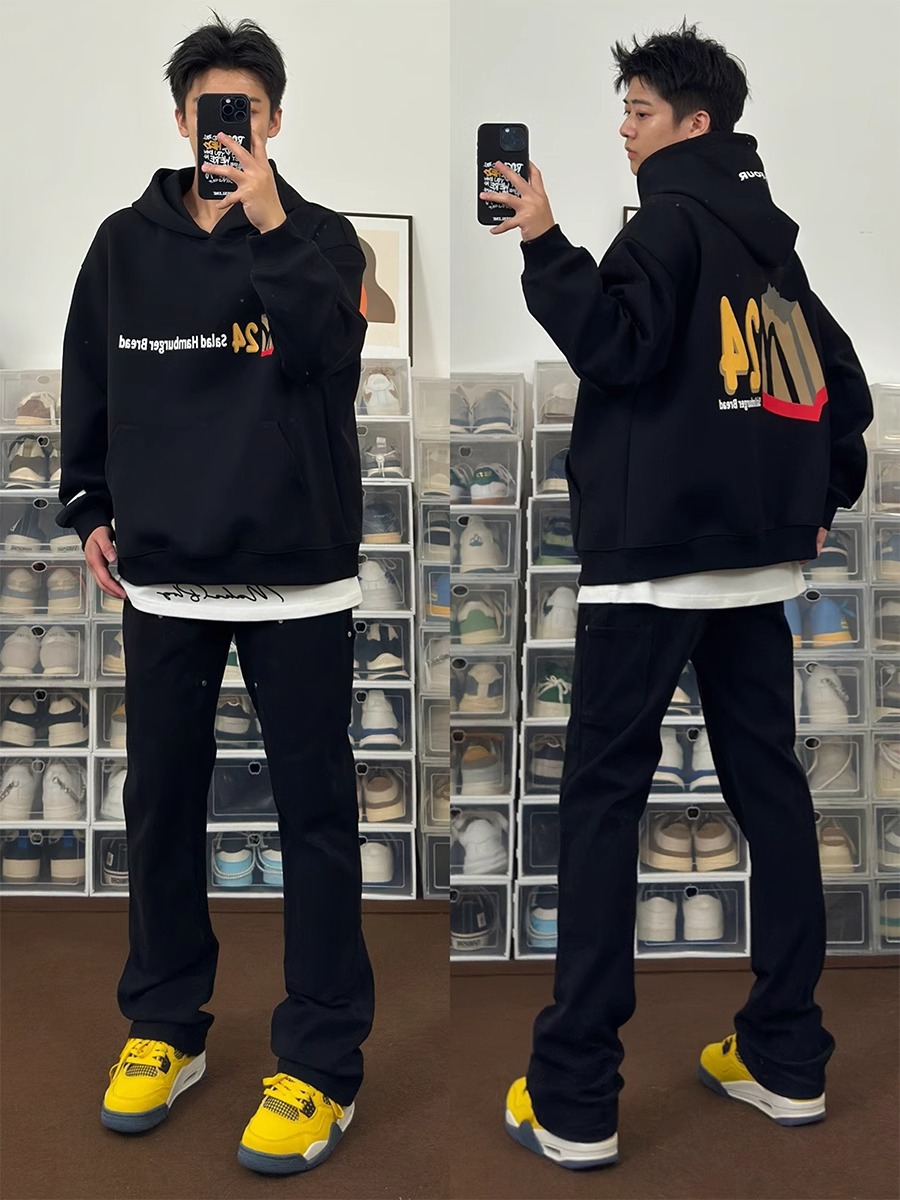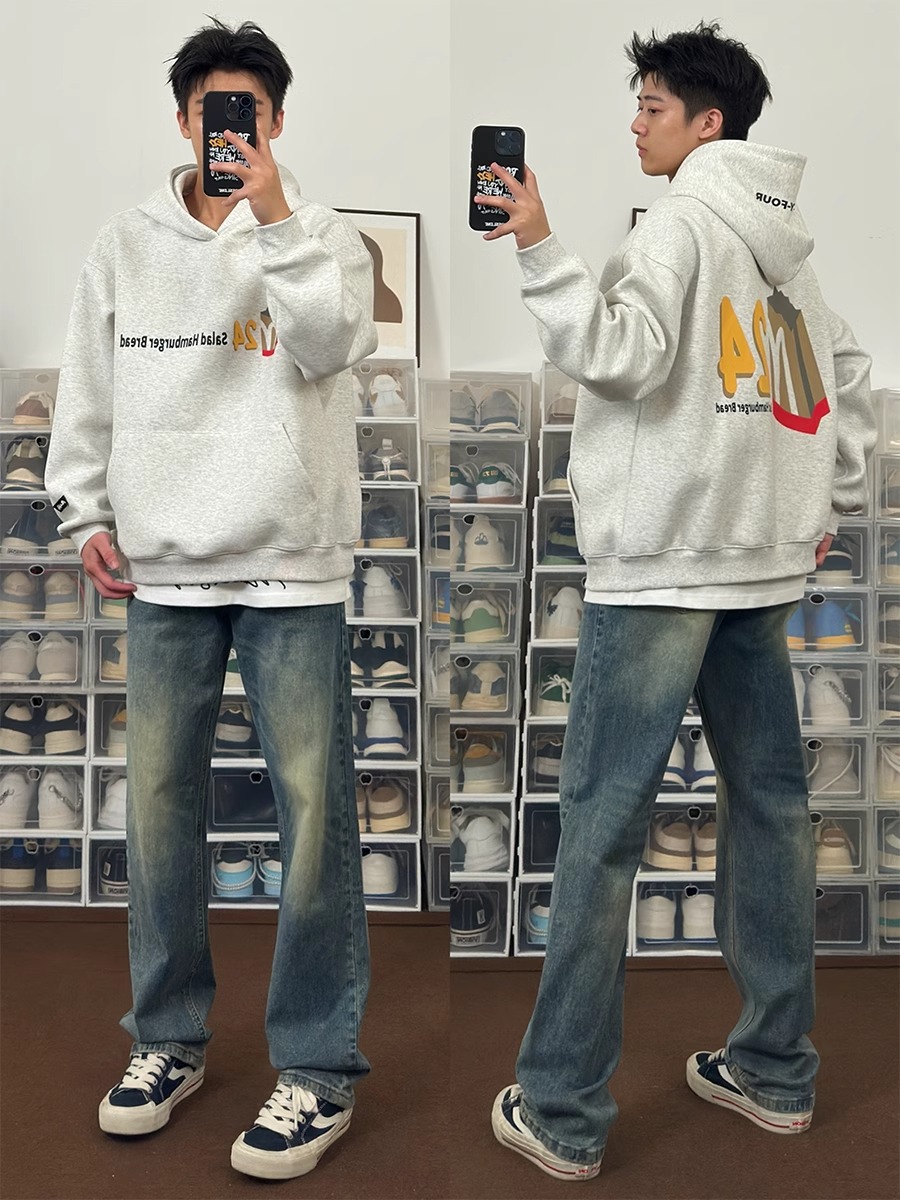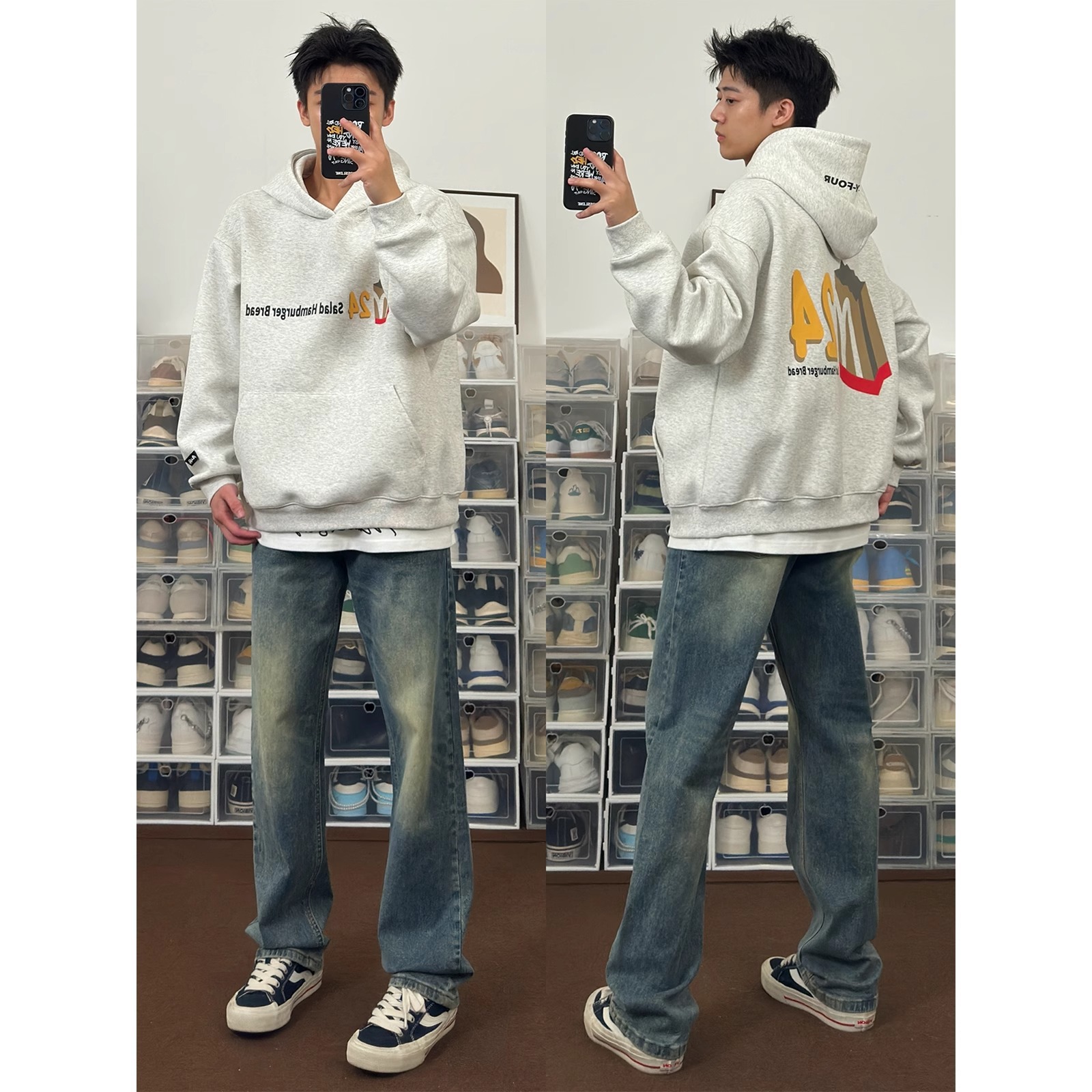 Guochao 하이 스트리트 레터 디자인 후드 스웨터 남자의 새로운 루즈 올 매치 후드 탑 2024 가을과 겨울