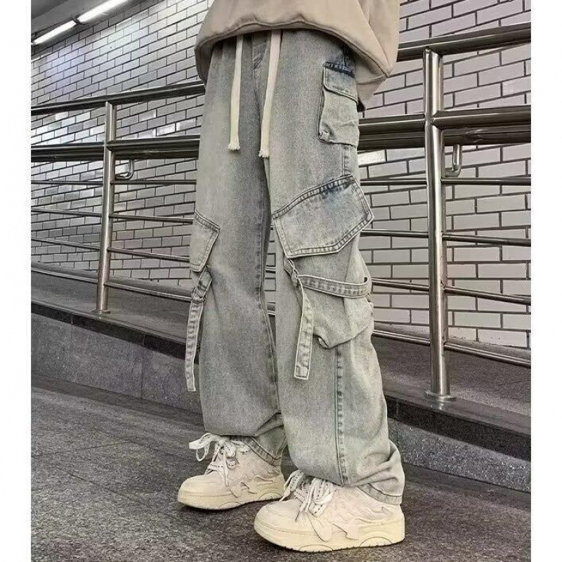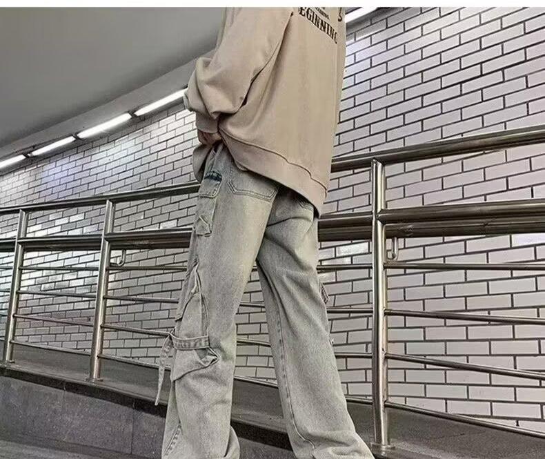 미국 스타일 작업 청바지 남성 여름 2024 새로운 패션 브랜드 하이 스트리트 스트레이트 바지 바이브 느슨한 넓은 다리 바지