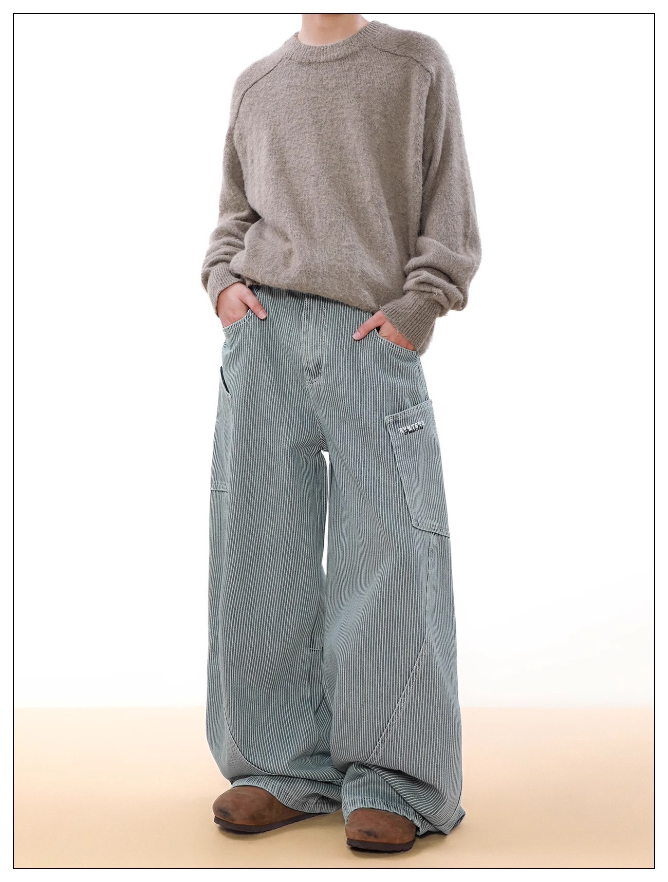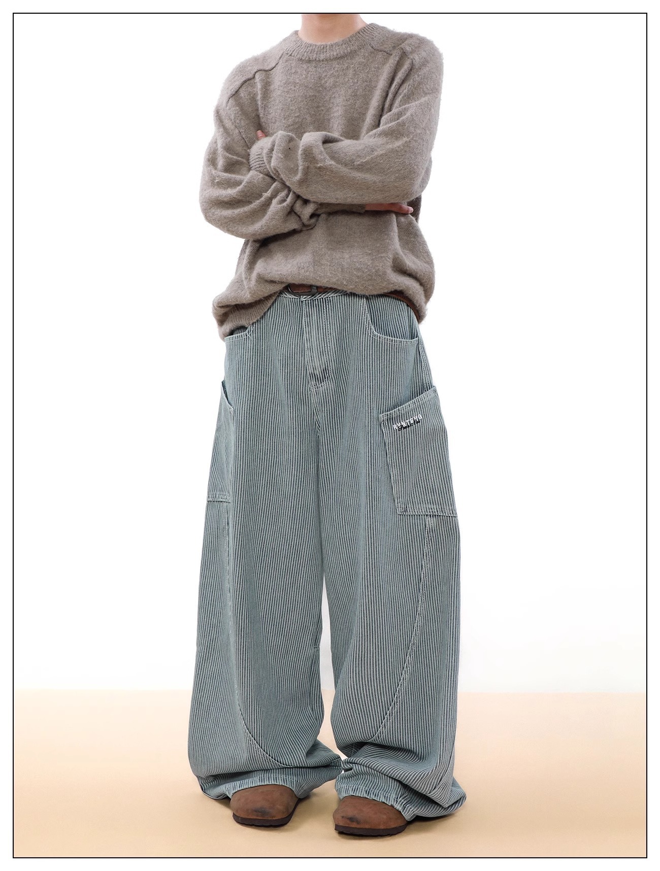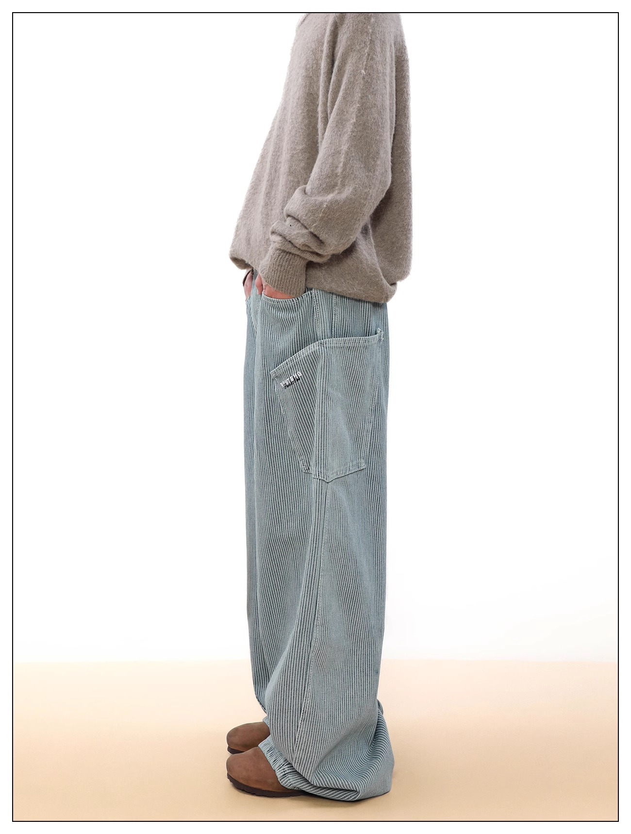 아메리칸 스타일 복고풍 편지 수 놓은 파란색 수직 줄무늬 청바지 남성 봄과 가을 새 커플의 캐주얼 와이드 다리 긴 바지스토어 가기