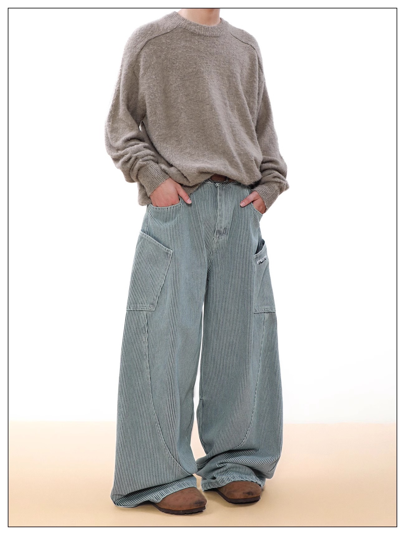 아메리칸 스타일 복고풍 편지 수 놓은 파란색 수직 줄무늬 청바지 남성 봄과 가을 새 커플의 캐주얼 와이드 다리 긴 바지
