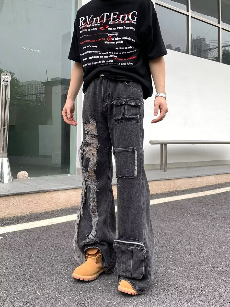 레트로 아메리칸 스타일 구식 리핑 청바지 남성 멀티 포켓 디자인 센스 루즈 캐주얼 하이 스트리트 올 매치 바지