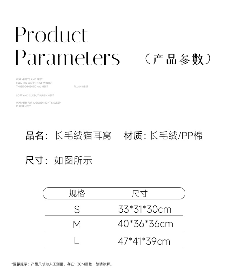 长毛猫耳窝克重:小号-S: 430g左右, 中号-M: 580g左右, 大号L: 722g左右